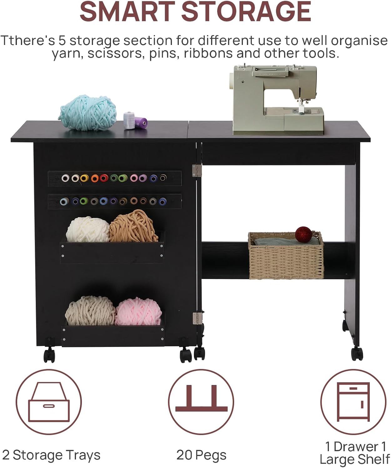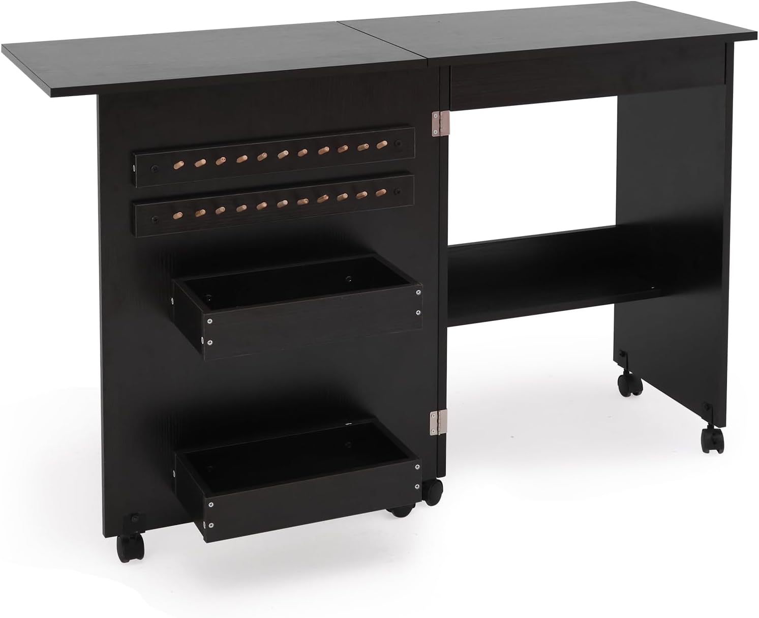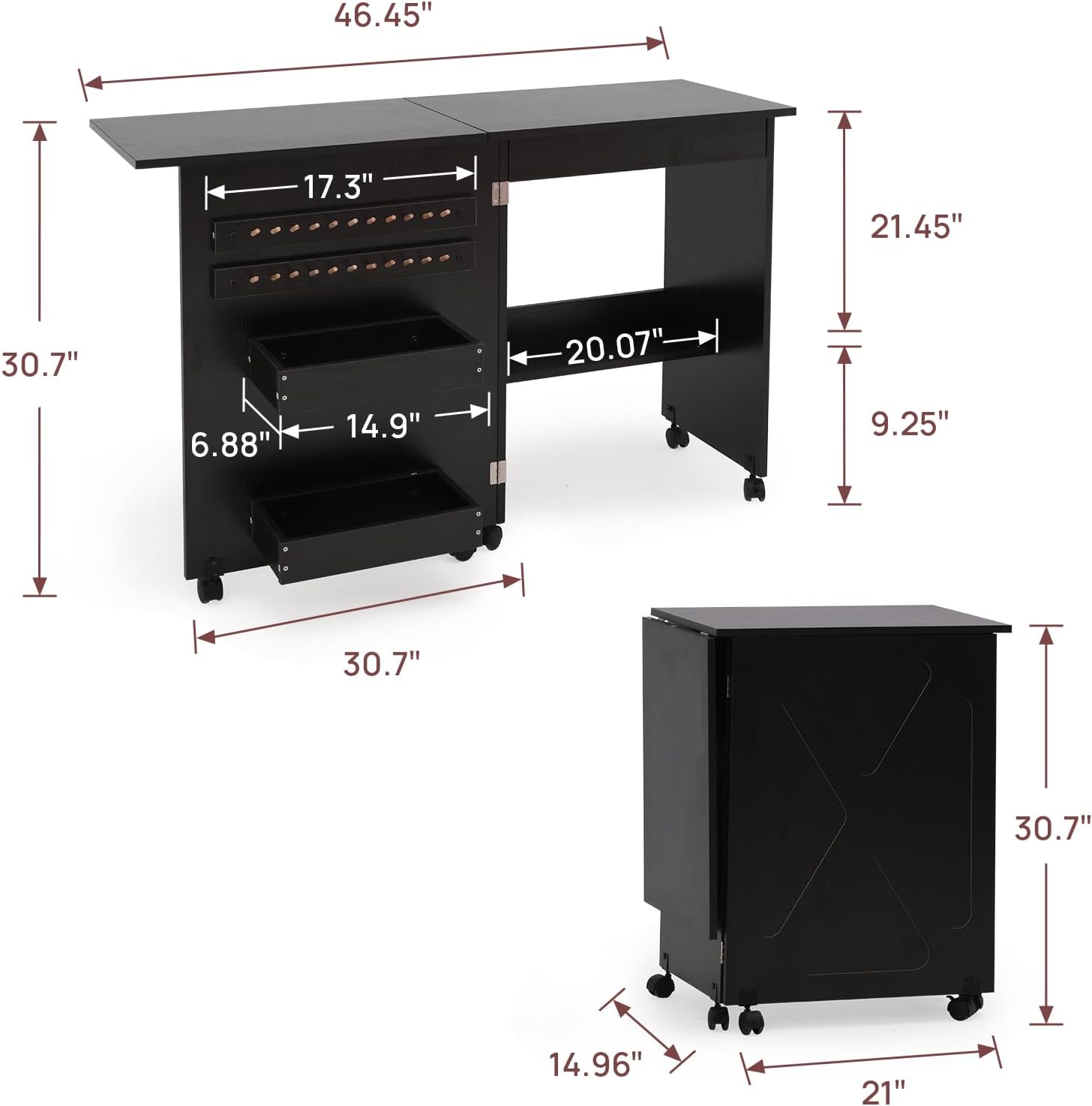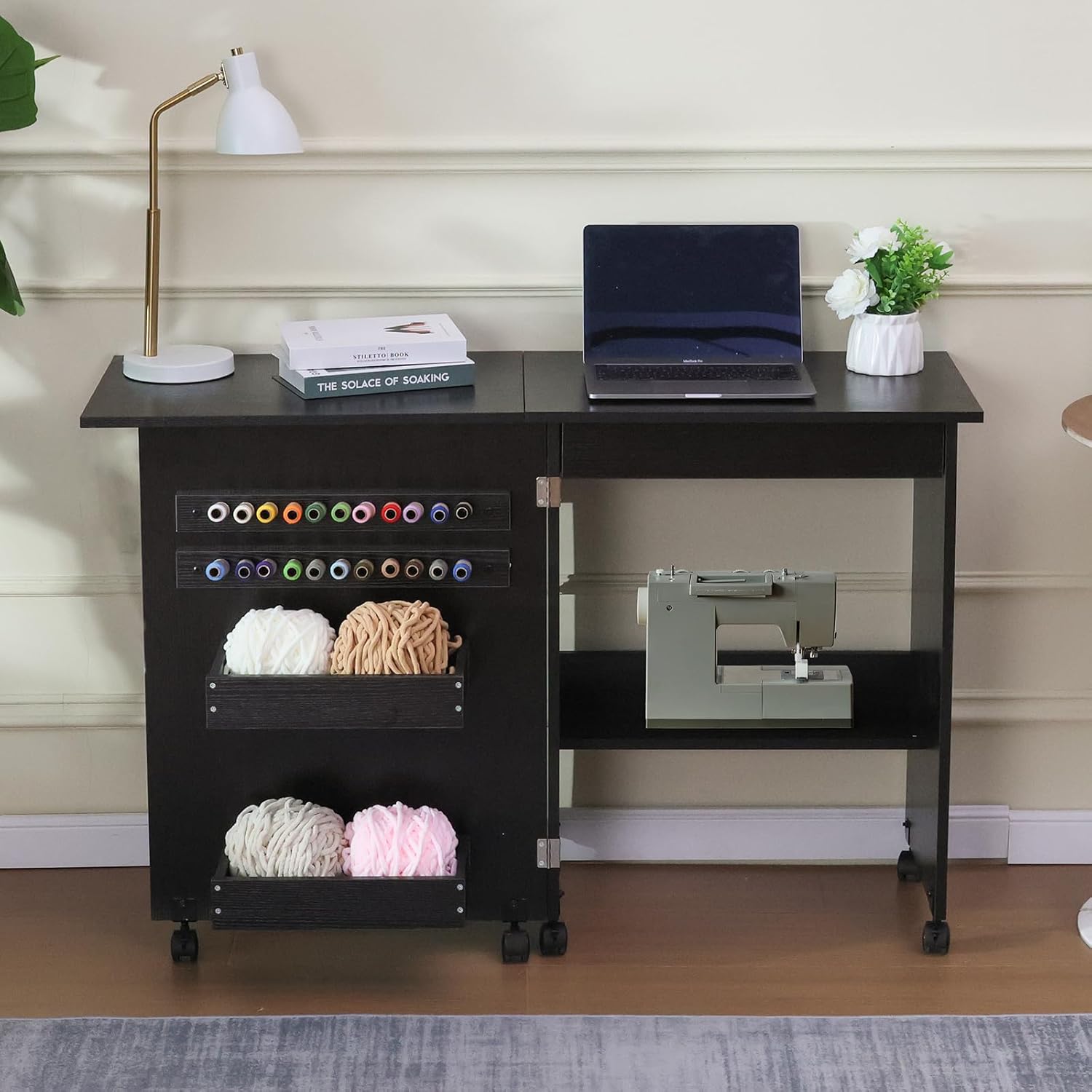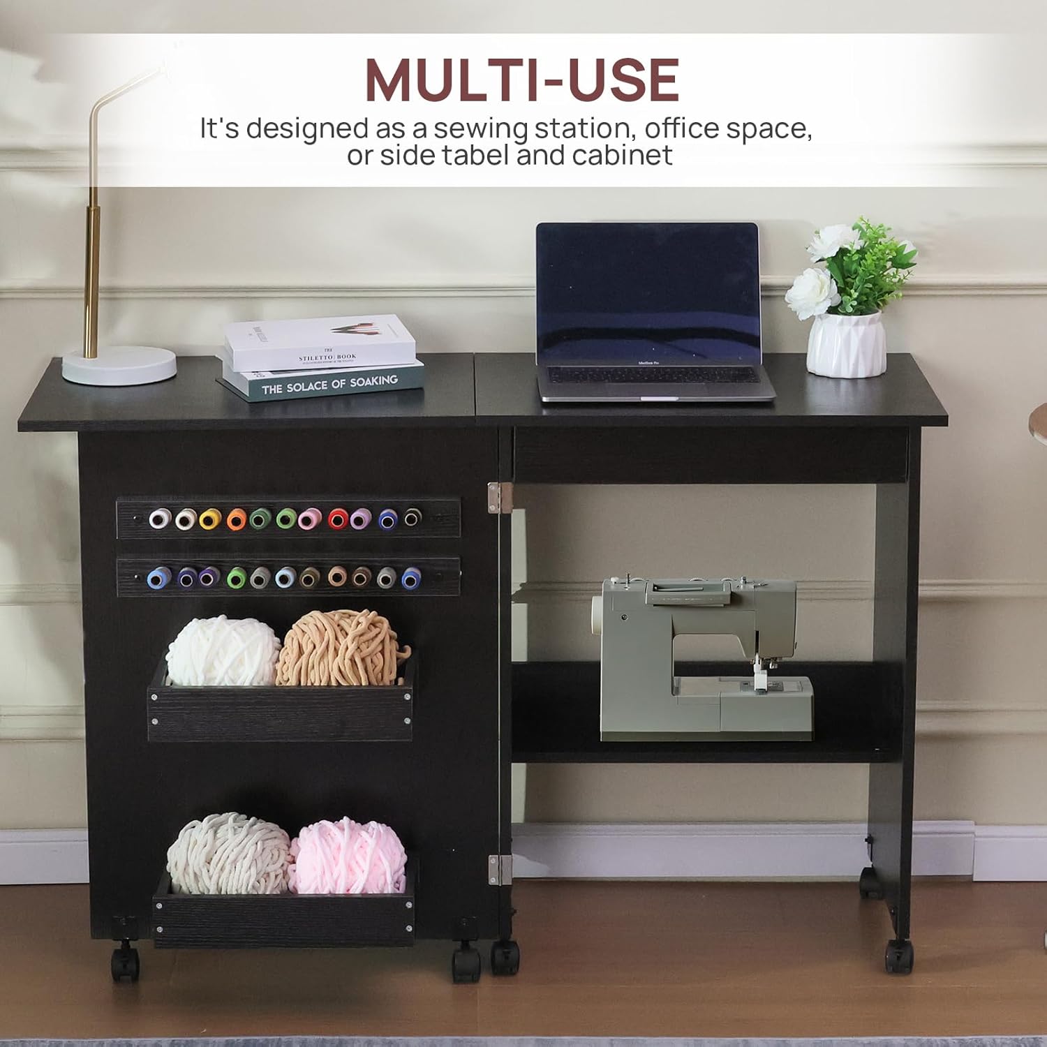 Folding Sewing Table Multipurpose Craft Station & Side Desk with Compact Design, Wheels with Locks,(Dark Brown)