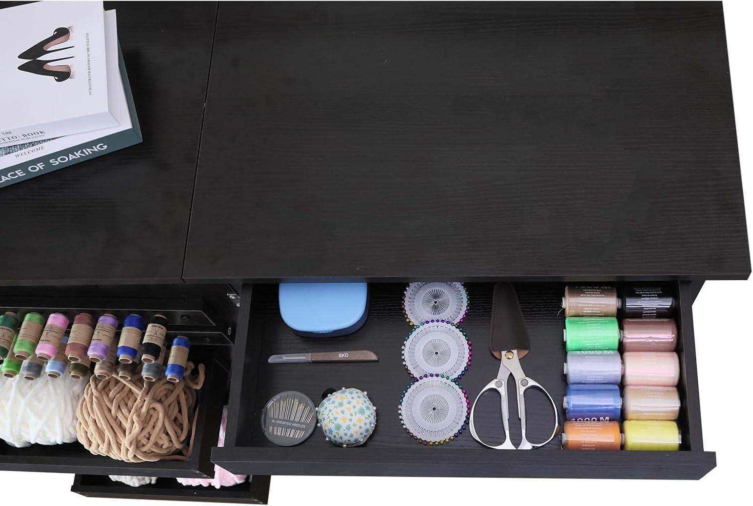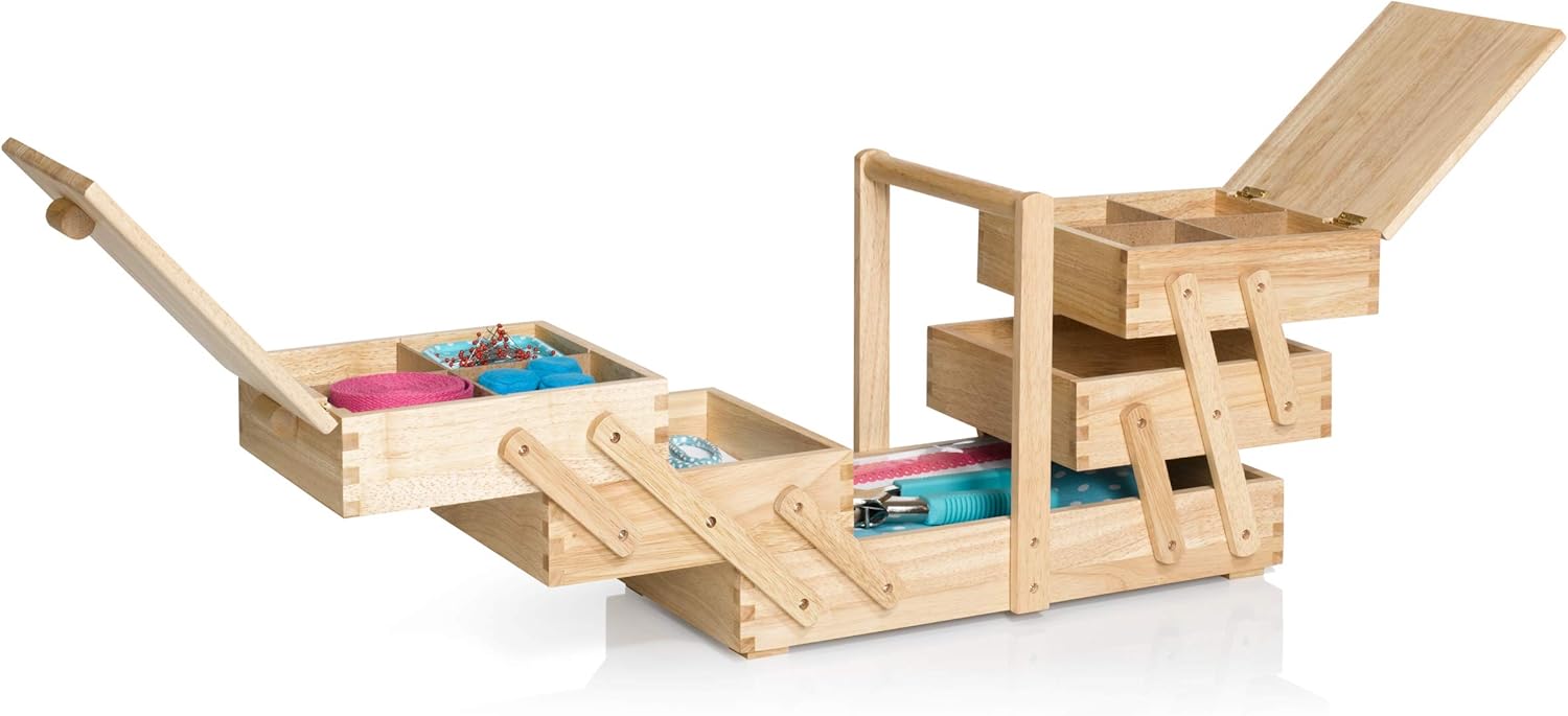 Wooden Sewing Box Organizer for Sewing Supplies,Sewing Crafting Hobby Storage Box, 3 Tier Drawers for Craft Tools, Needles Assorted