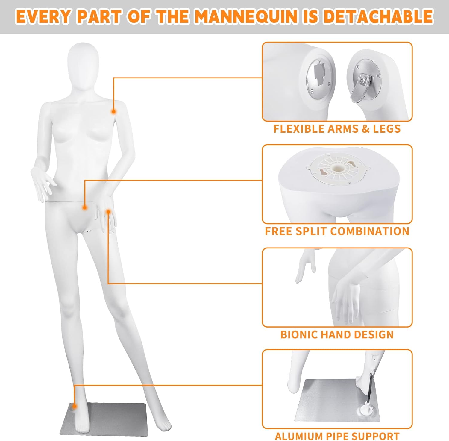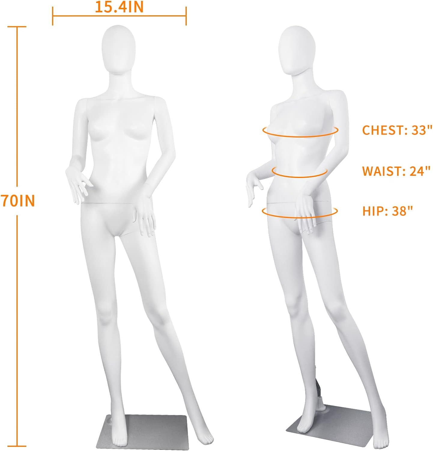 SubSun Female Full Body Mannequin Dress Form White 70 Inches Adjustable Detachable Realistic Standing Plastic Model with Metal Base Mannequin Head Rotatable Pendulum