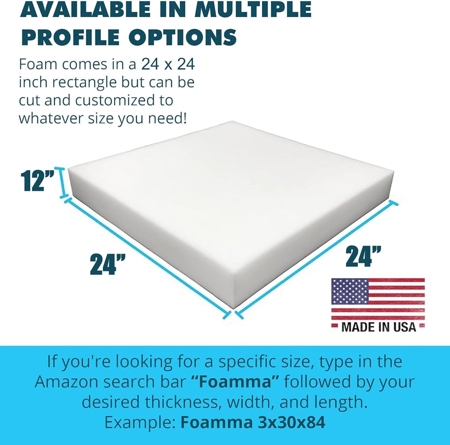 Foamma High Density Upholstery Foam, 12" x 24" x 24" - Couch Cushion Foam Replacement Pad, High Density Pad for Seats, Pillows, Chairs, and Craft Projects