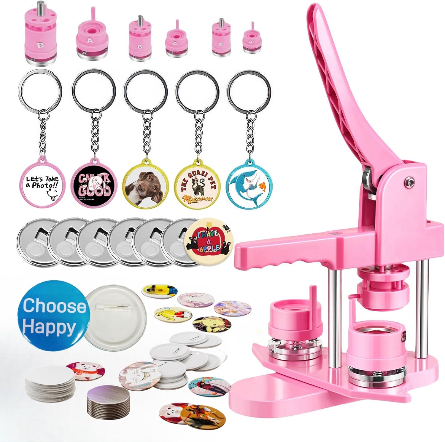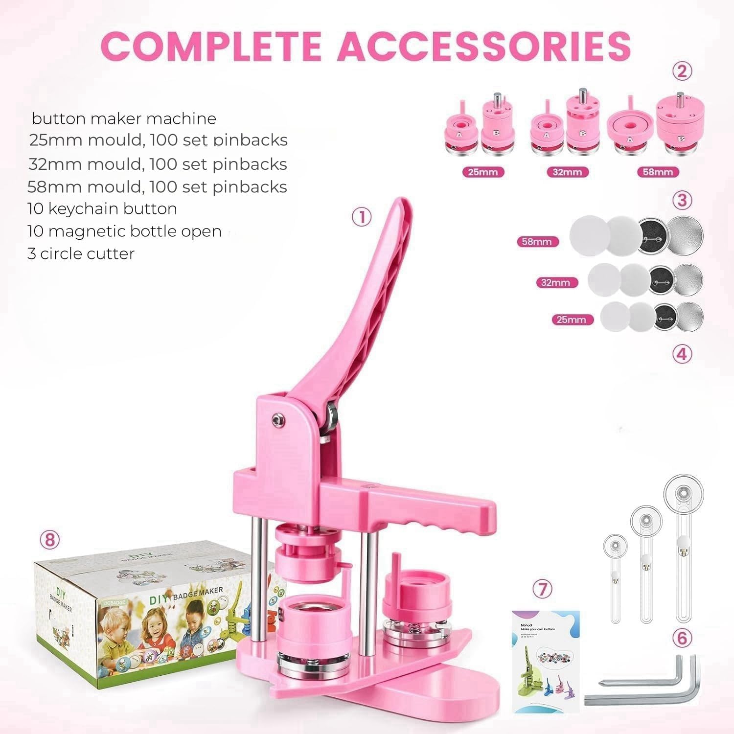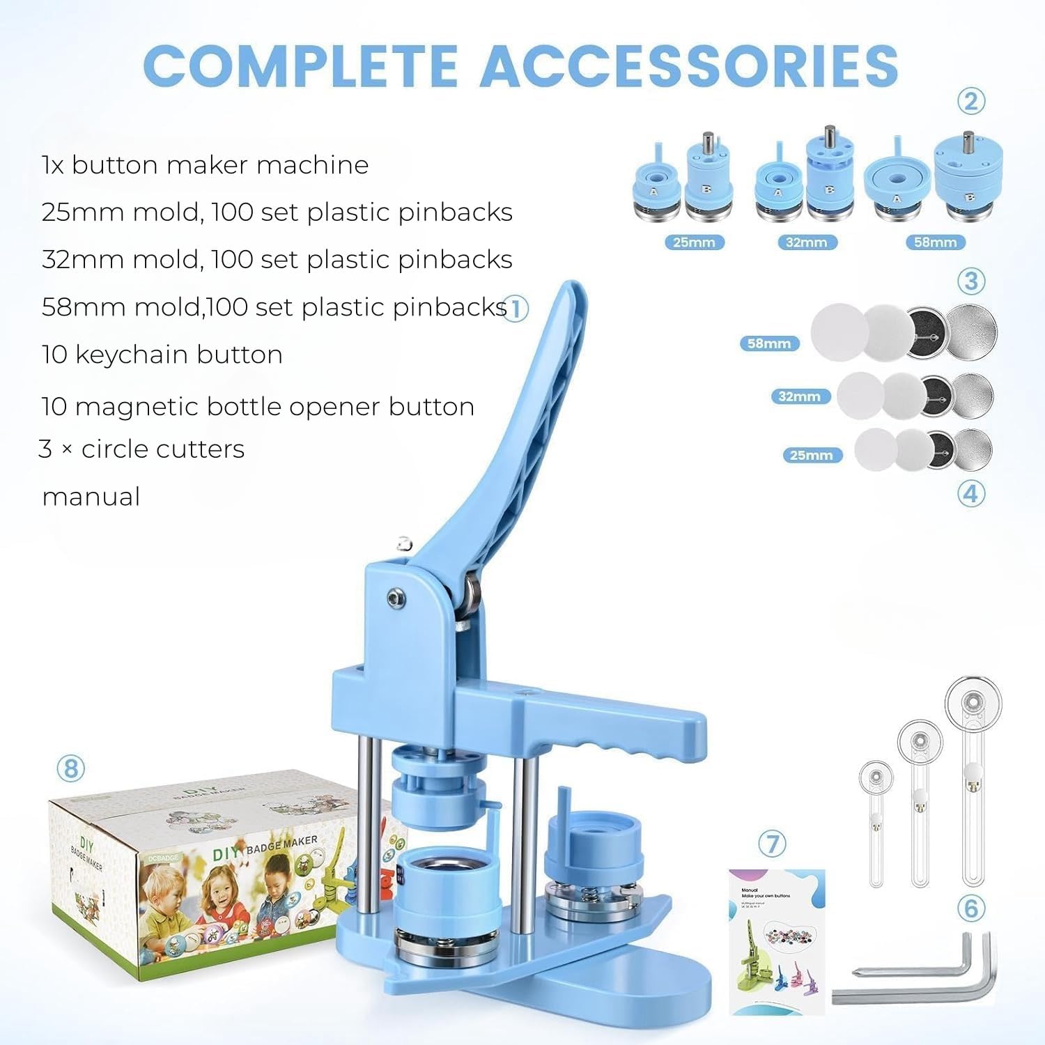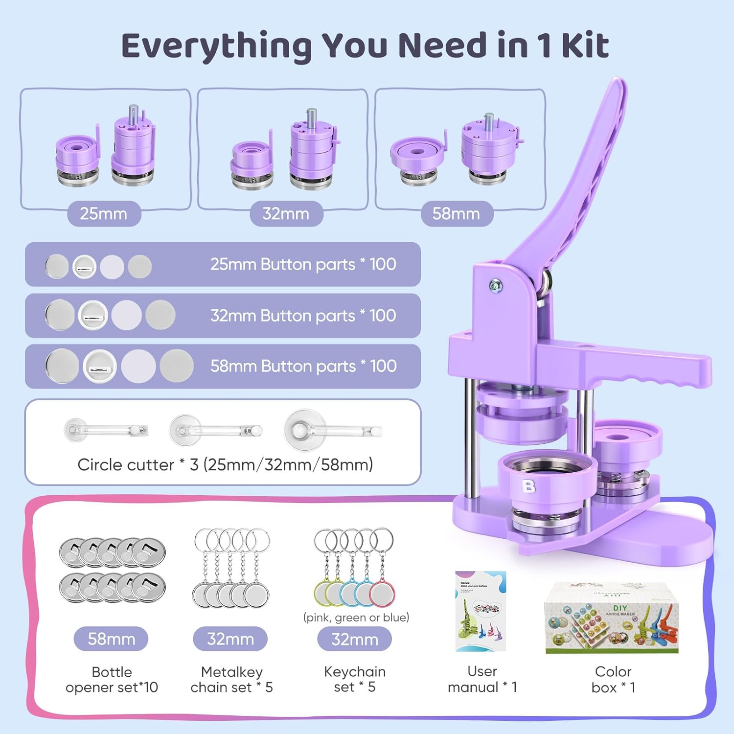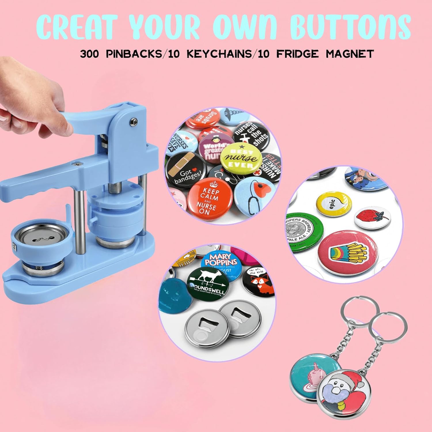 Button Maker Machine Multiple Sizes, 25mm+32mm+58mm Pin Maker Button Press Machine W/300 Pinback Making Supplies, 10 Keychain 10 Bottle Opener Badges