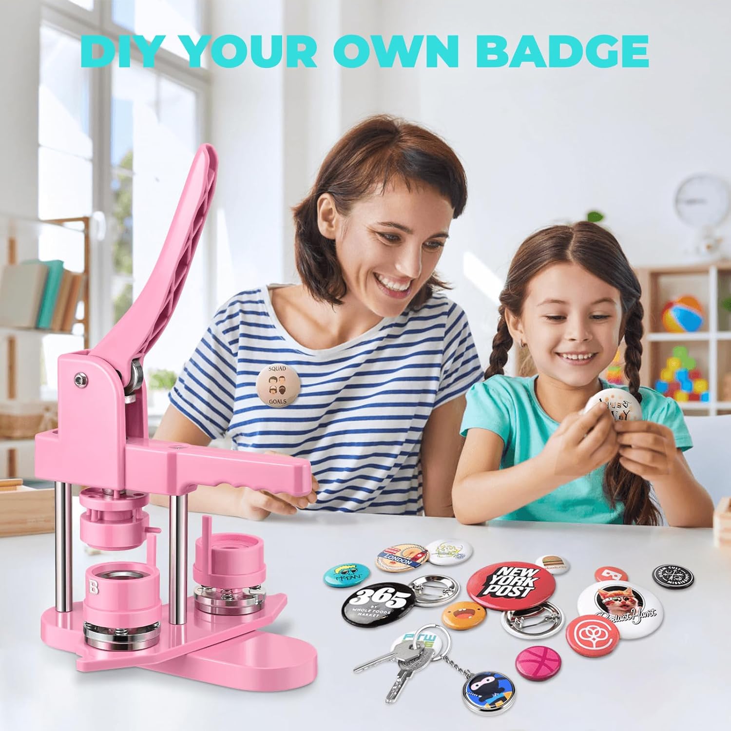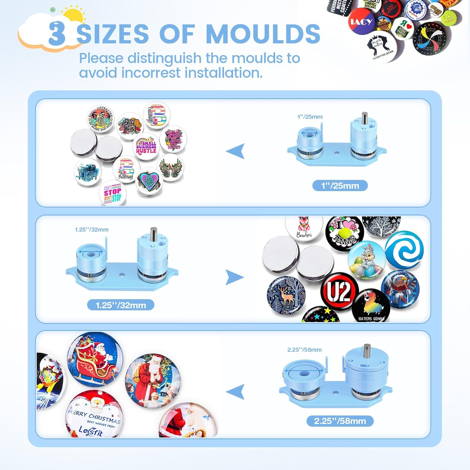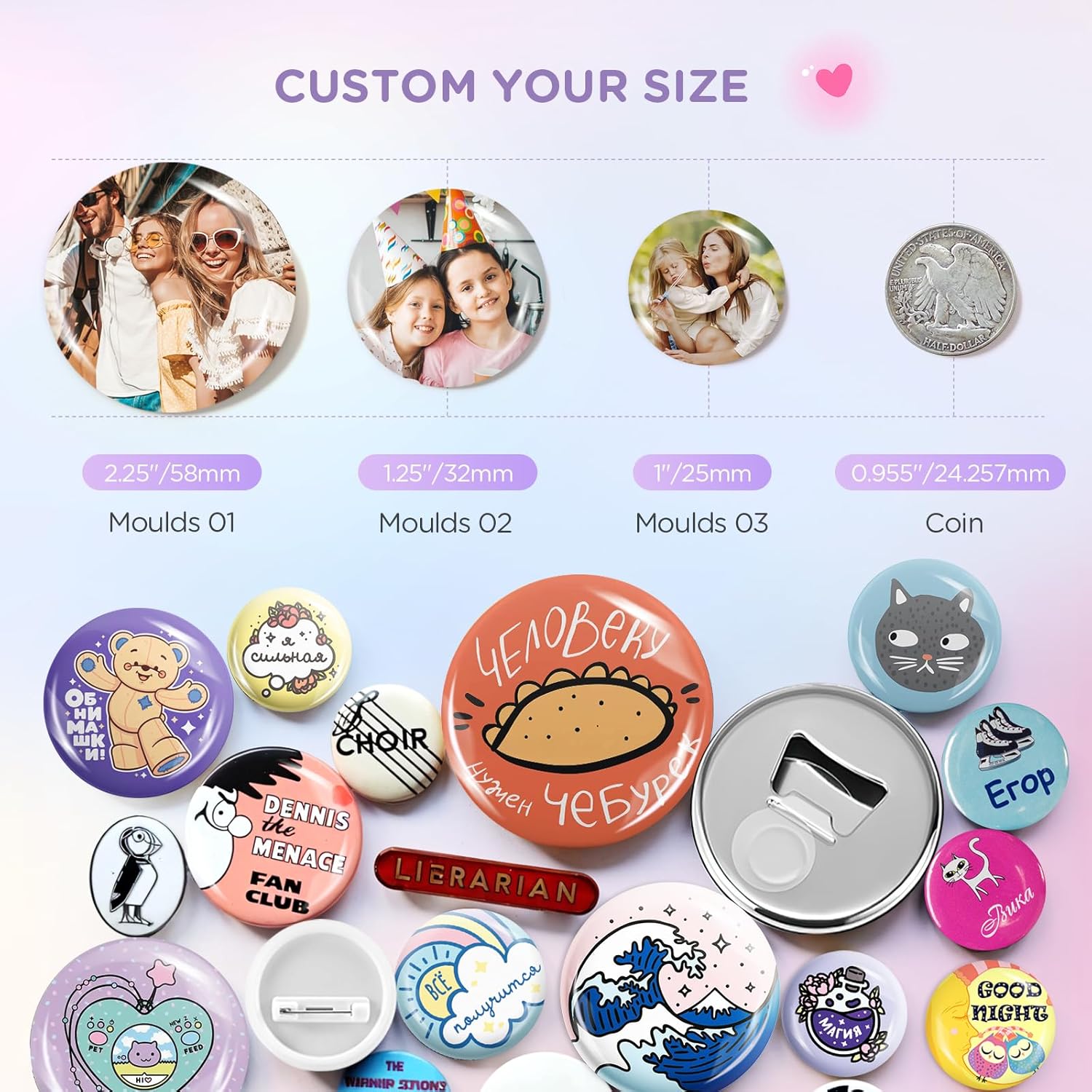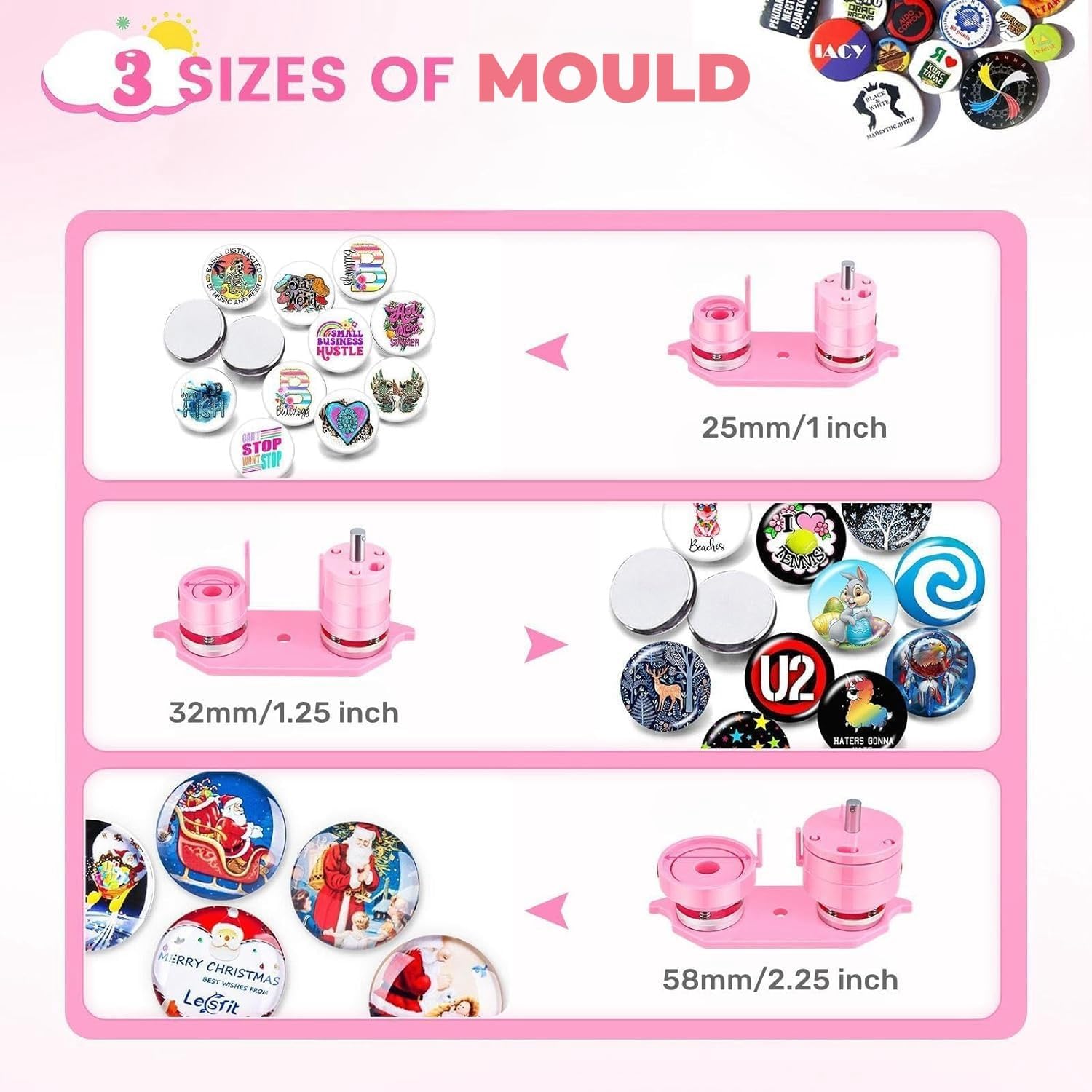 Button Maker Machine Multiple Sizes, 25mm+32mm+58mm Pin Maker Button Press Machine W/300 Pinback Making Supplies, 10 Keychain 10 Bottle Opener Badges