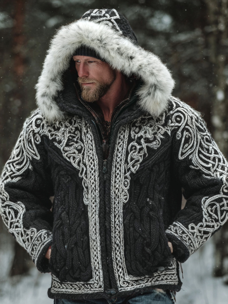 Men's Vintage Viking Celtic Knot Art Chunky Knit Hooded Zip-up Sweater