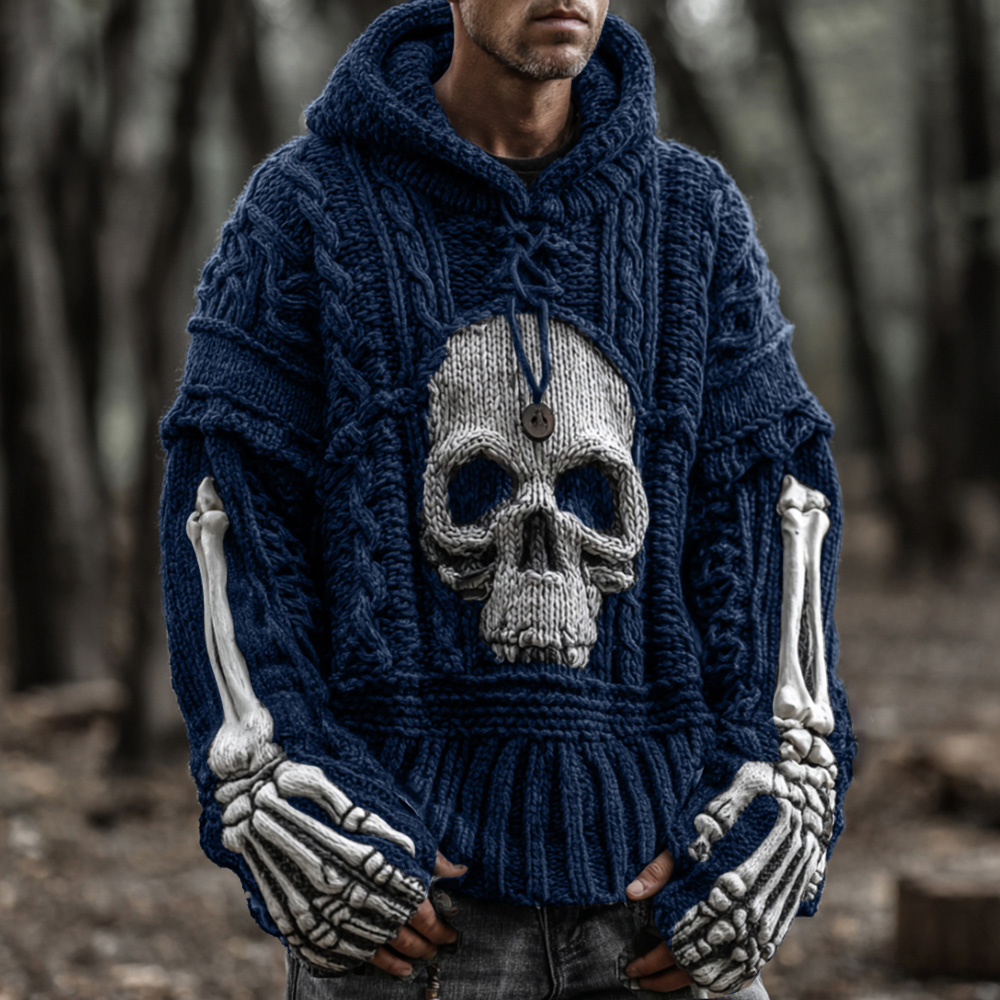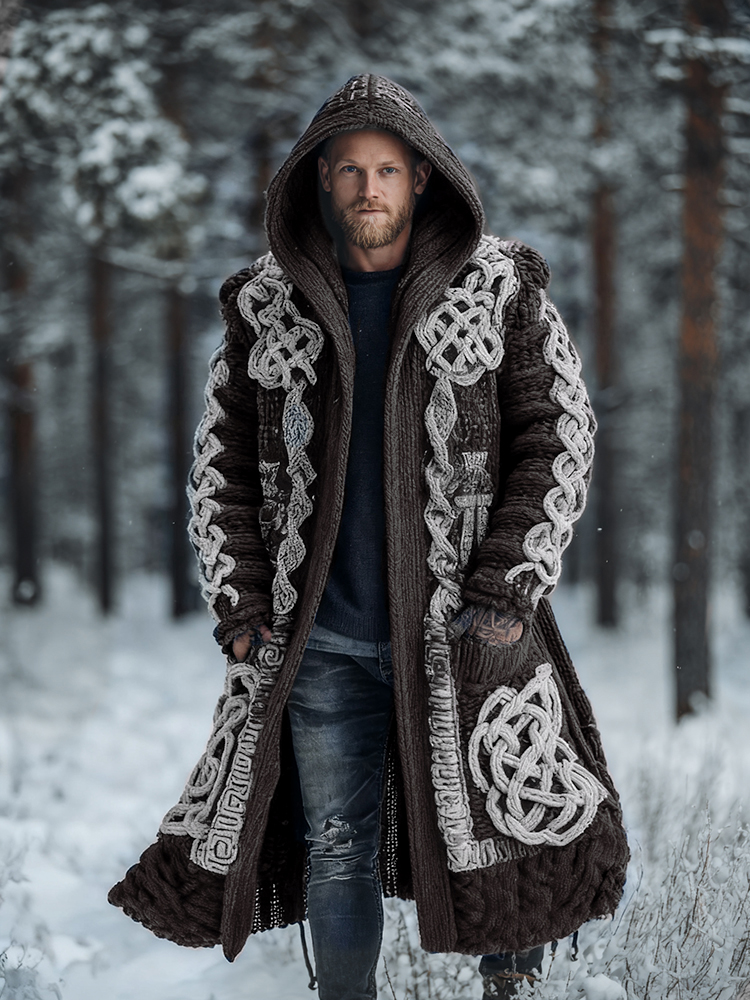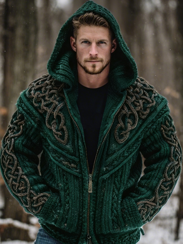 Men's Vintage Viking Celtic Knot Art Chunky Knit Hooded Zip-up Sweater