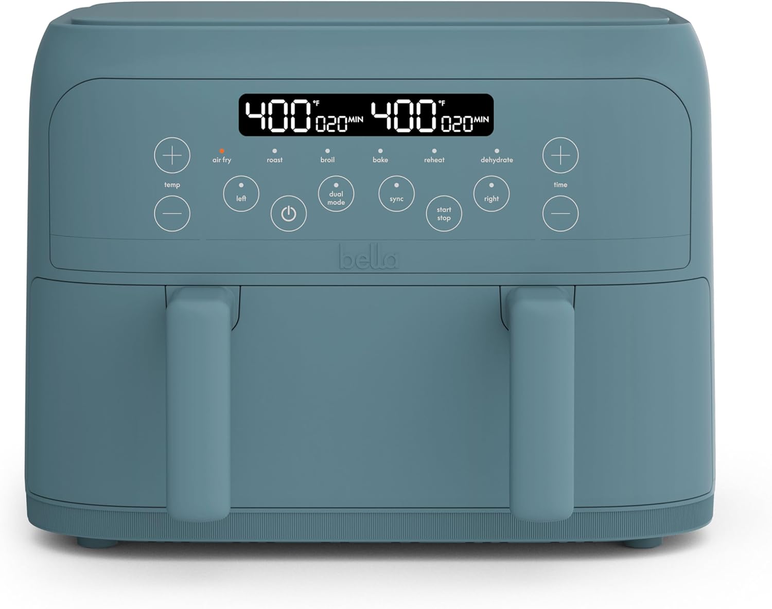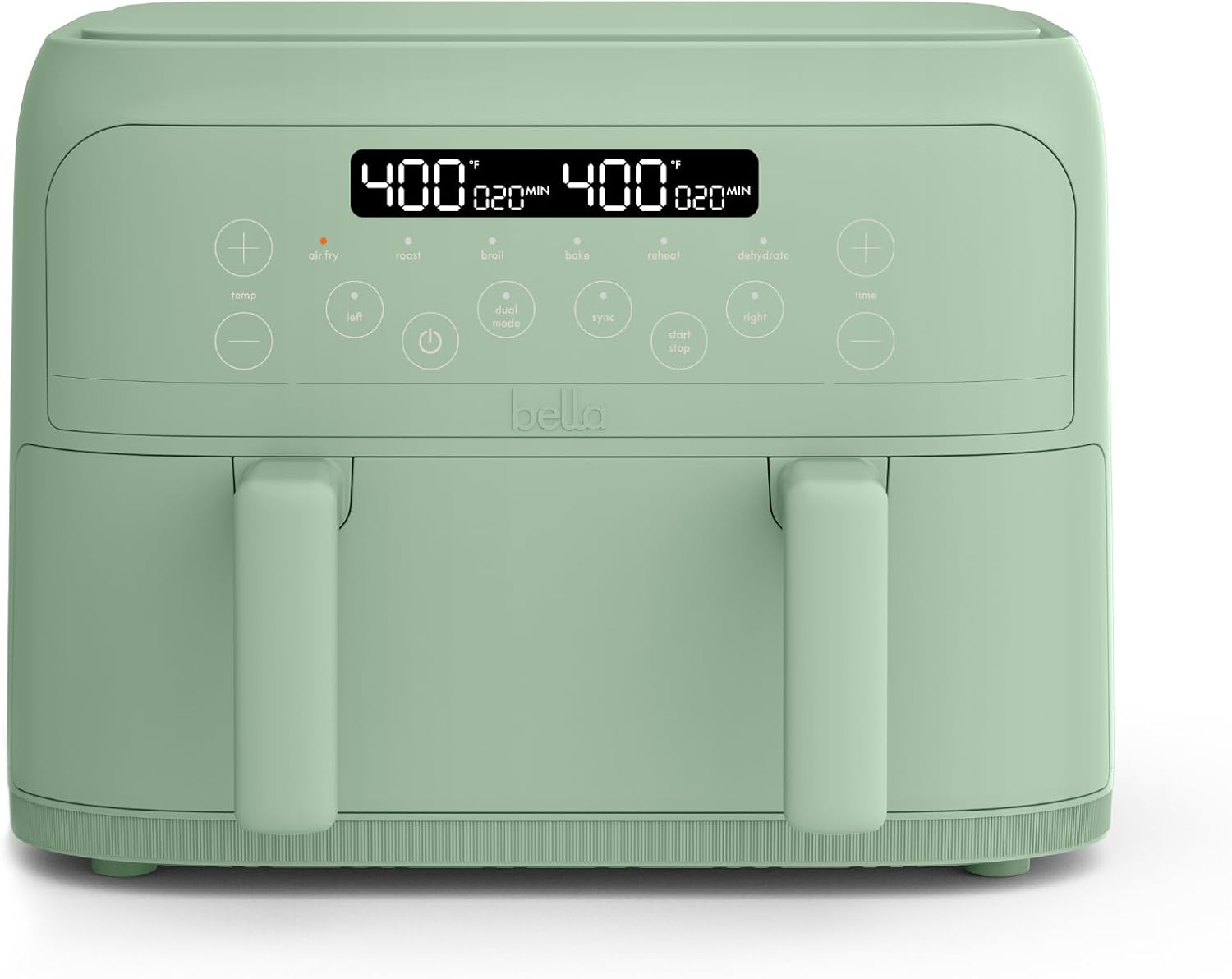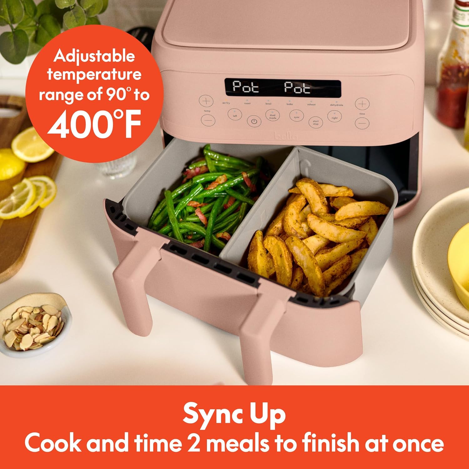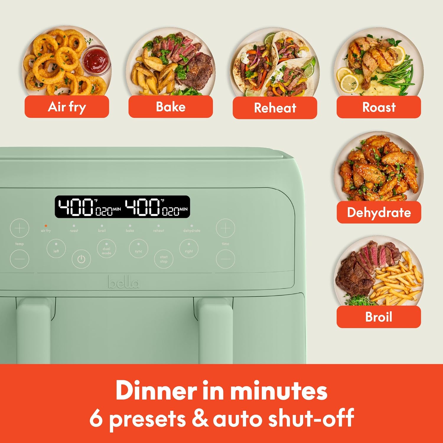 bella 4 Qt TriZone Air Fryer, EverGood™ Ceramic Nonstick Coating, Dual Basket Design w Removable Divider, Digital Touchscreen Control w 6 Preset Cooking Options, 1200 Watt, 3lb Capacity, Oatmilk
