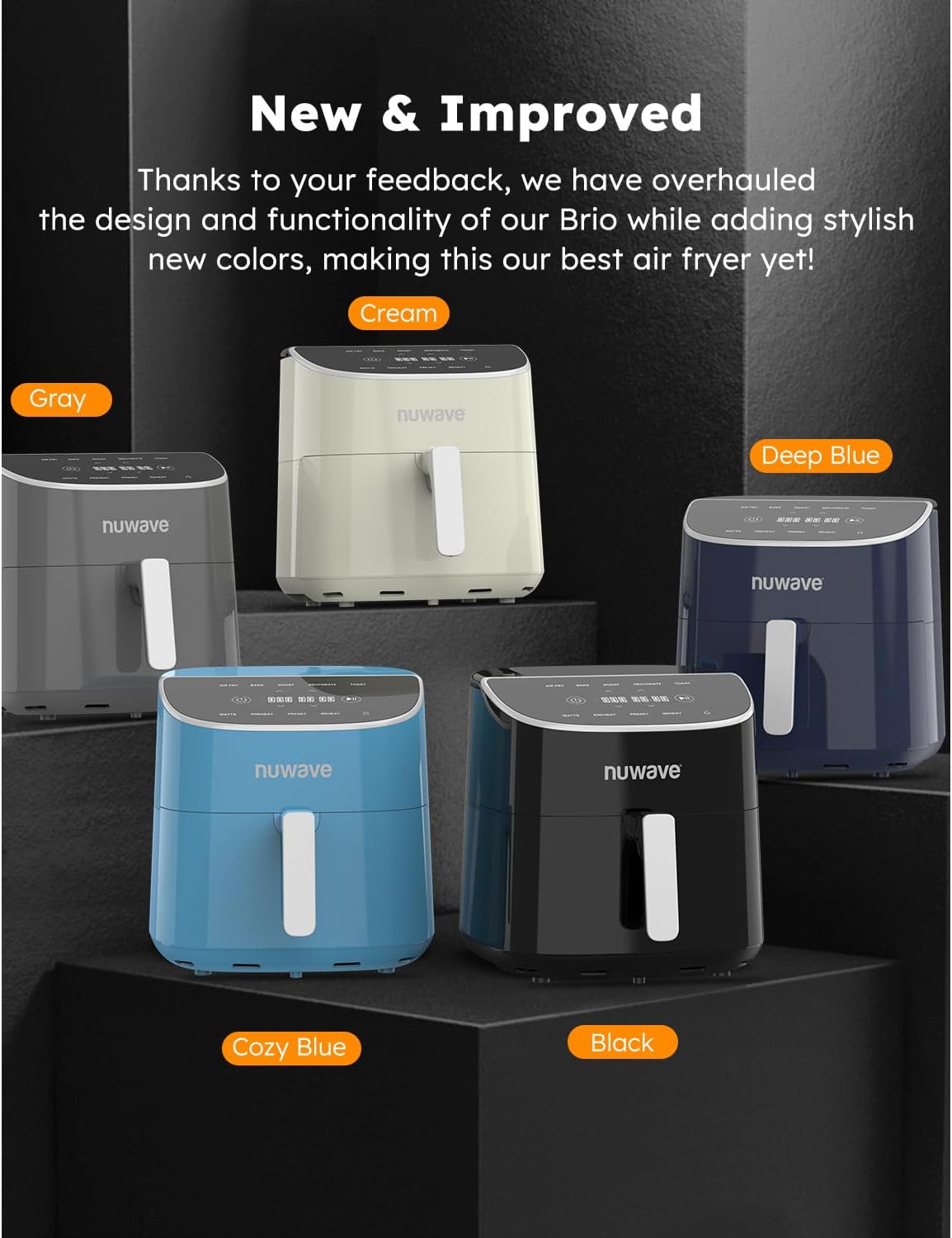 Nuwave Brio Plus 8 Qt Air Fryer, PFAS Free, New & Improved, Digital Touch Screen, Cool White Display, 50°F~400°F in Precise 5°, 5 Cook Functions, 100 Presets & 50 Memory, 3 Wattages 700, 1500, 1800