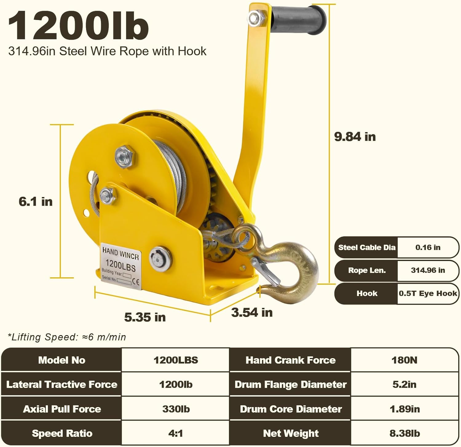 Heavy Duty Hand Winch - 2-Way Self-Locking with Automatic Brake, Compact Manual Winch for Boat Trailers & Trucks, Easy to Use & Control (1200bls 8 m Rope+Hook)