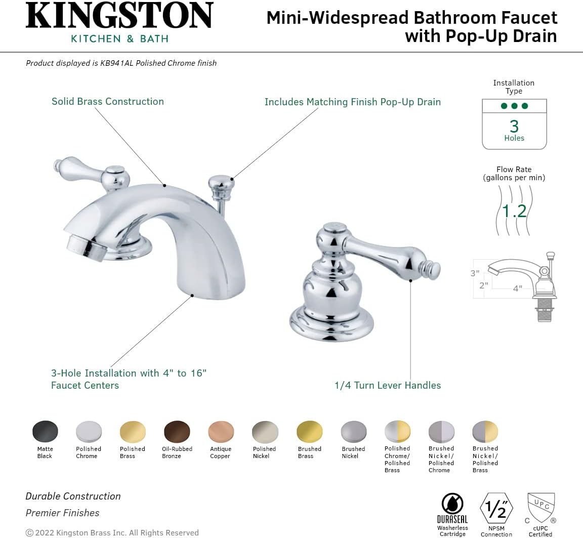 Kingston Brass KB941AL Victorian Mini Widespread Lavatory Faucet with Metal lever handle, Polished Chrome