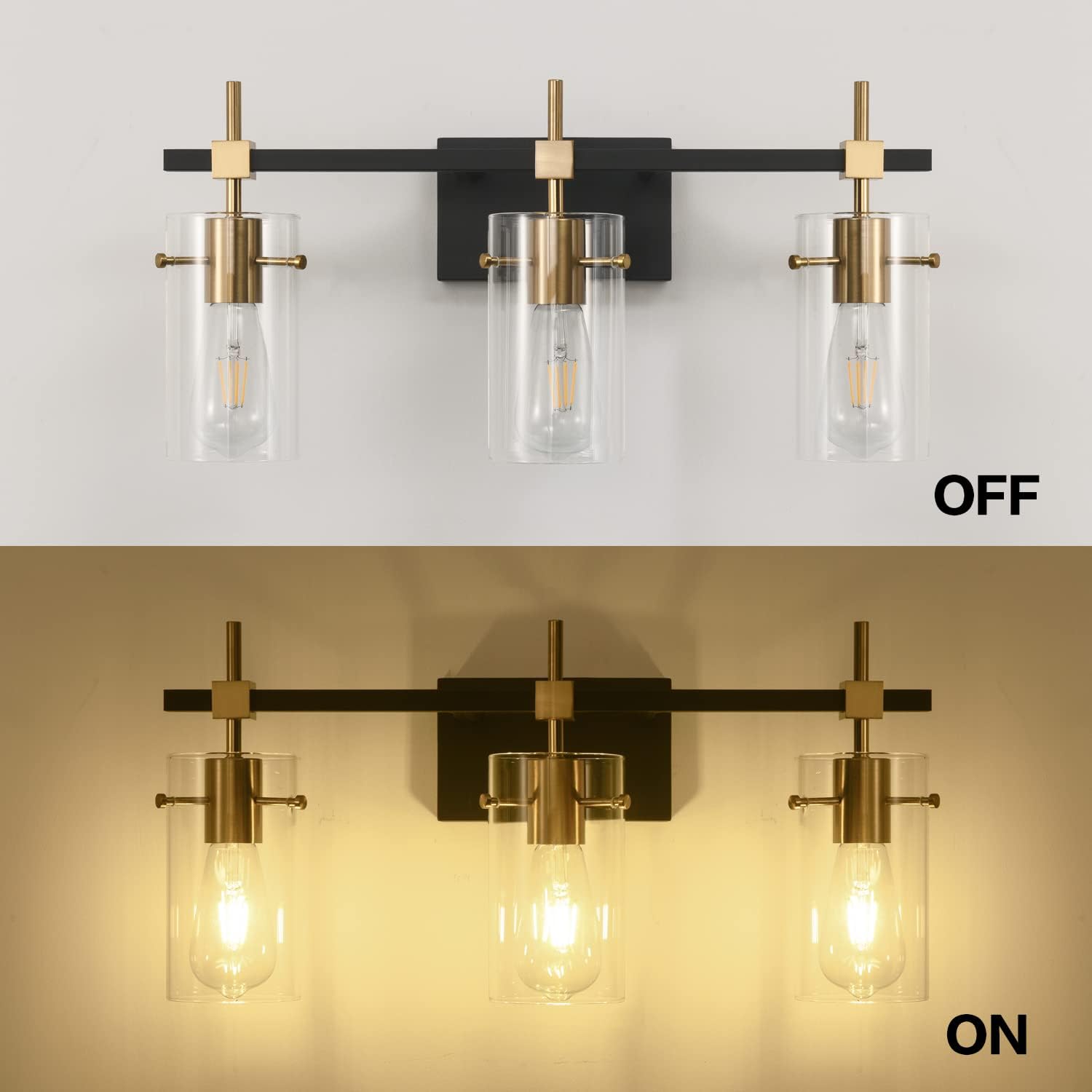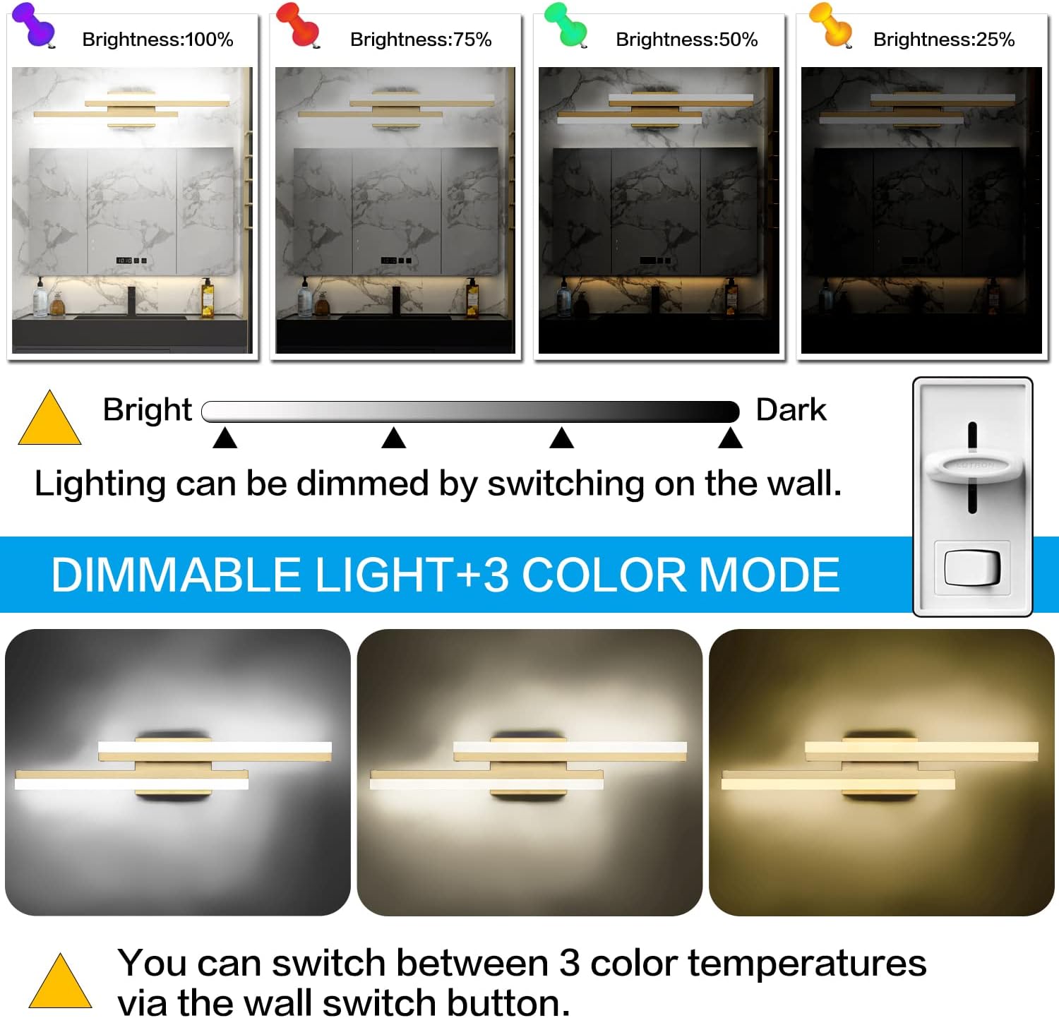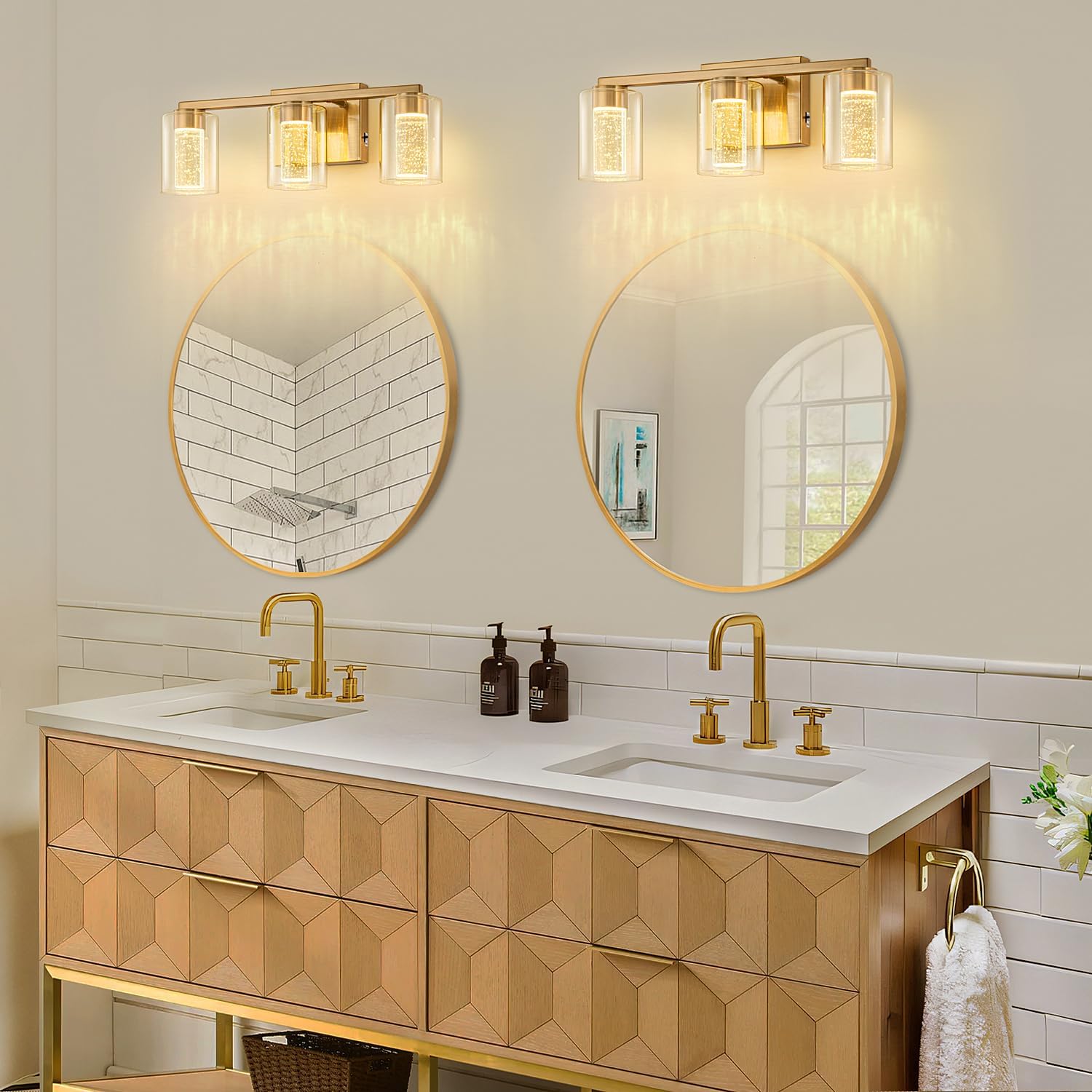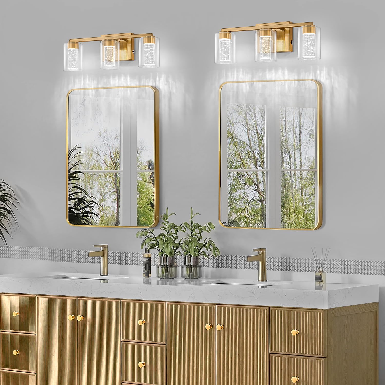 SineRise 3-Light Gold Vanity Light with 3 Color Modes (3000K/4000K/6000K), Eye Protection LED Bathroom Light Fixture, Dimmable Modern Wall Light Over Mirror with Clear Glass Shade
