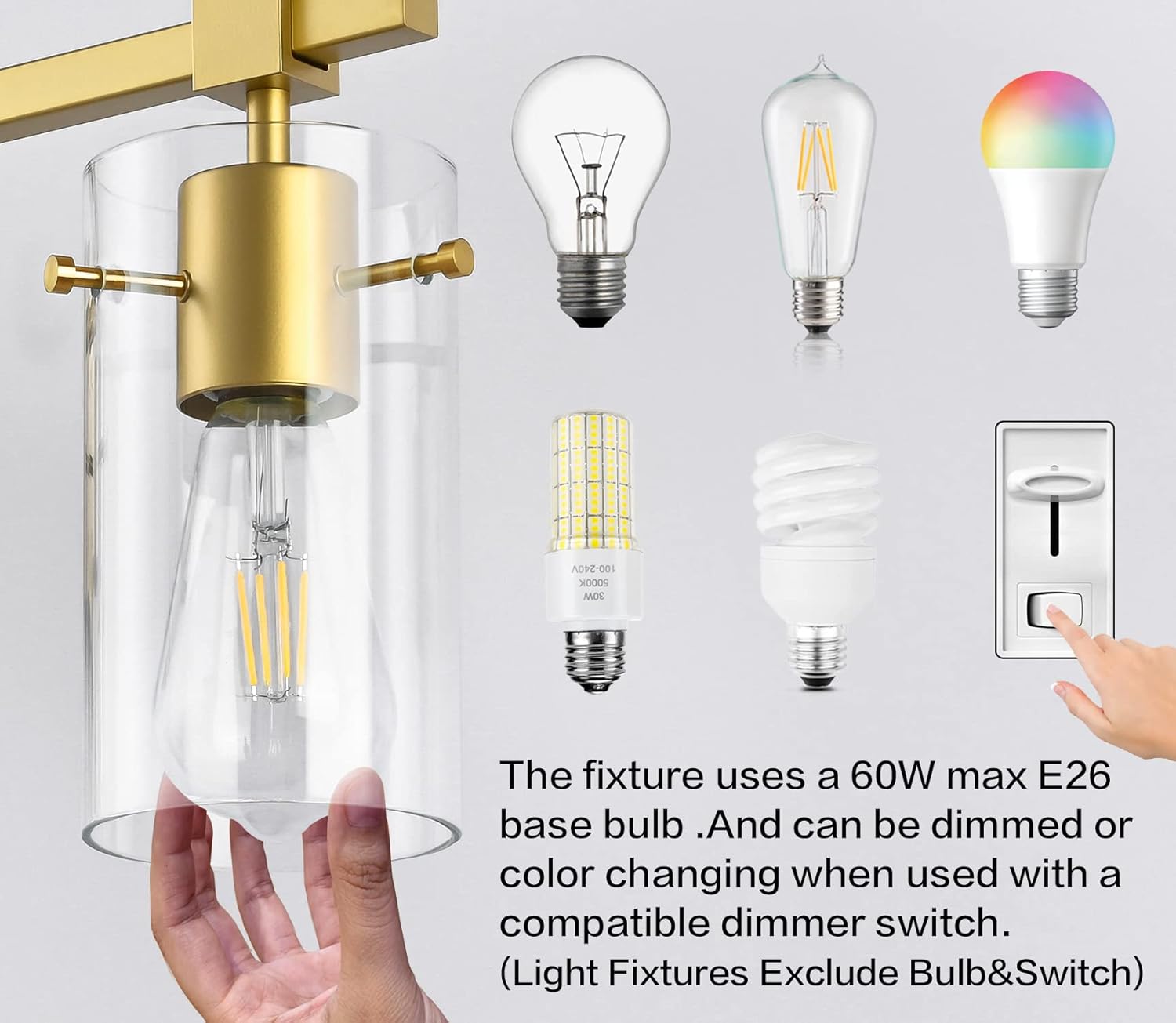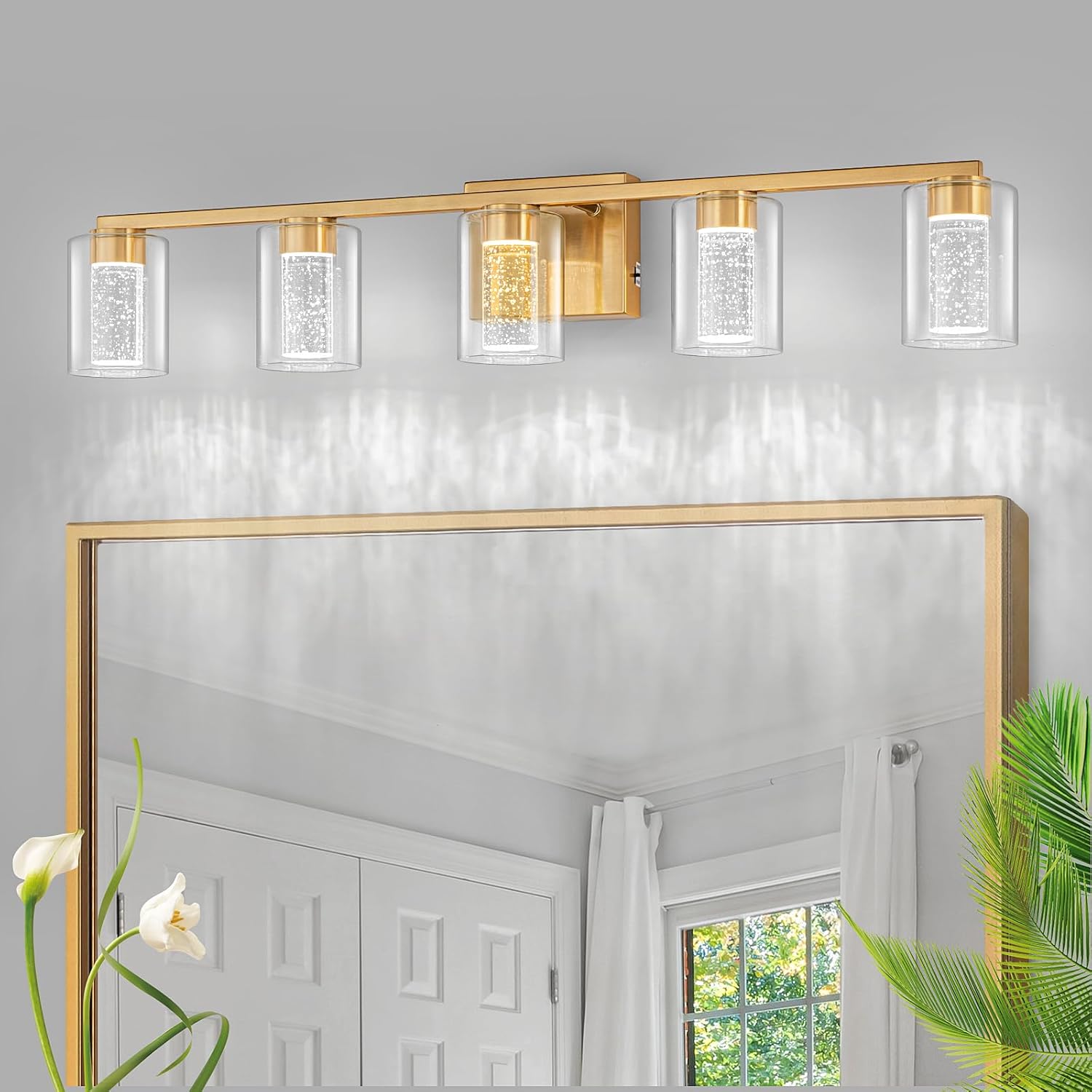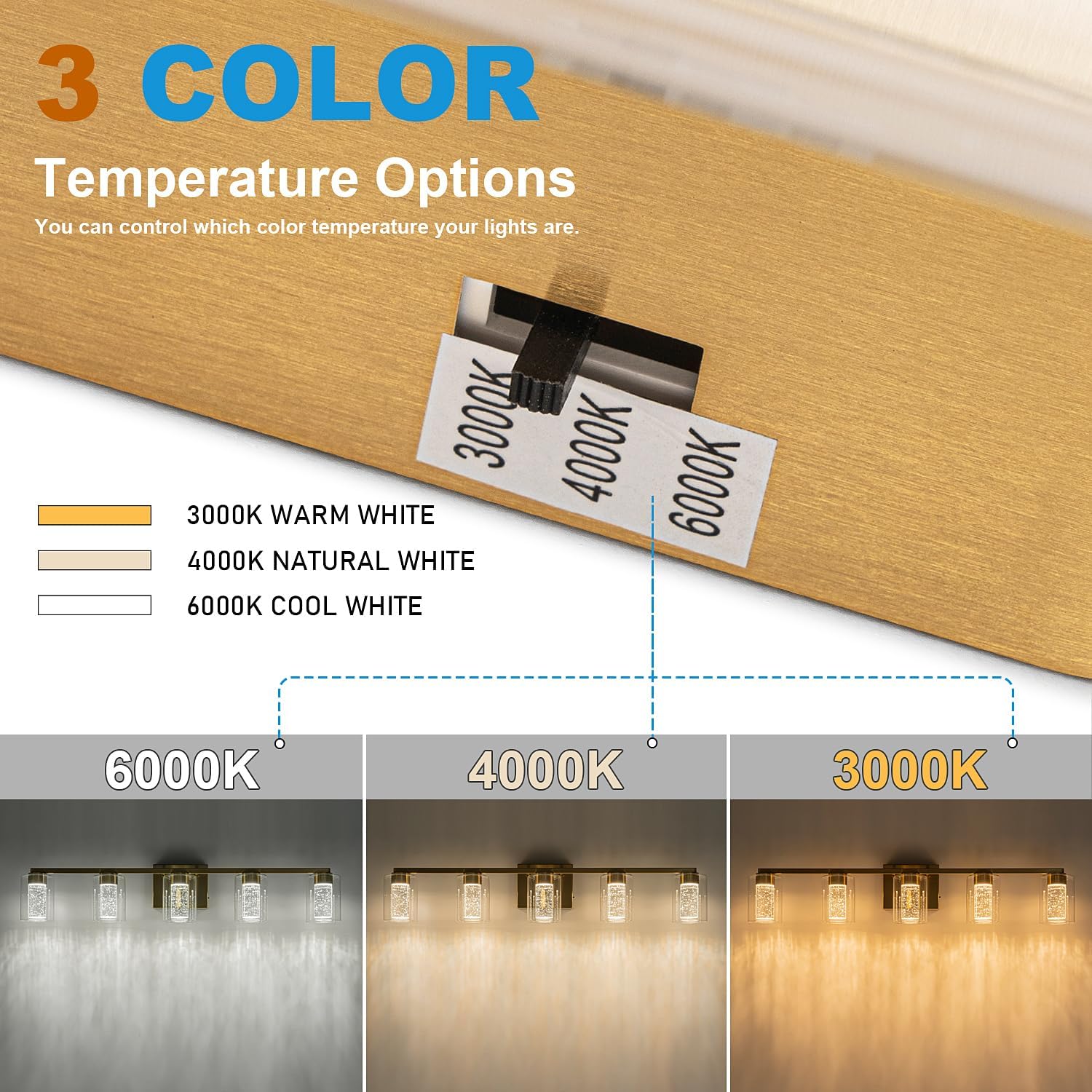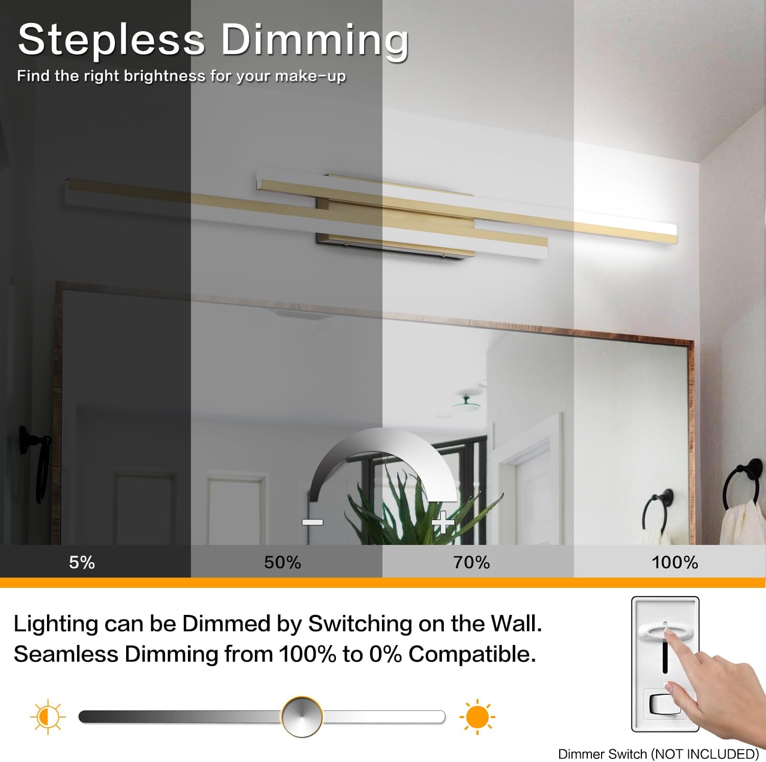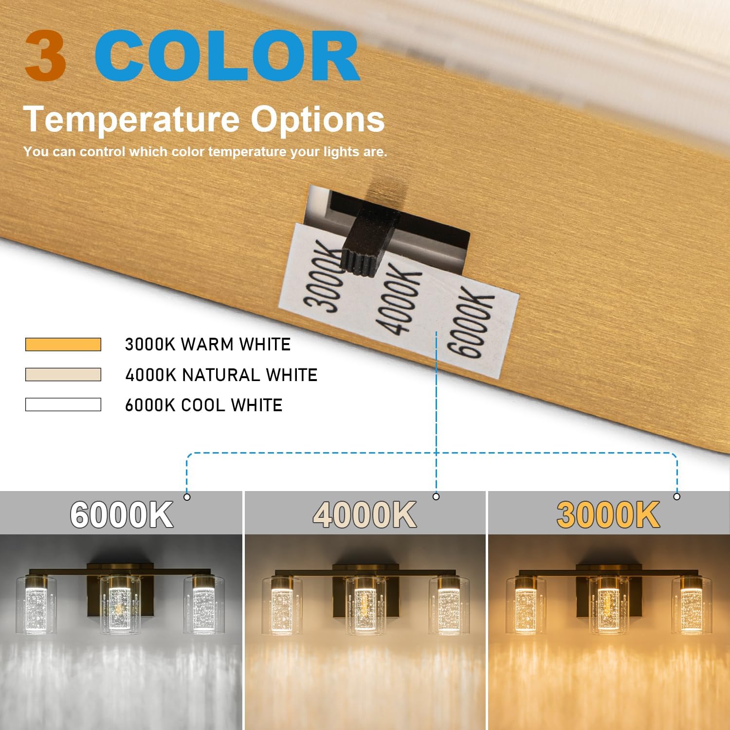 SineRise 3-Light Gold Vanity Light with 3 Color Modes (3000K/4000K/6000K), Eye Protection LED Bathroom Light Fixture, Dimmable Modern Wall Light Over Mirror with Clear Glass Shade
