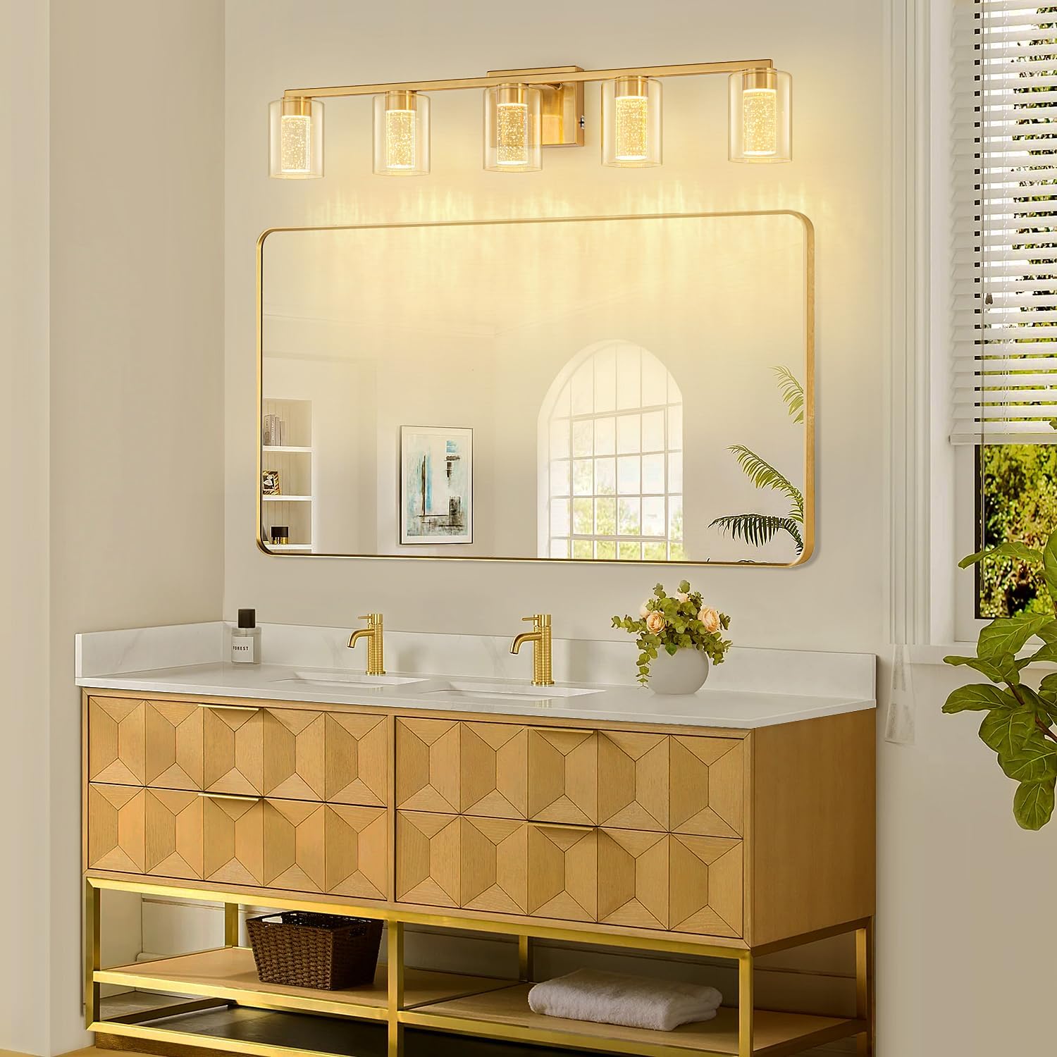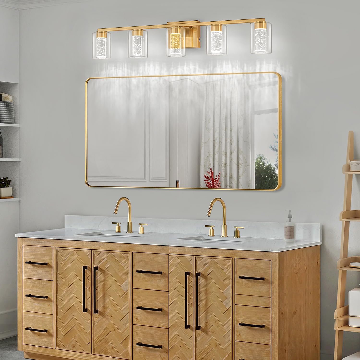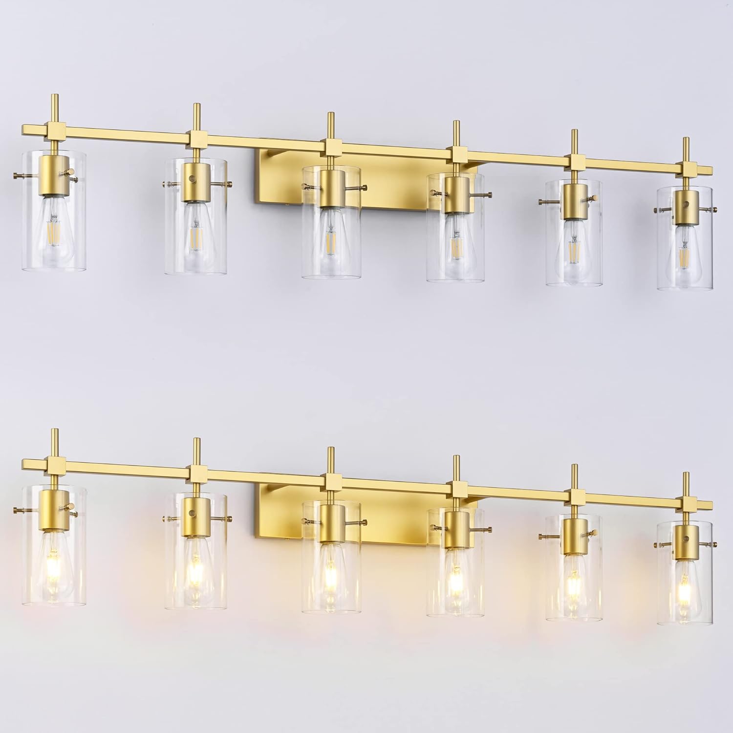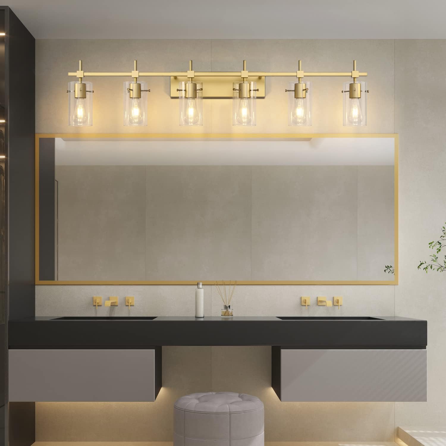 SineRise 3-Light Gold Vanity Light with 3 Color Modes (3000K/4000K/6000K), Eye Protection LED Bathroom Light Fixture, Dimmable Modern Wall Light Over Mirror with Clear Glass Shade