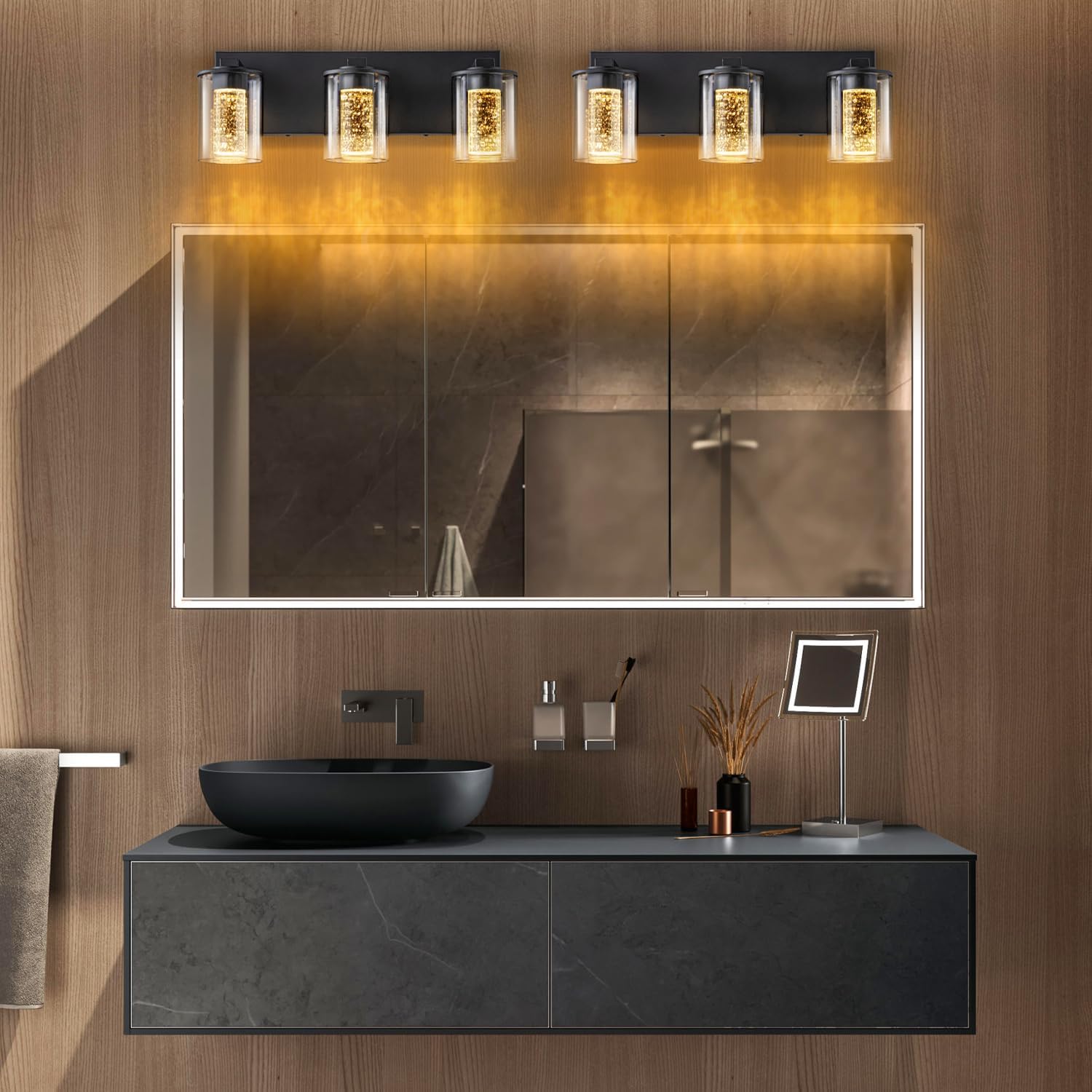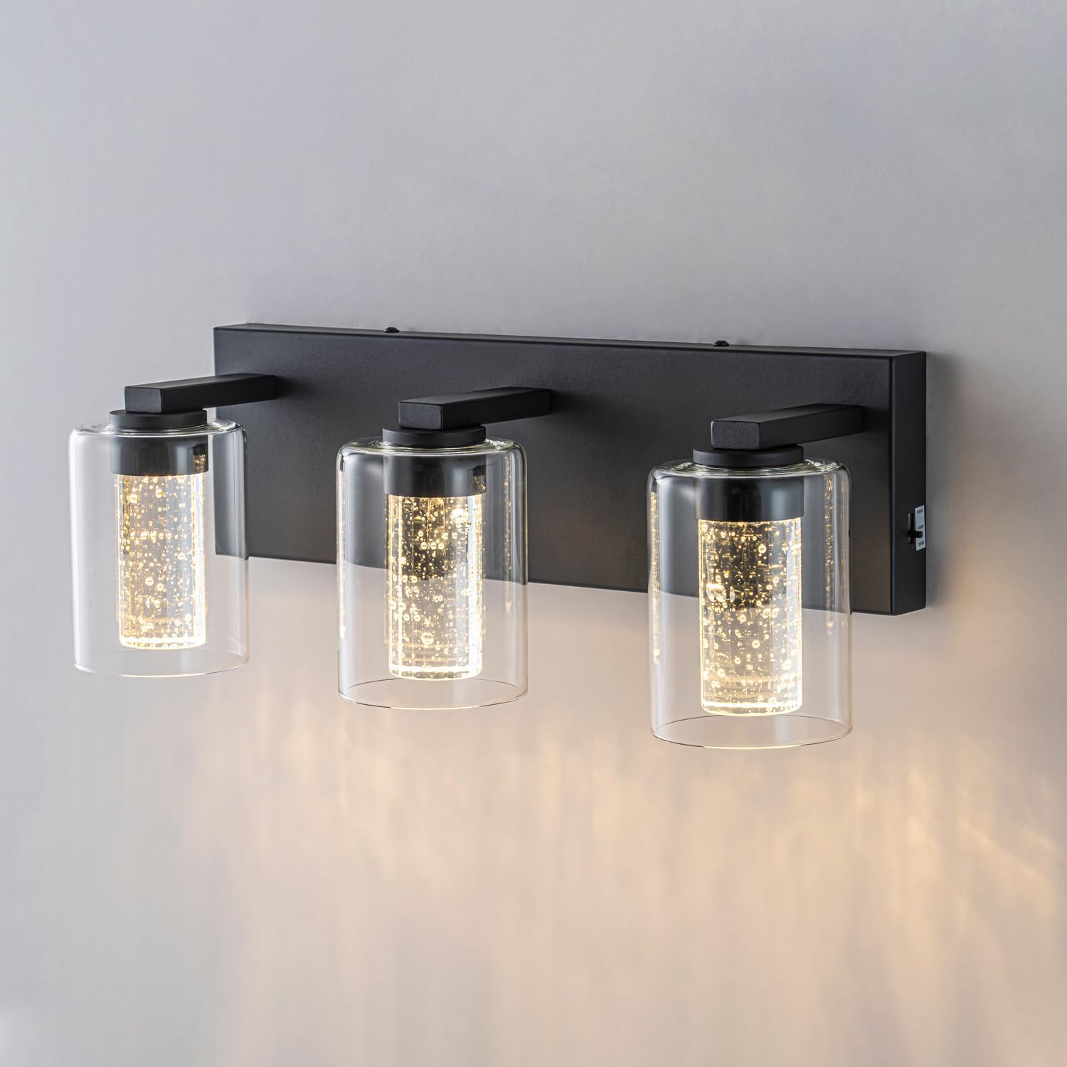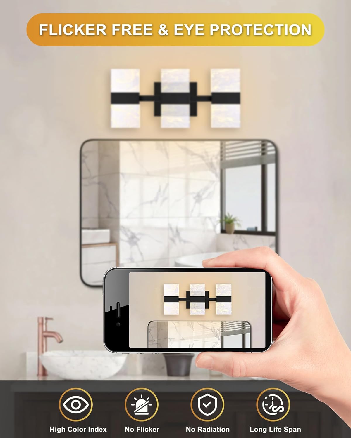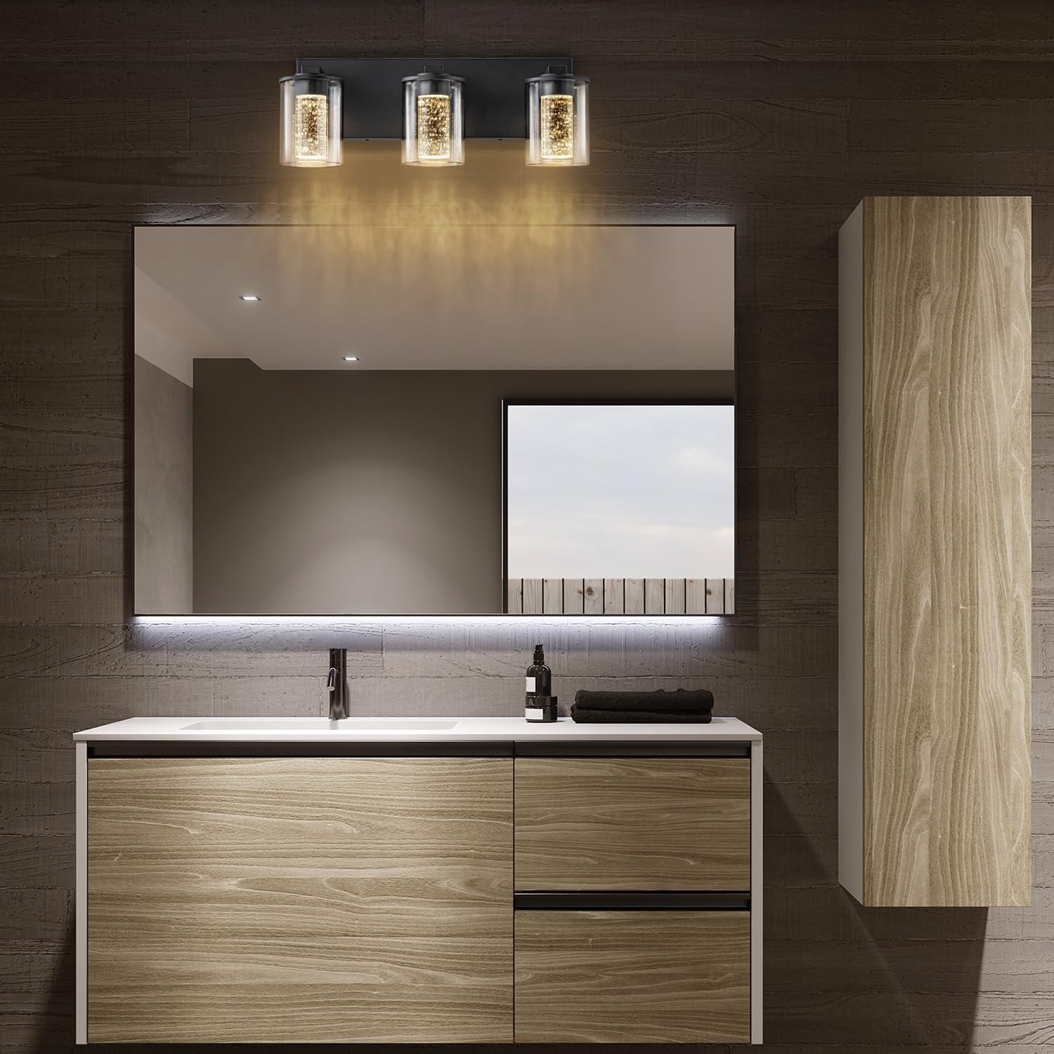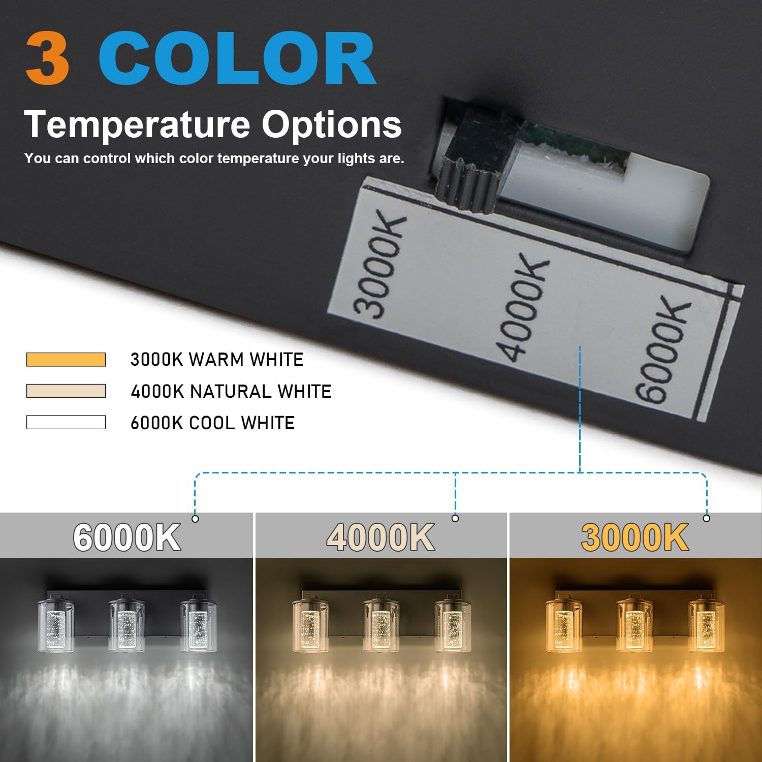 SineRise Black Vanity Light (3-Light, 17-Inch), (3000K/4000K/6000K, Dimmable), Eye Protection LED Bathroom Light Fixture, Modern Wall Light Over Mirror with Clear Glass Shade