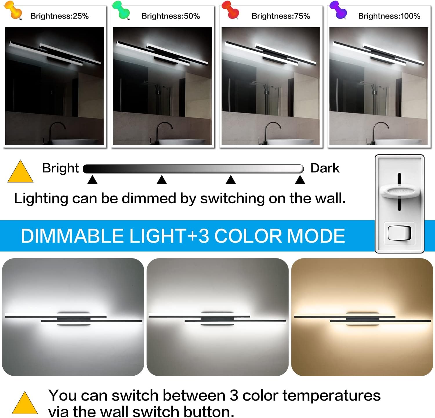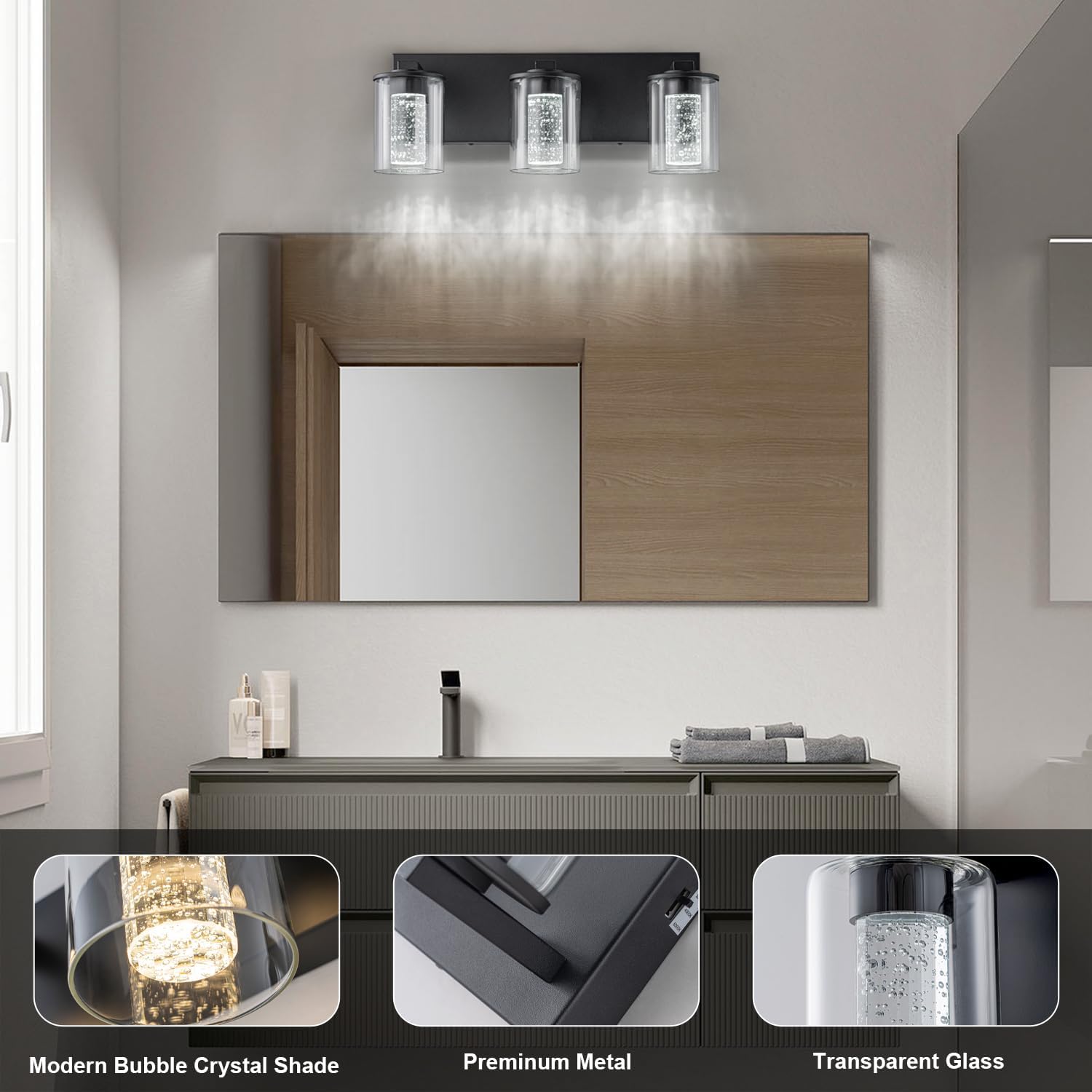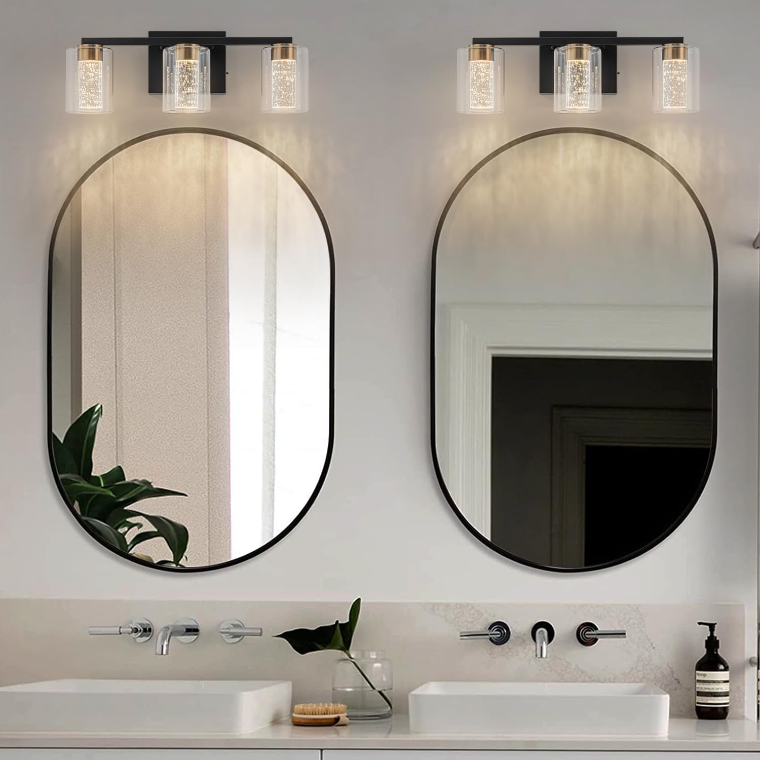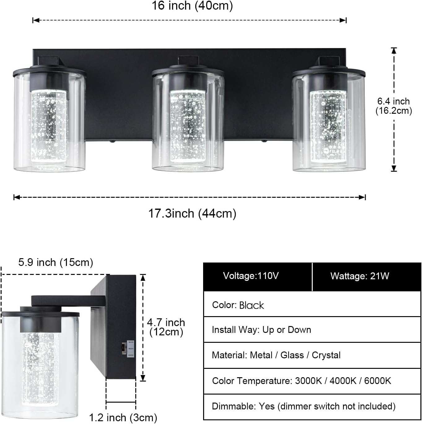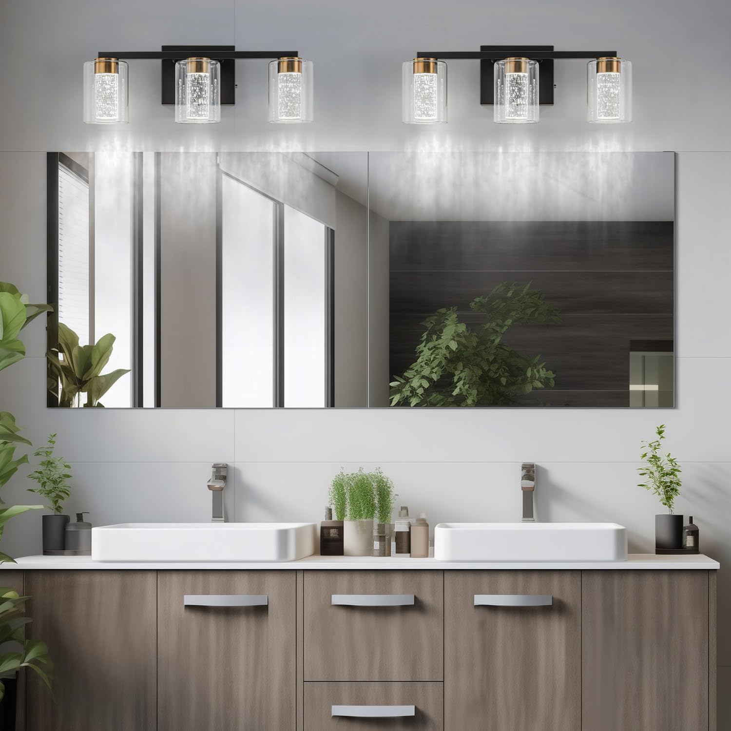 SineRise Black Vanity Light (3-Light, 17-Inch), (3000K/4000K/6000K, Dimmable), Eye Protection LED Bathroom Light Fixture, Modern Wall Light Over Mirror with Clear Glass Shade