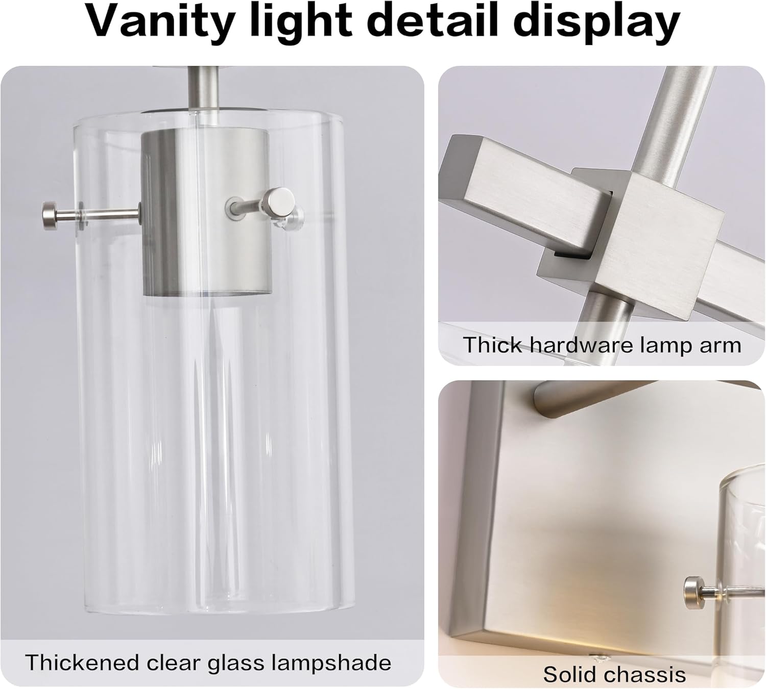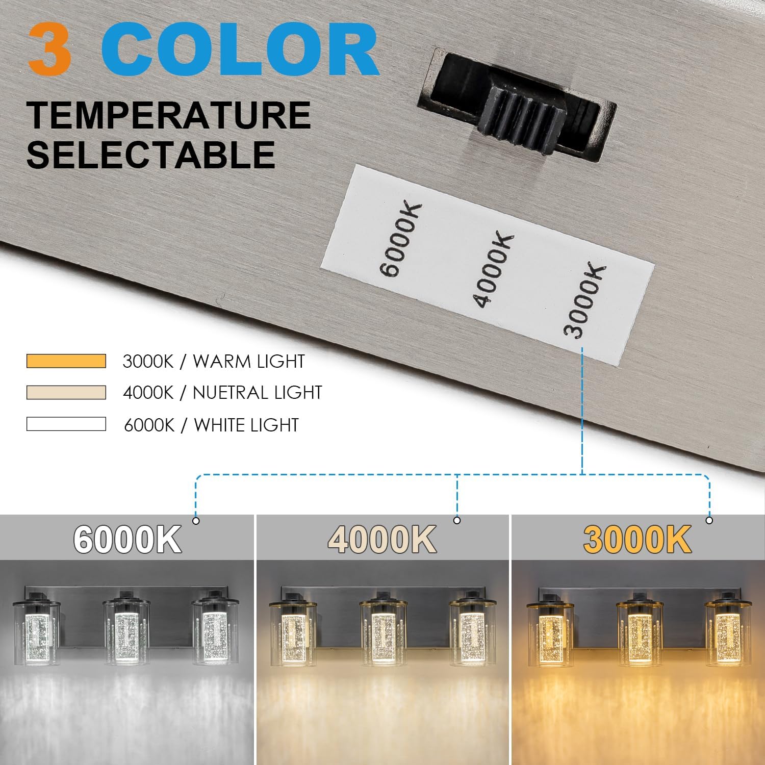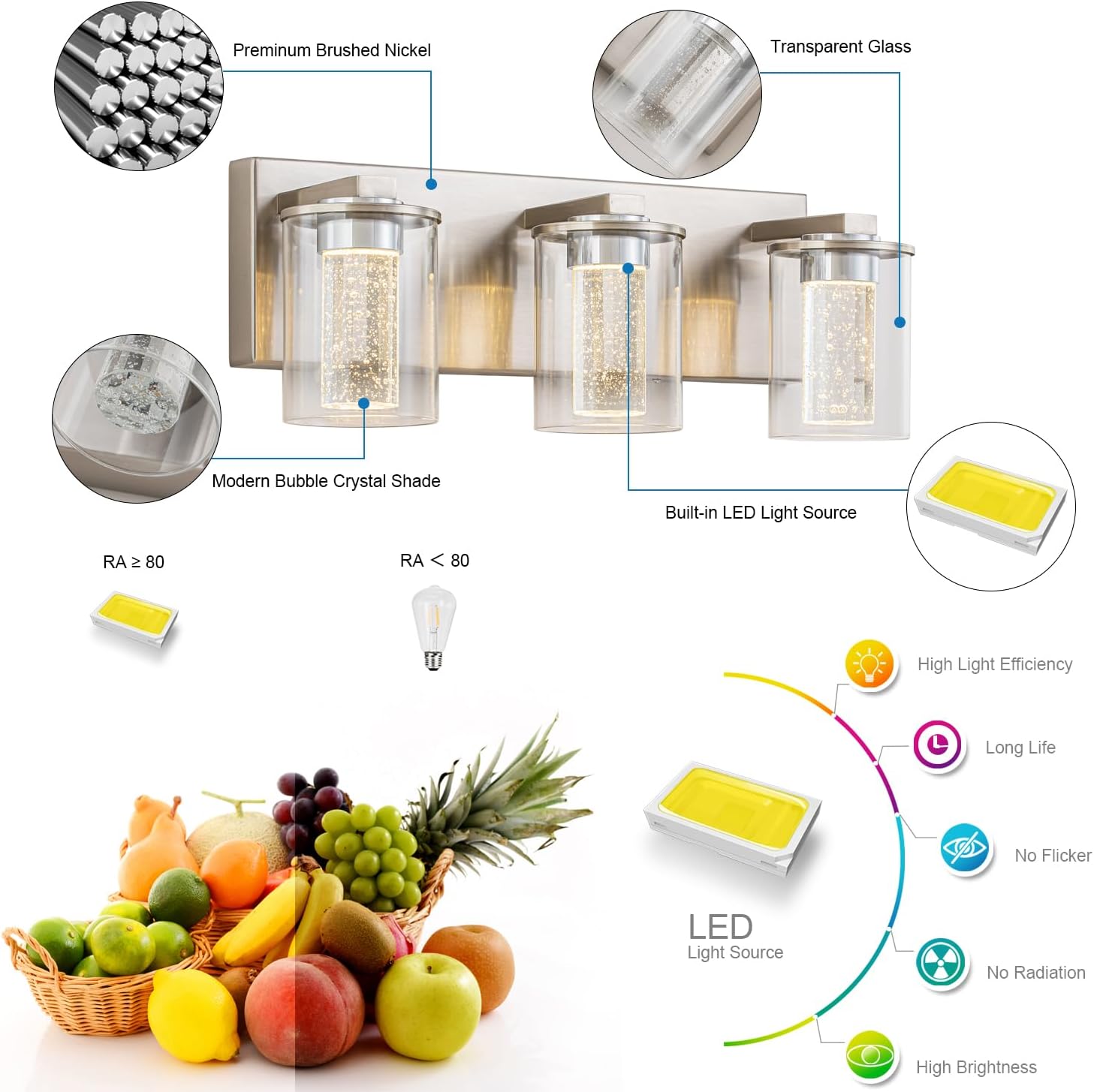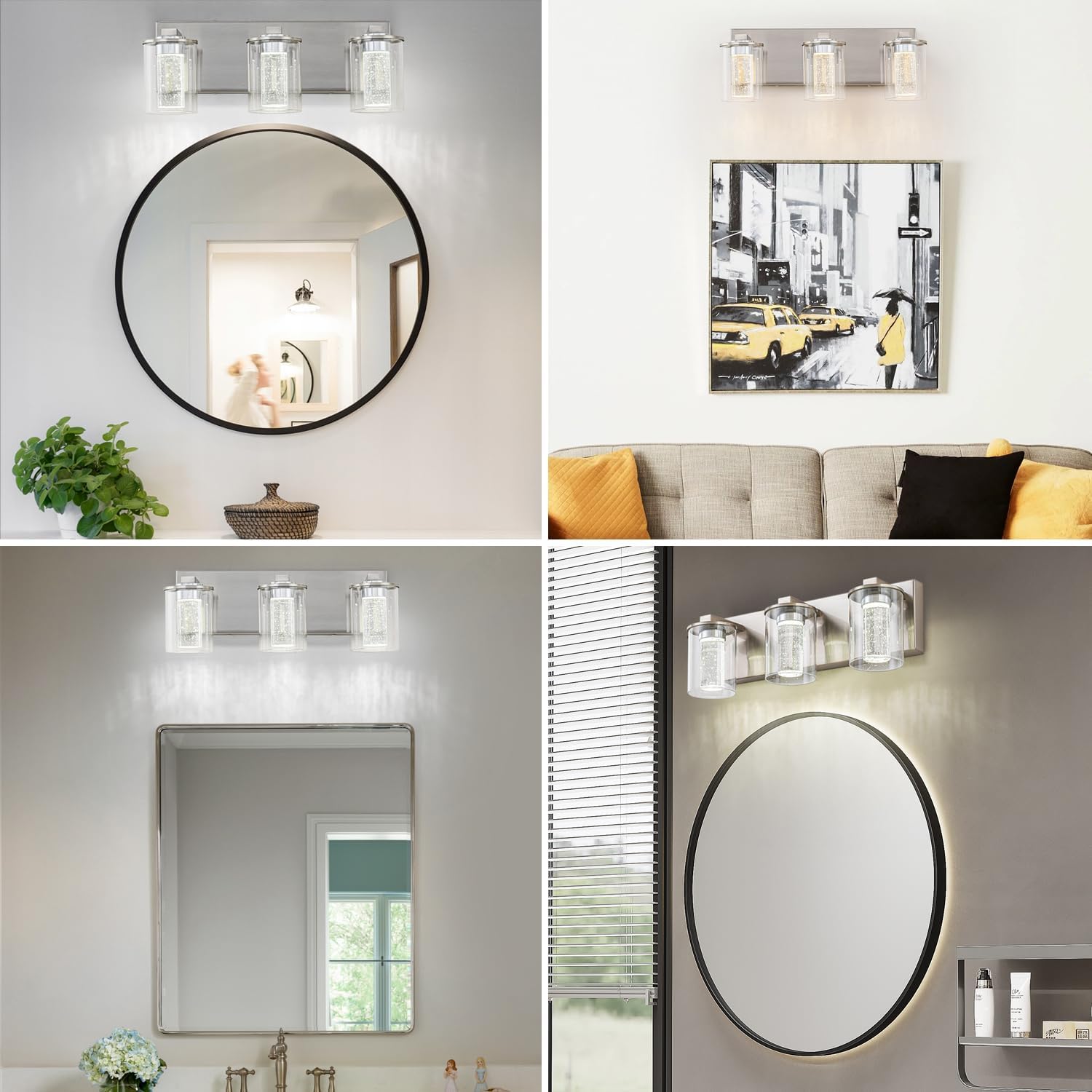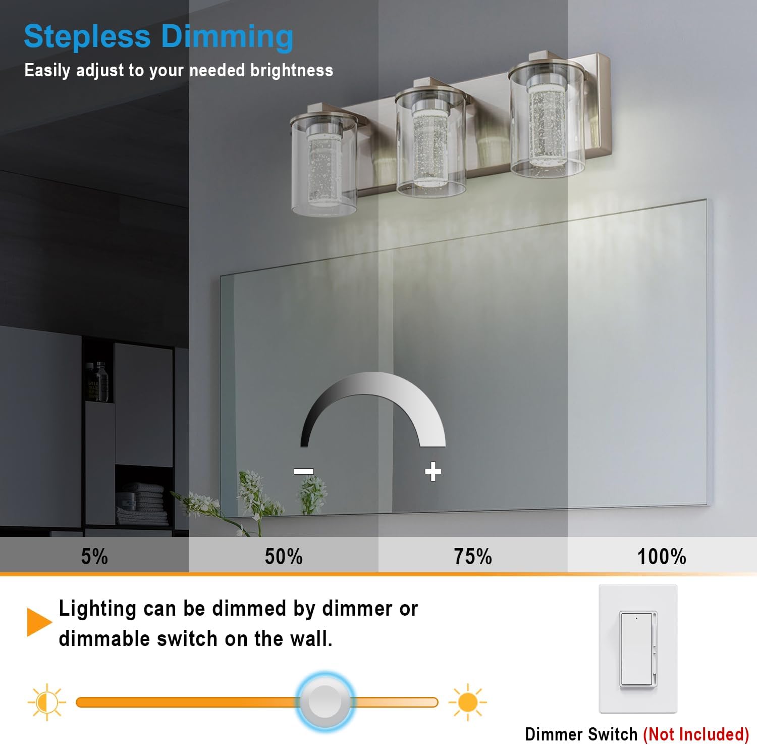 SineRise Brushed Nickel Vanity Light (3-Light, 17-Inch), (3000K/4000K/6000K, Dimmable), Eye Protection LED Bathroom Light Fixture, Modern Wall Light Over Mirror with Clear Glass Shade