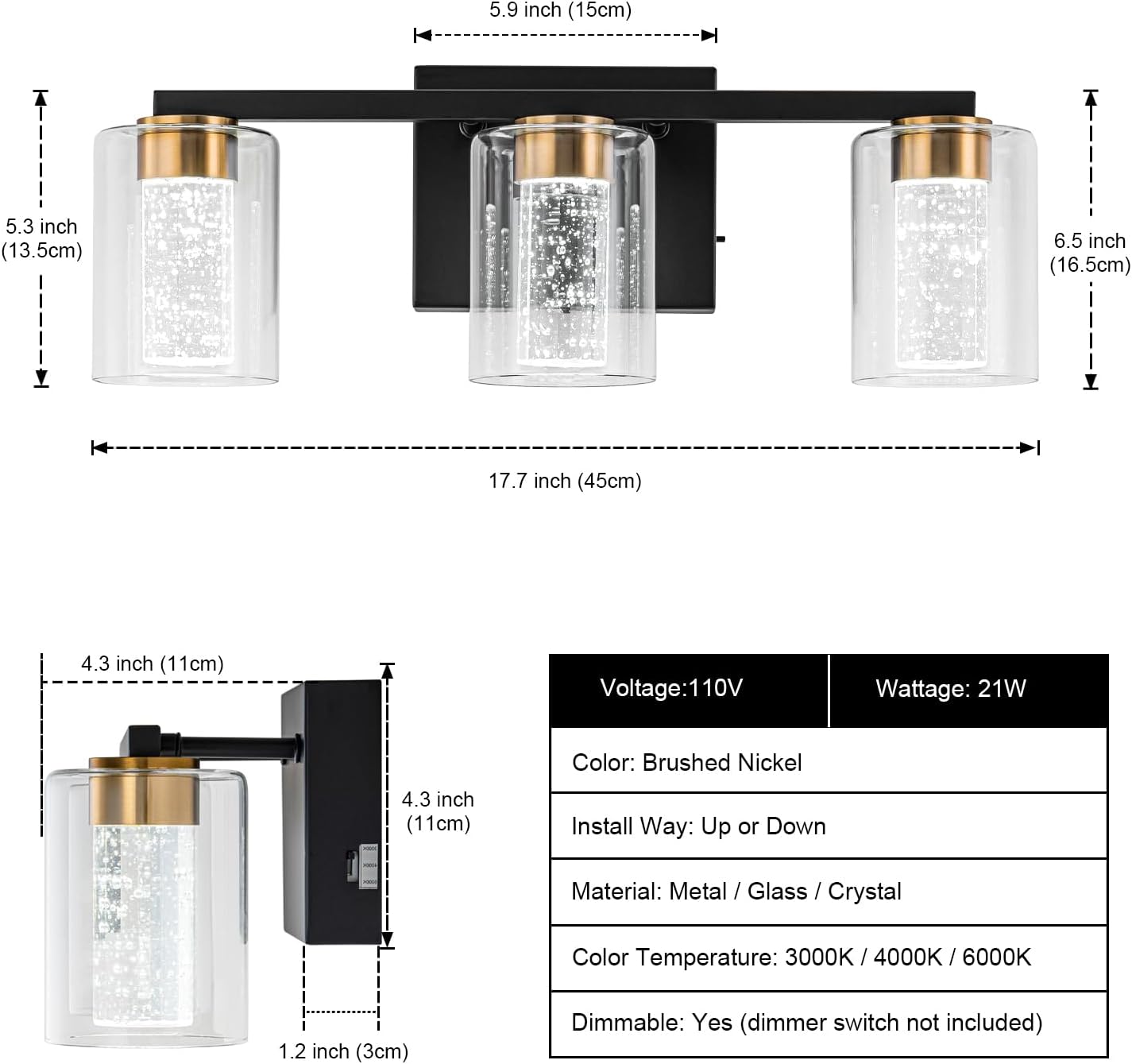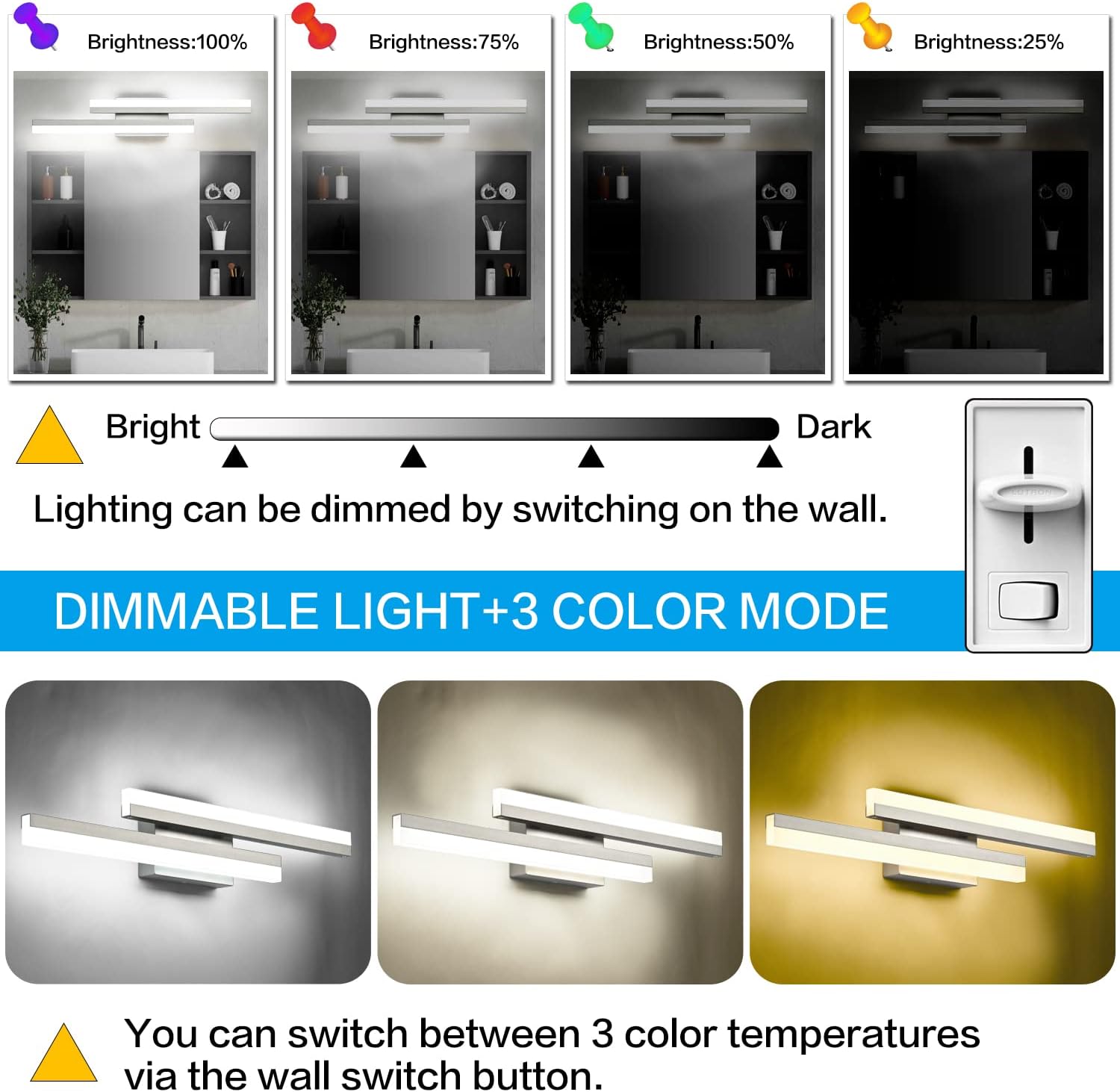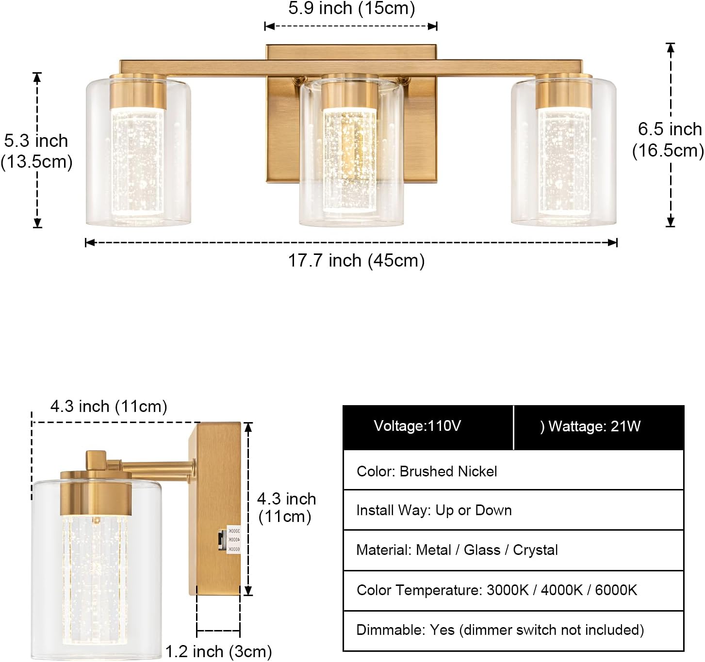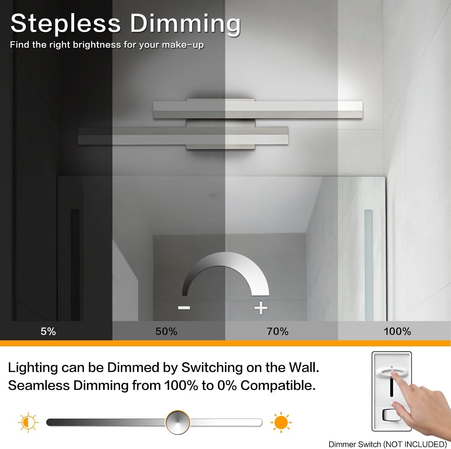 SineRise Brushed Nickel Vanity Light (3-Light, 17-Inch), (3000K/4000K/6000K, Dimmable), Eye Protection LED Bathroom Light Fixture, Modern Wall Light Over Mirror with Clear Glass Shade