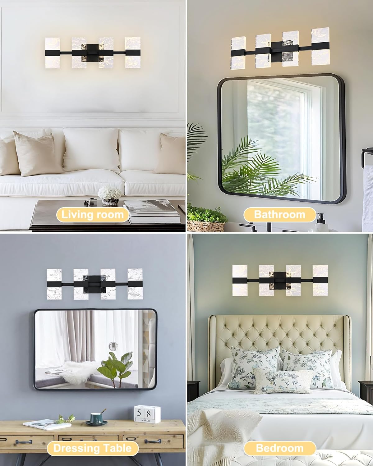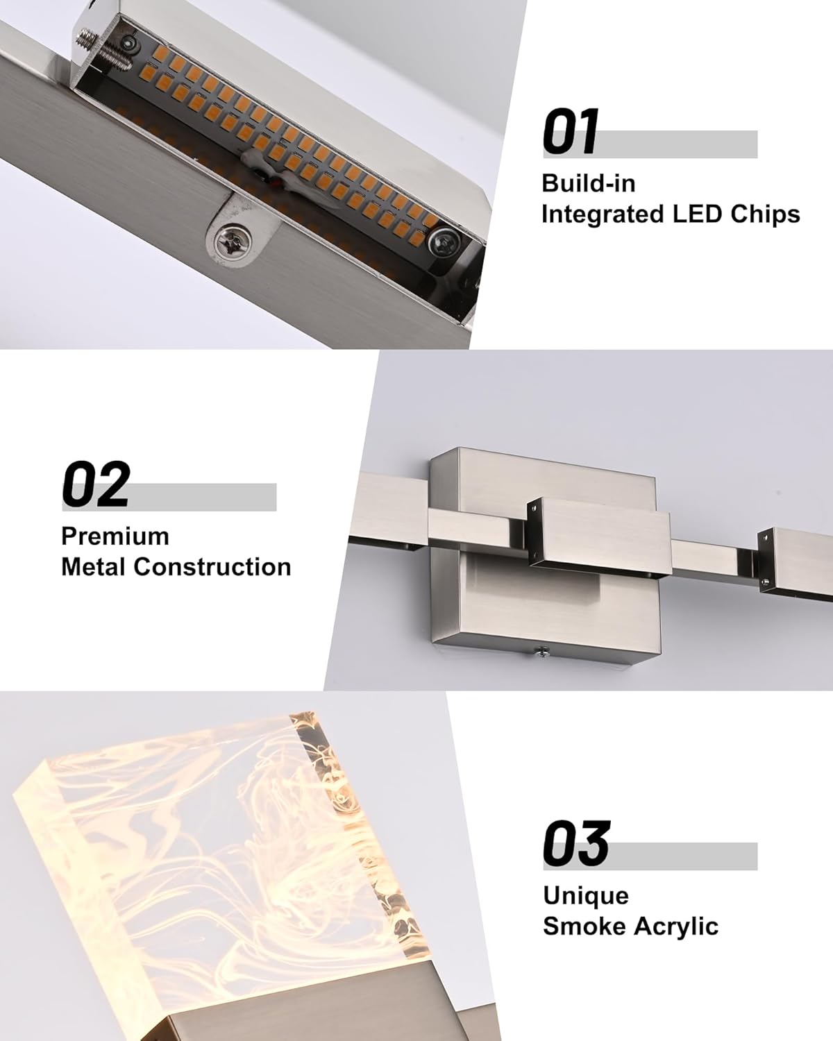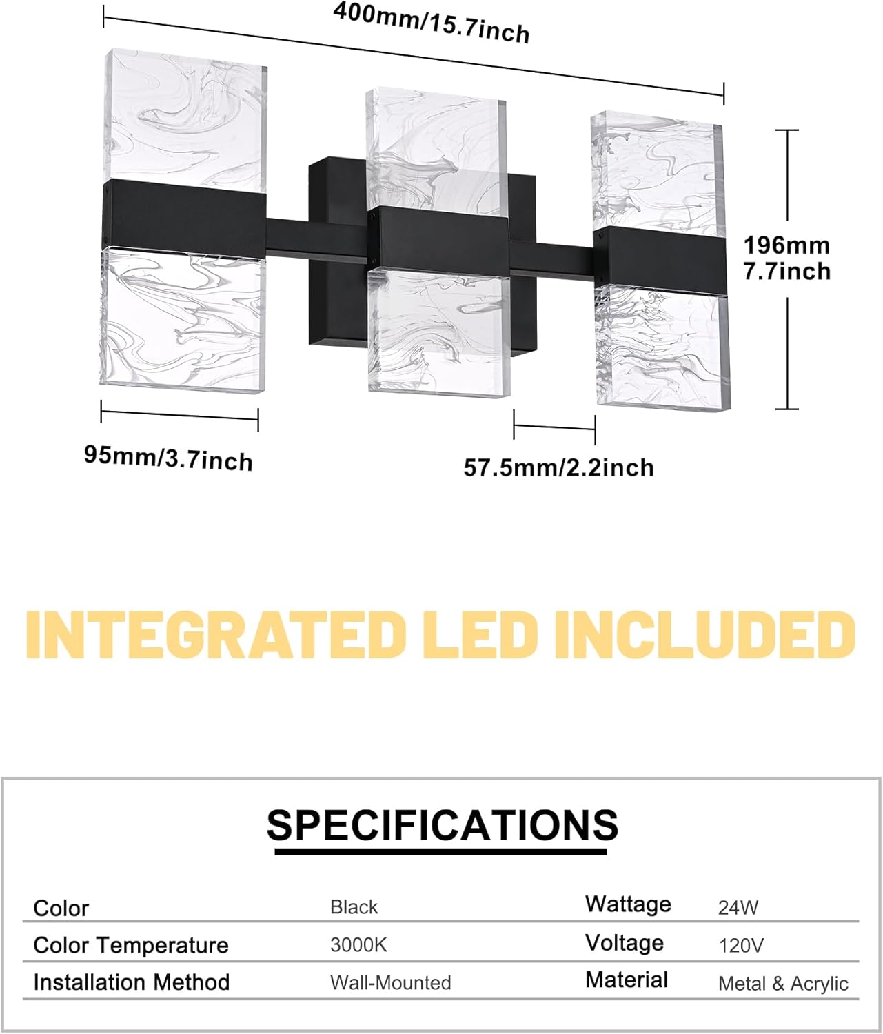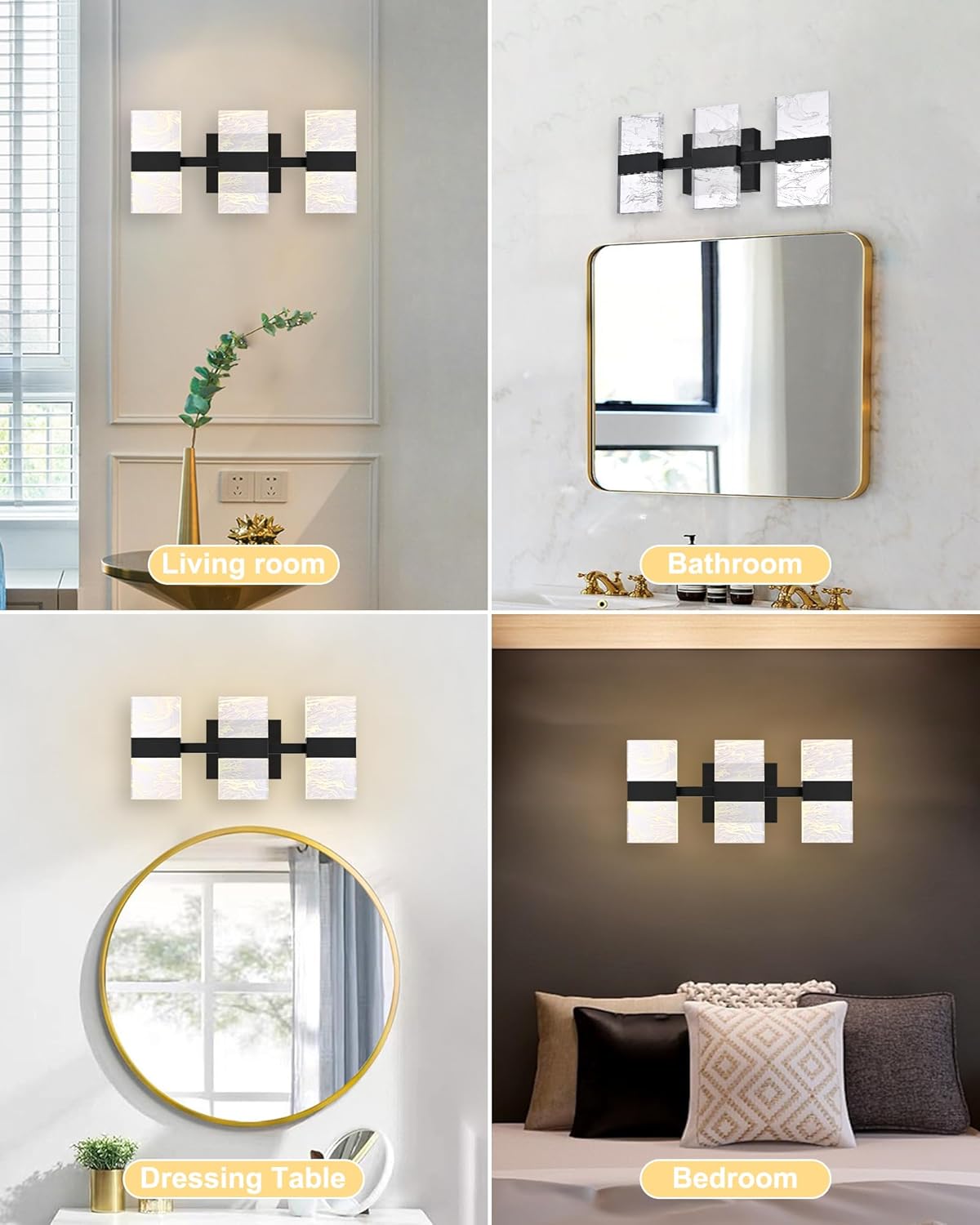 LED 3000K Black Bathroom Light Fixture, Modern 3-Lights Vanity Lighting with Smoke Acrylic Shades, Wall Lamp Over Mirror for Kitchen Bedroom (Integrated Led Chips Included)
