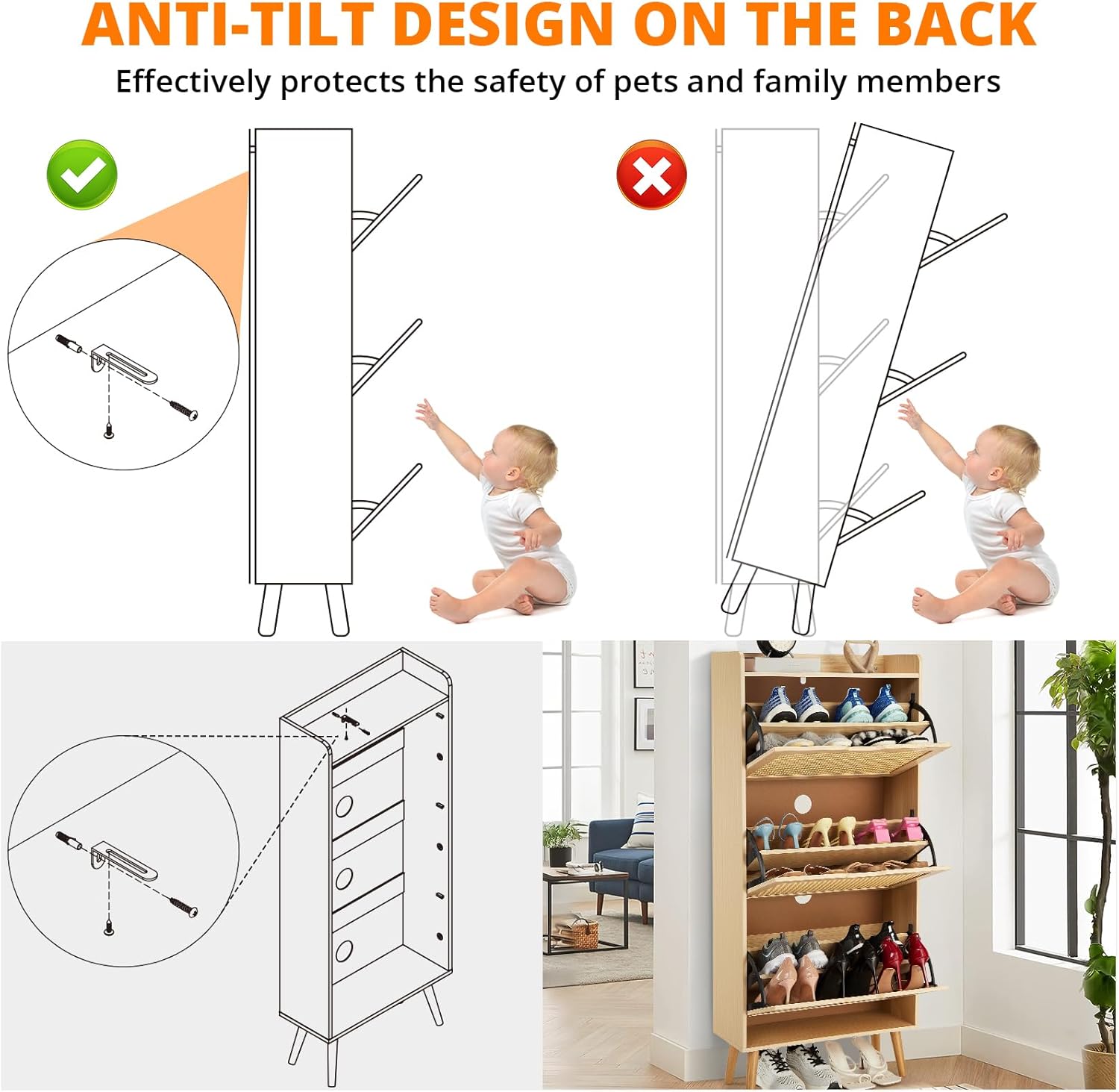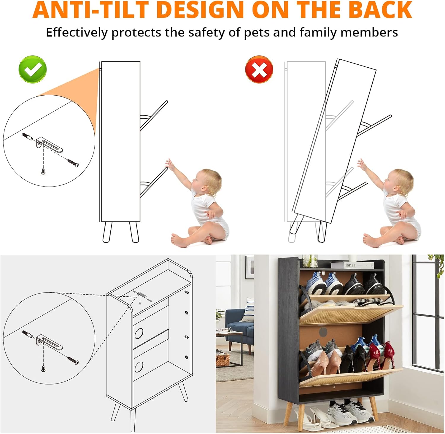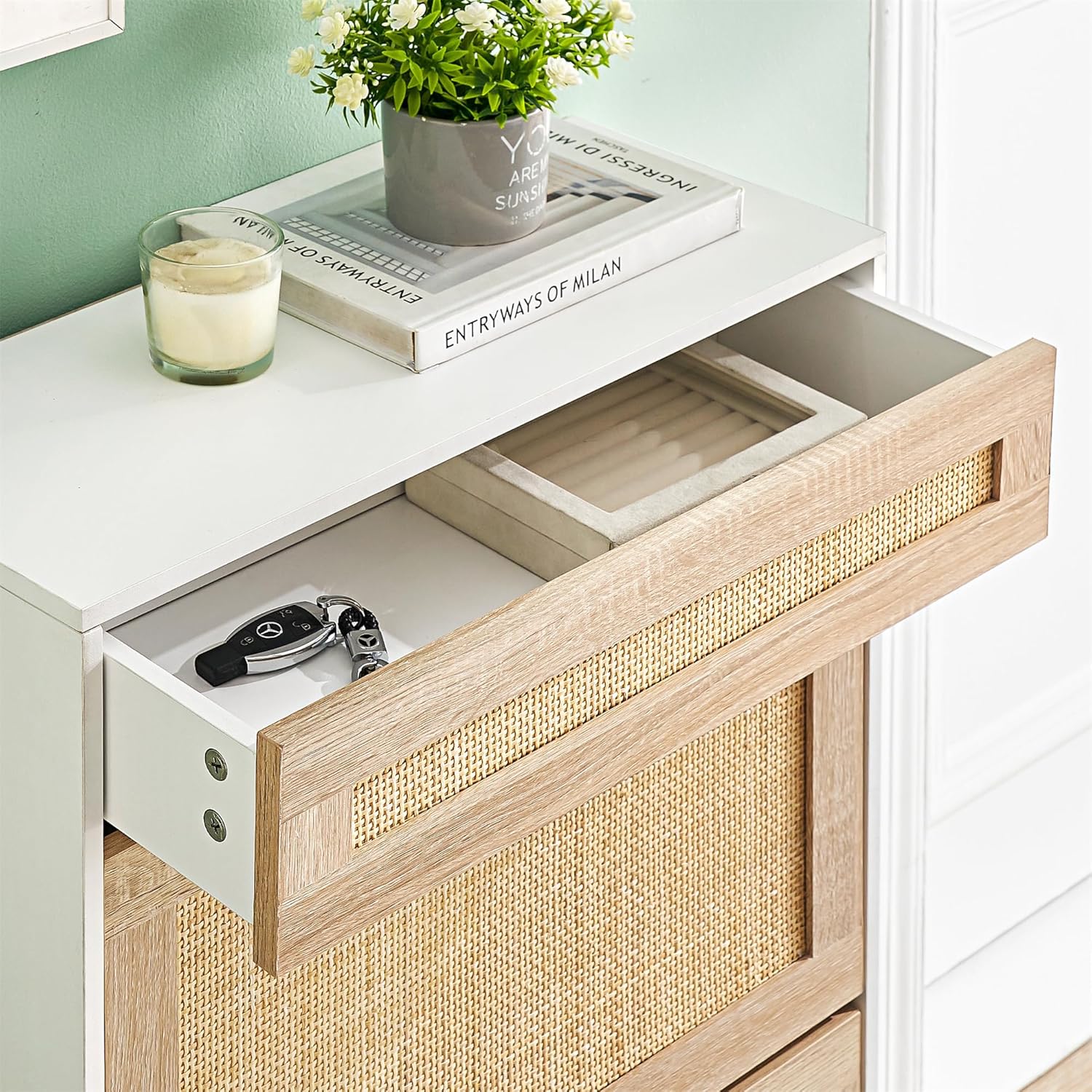 IDEALHOUSE Shoe Cabinet for Entryway, Rattan Storage Organizer with Flip-Drawer & Anti-Tip Design, Shoe Storage Cabinet - Holds 15-20 Pairs of Shoes for Closet/Bedroom