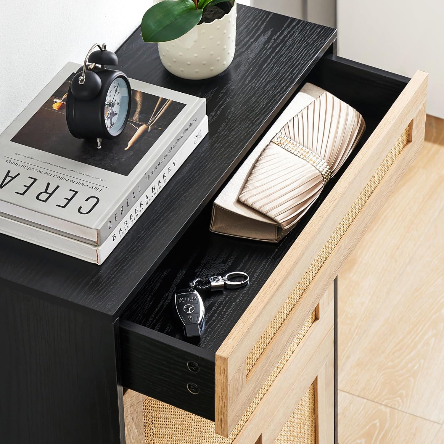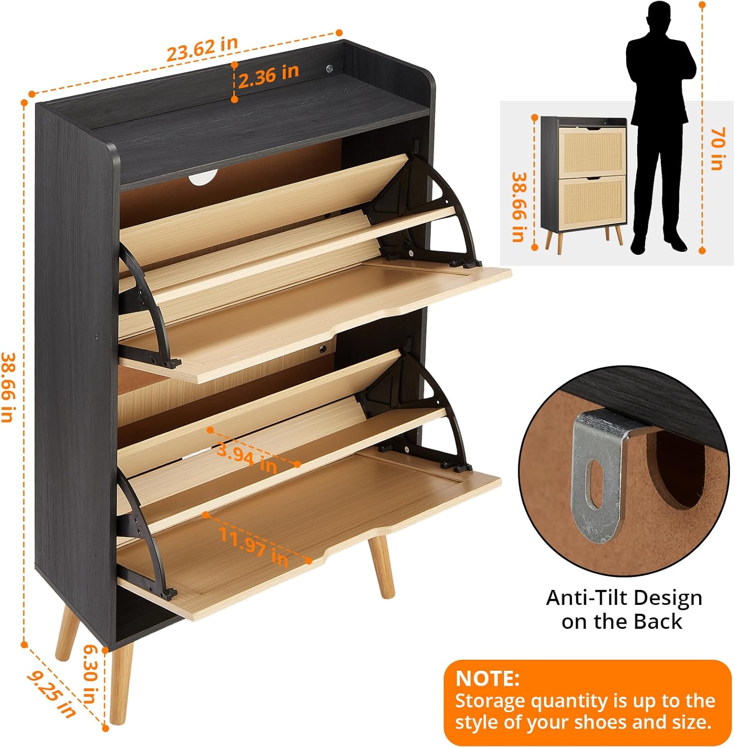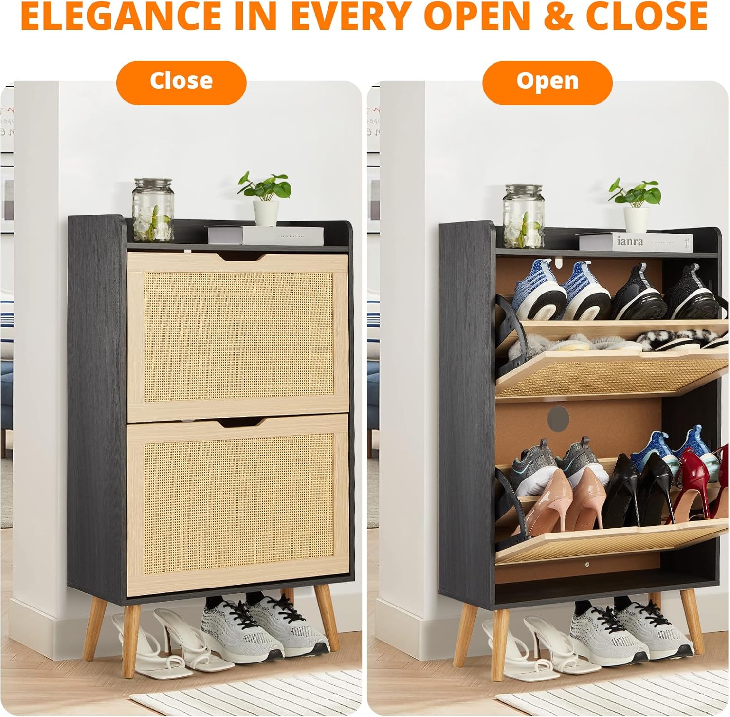GAOMON Natural Rattan 2 Flip Door with 1 Drawer Shoe Rack Storage Cabinet, Shoe Cabinet Organizer Freestanding with 3-Tier Adjustable Shelves for Entryway, Entrance Hallway (2 Flip Doors, Black)