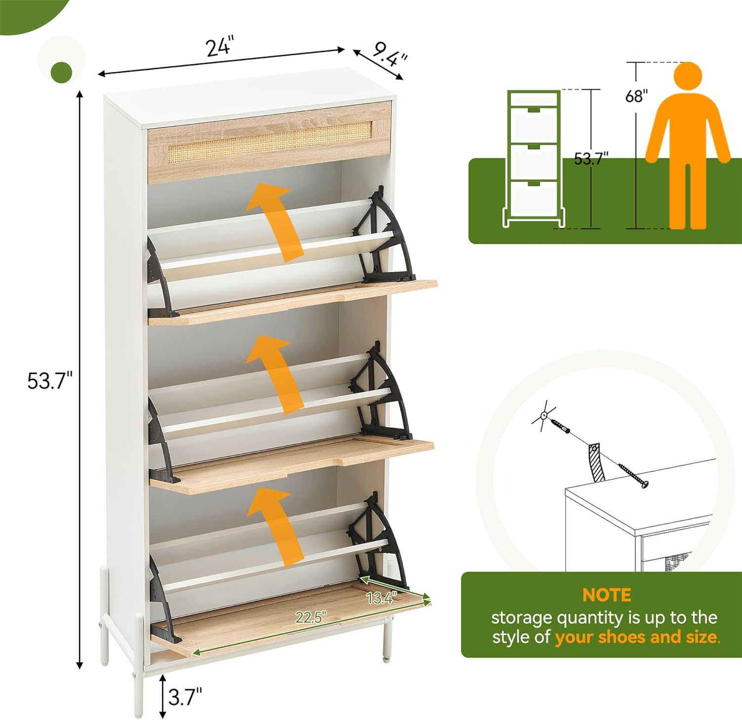 GAOMON Natural Rattan 3 Flip Door with 1 Drawer Shoe Rack Storage Cabinet, Shoe Cabinet Organizer Freestanding with 3-Tier Adjustable Shelves for Entryway, Entrance Hallway (3 Flip Doors, White)