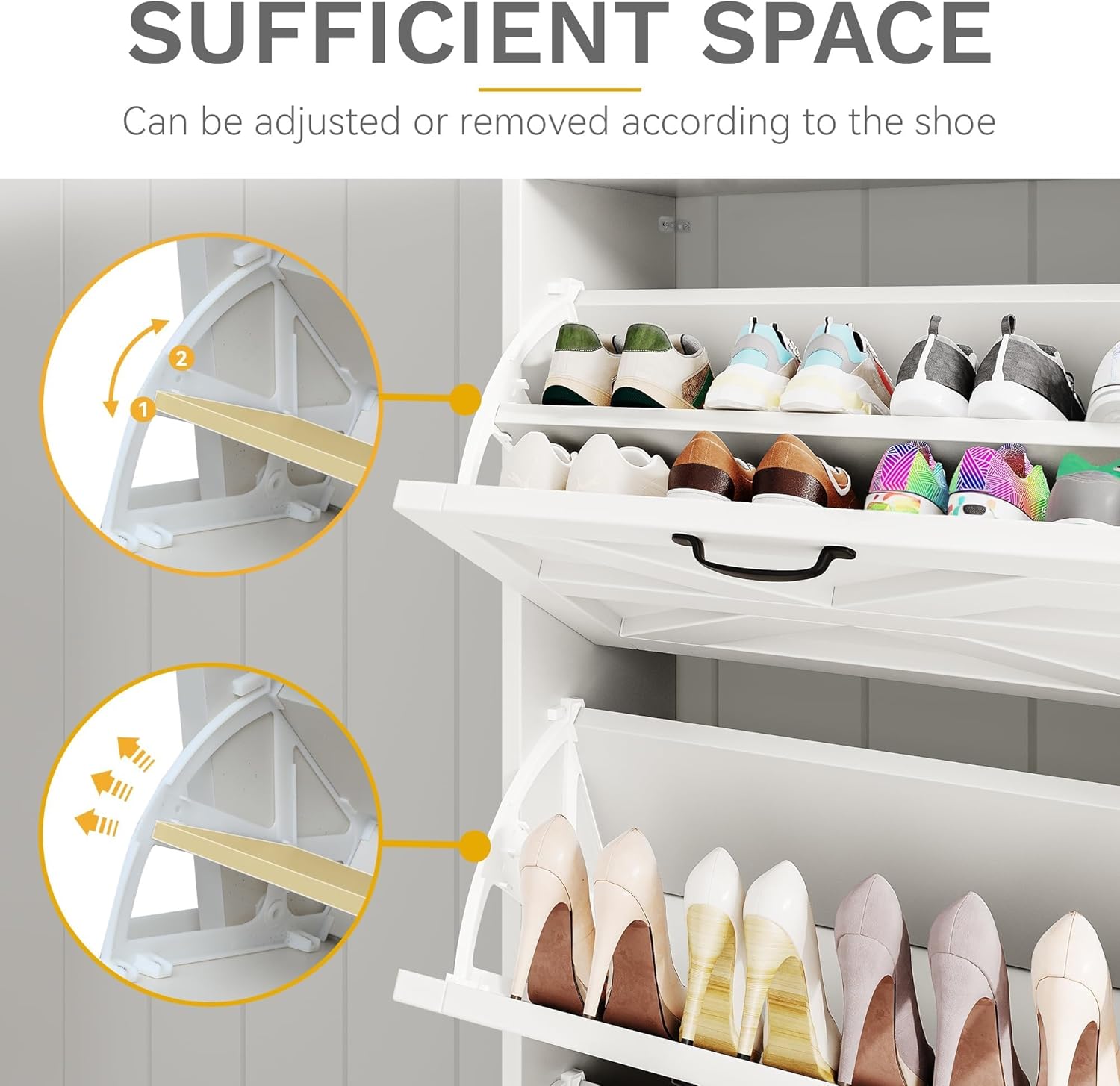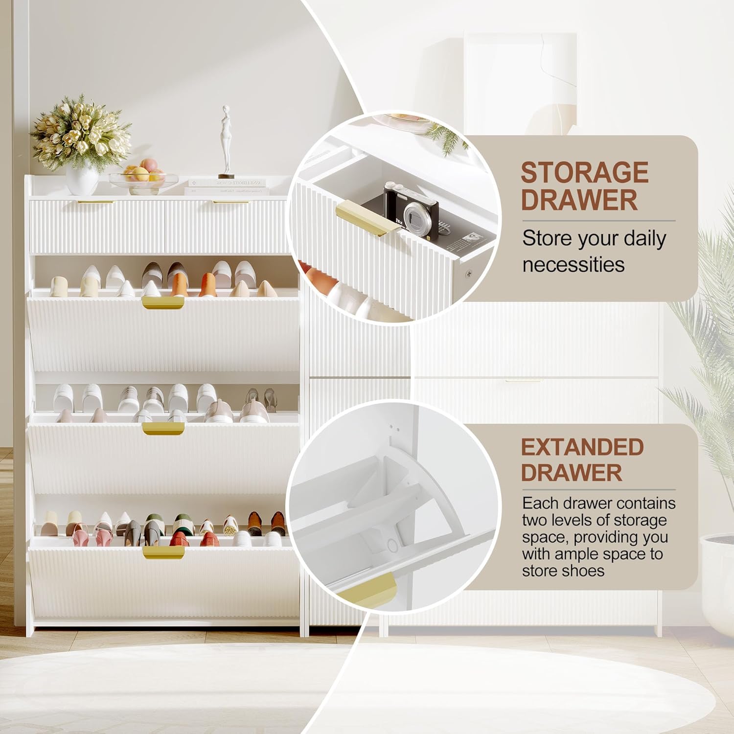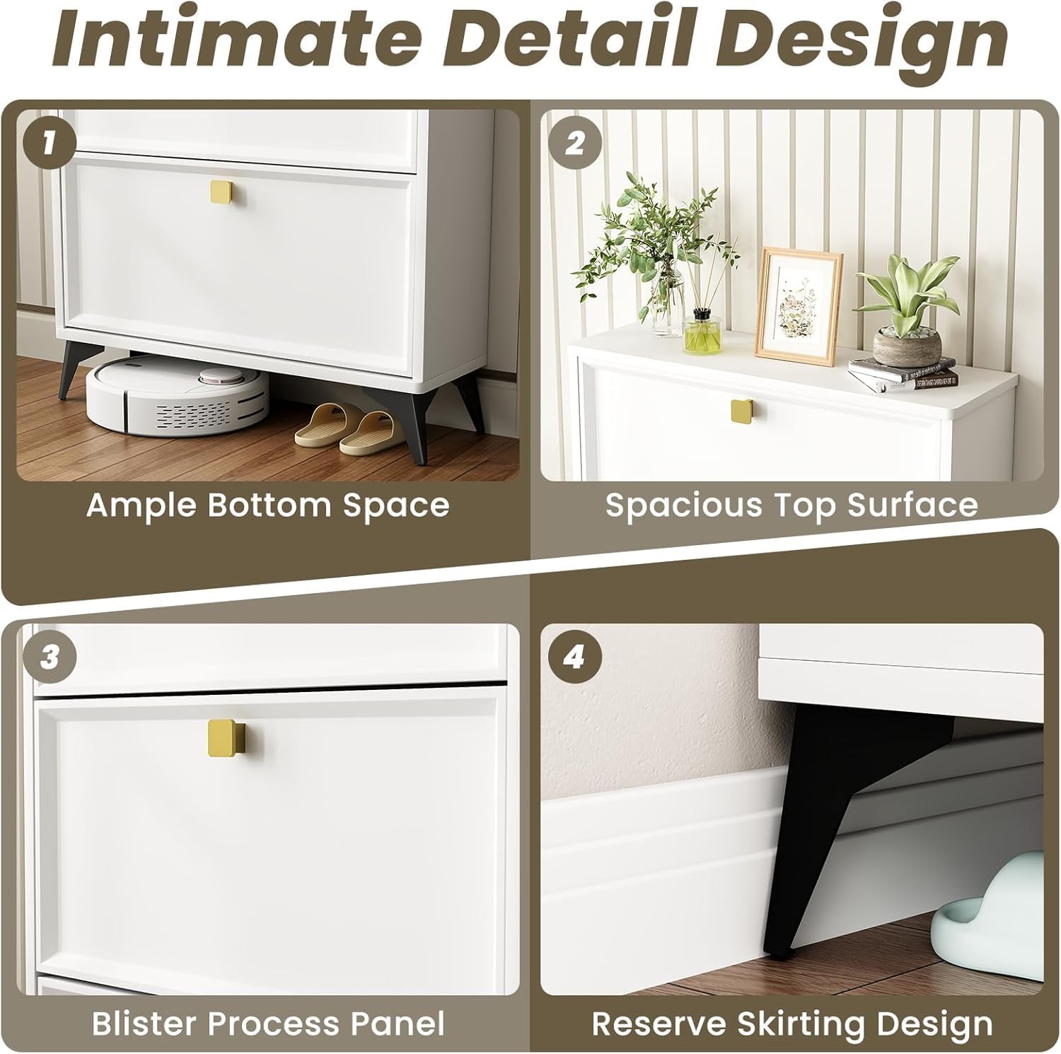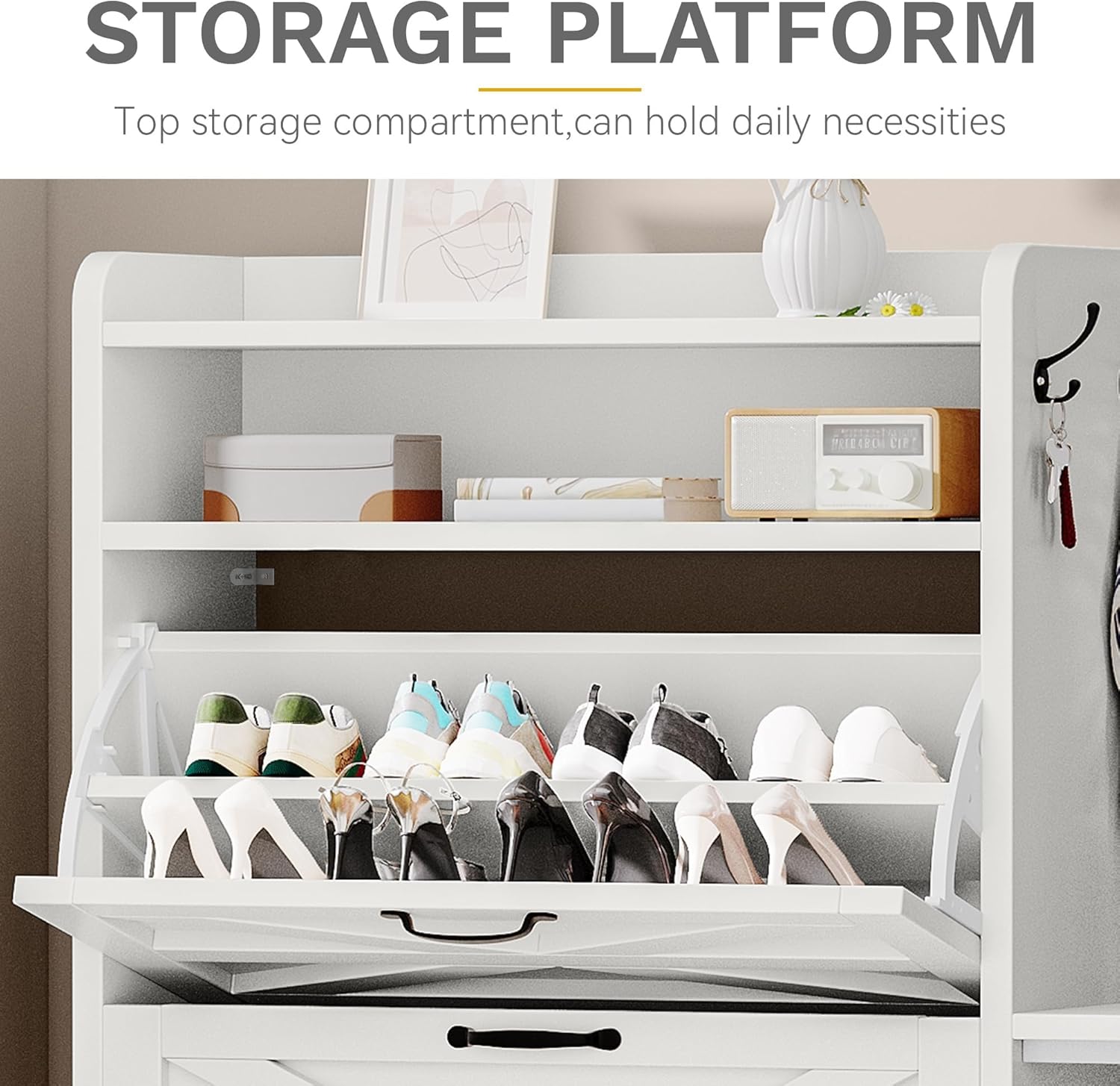 AWQM Shoe Cabinet, Wooden Freestanding Shoes Storage Cabinet with 2 Hidden FILP Drawers & Drawer Chest, Modern Narrow Shoe Organizer Cabinet for Entryway, Living Room, Hallway - White