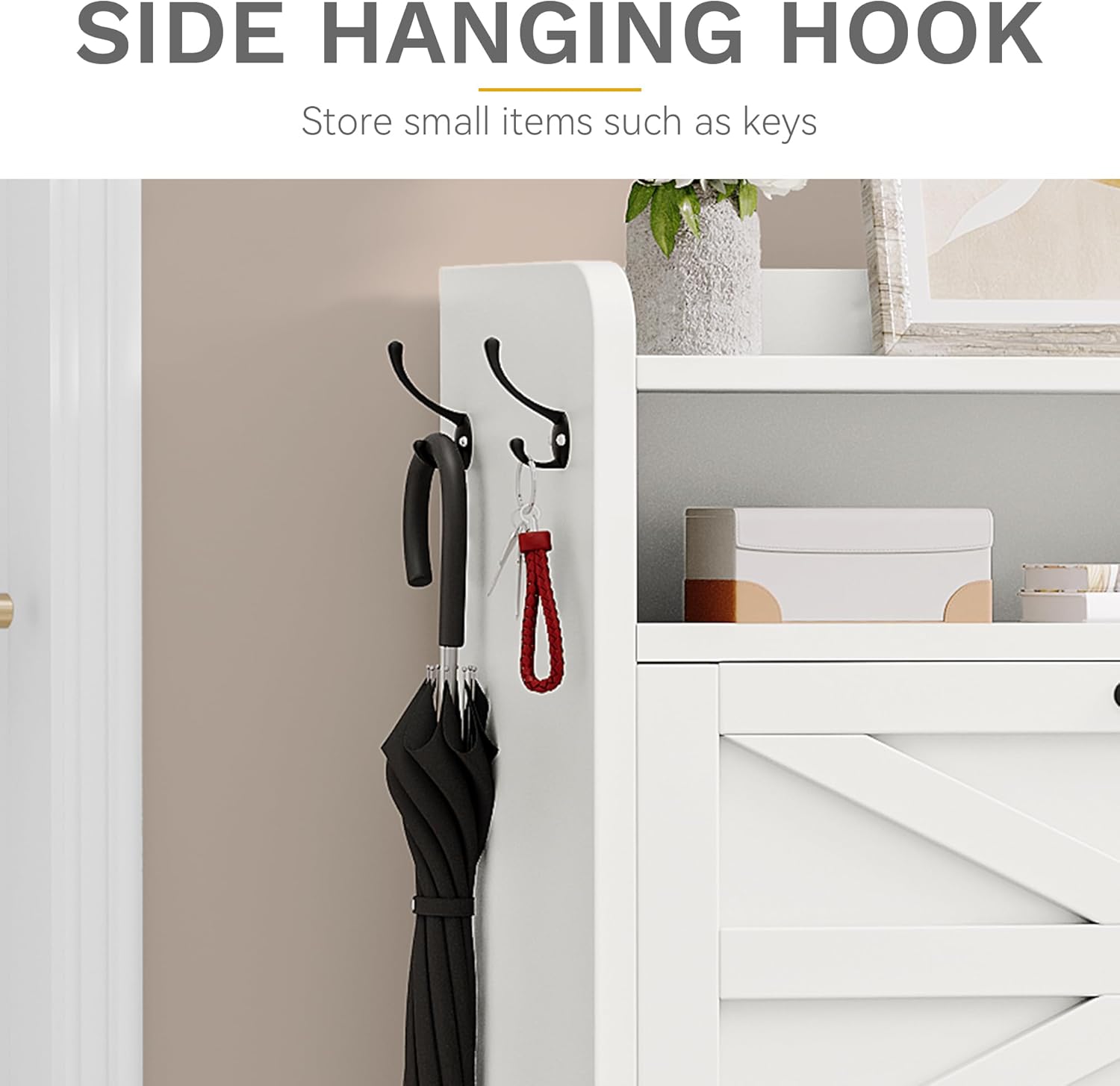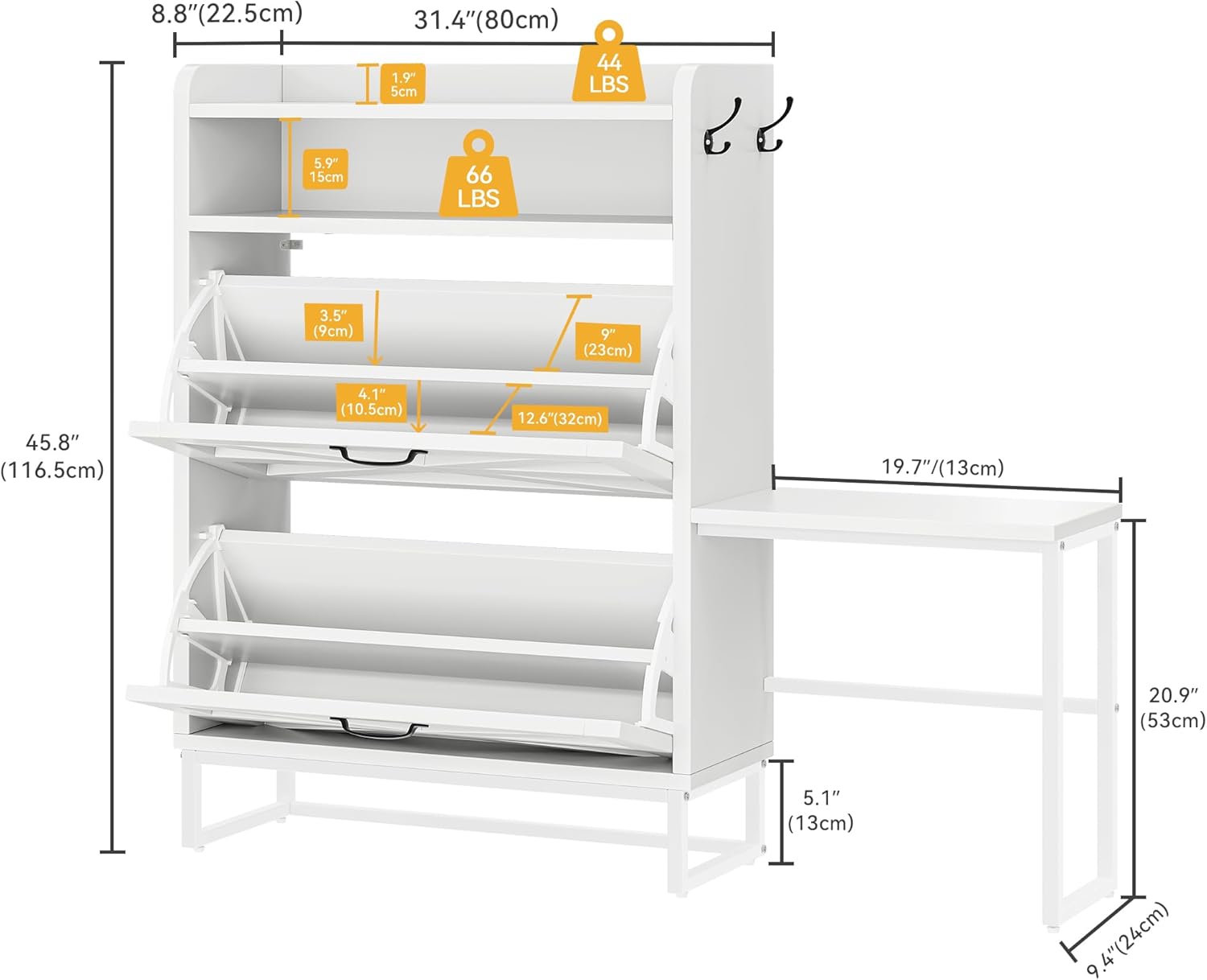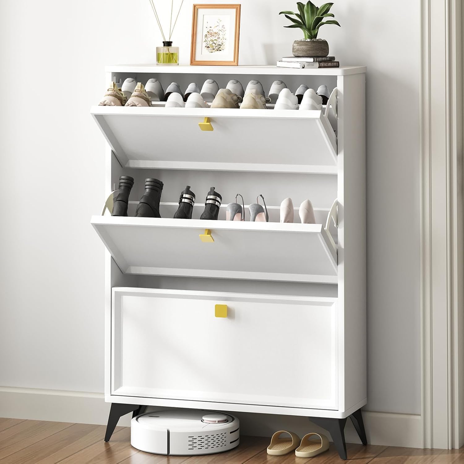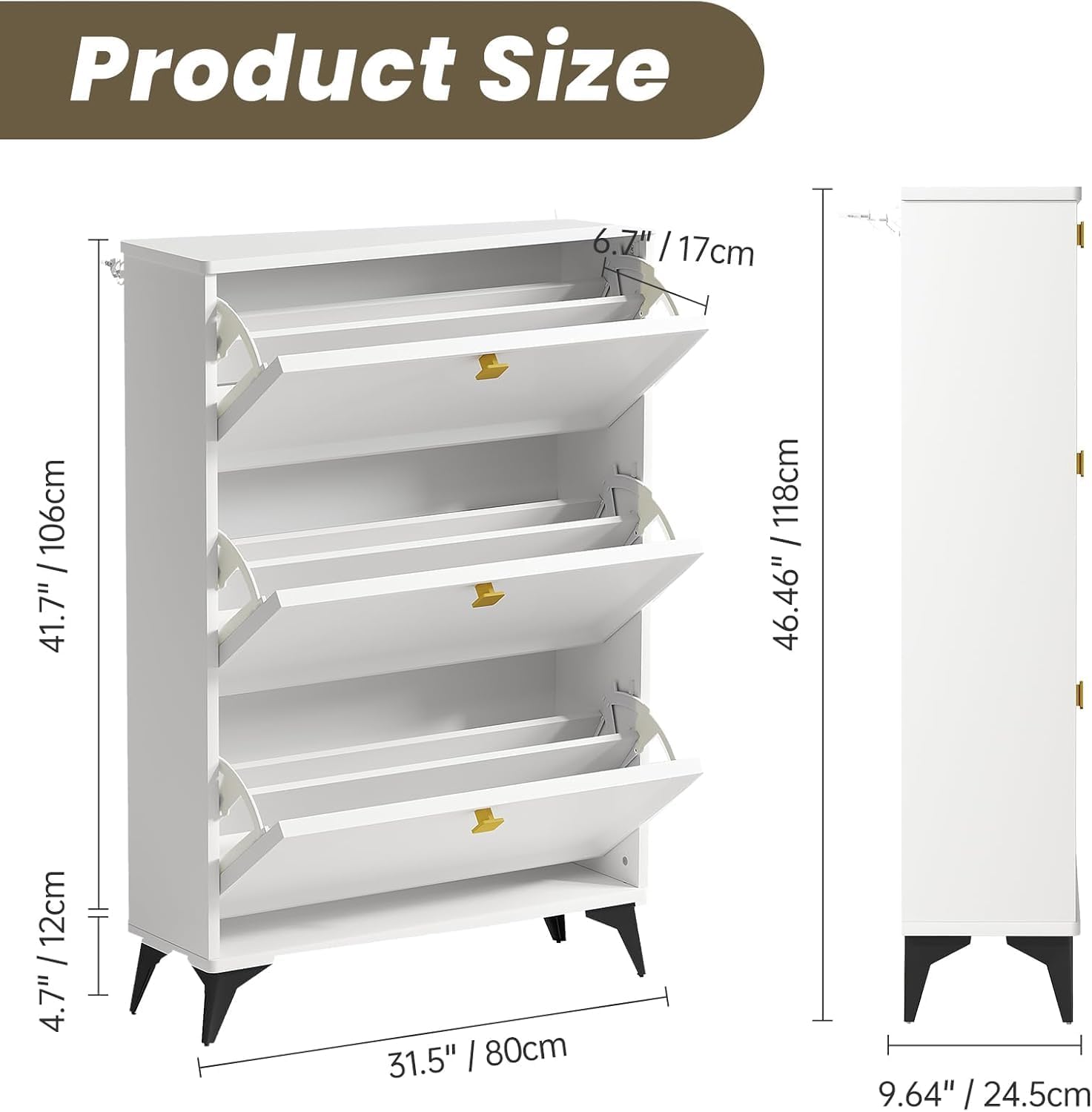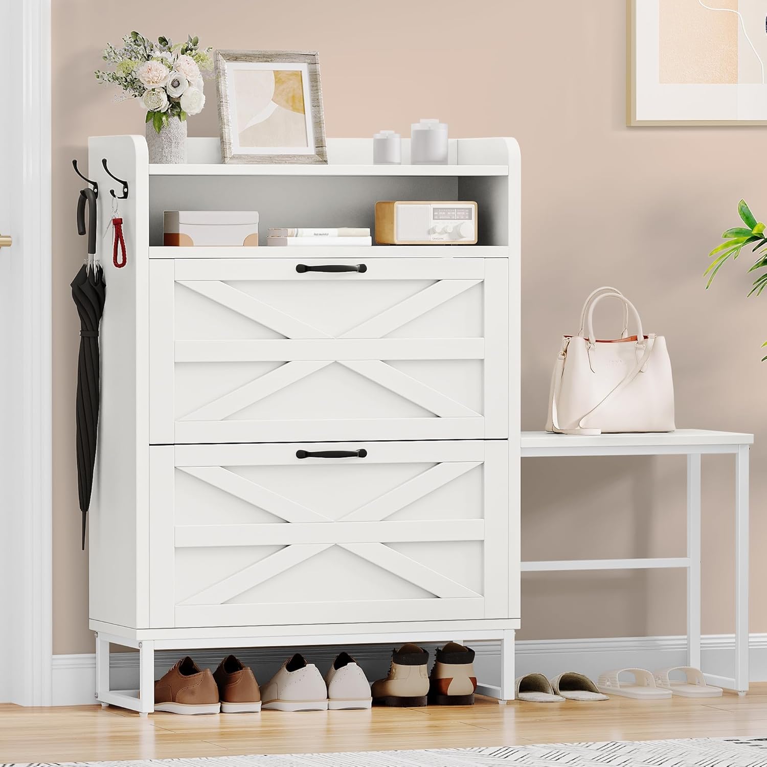 AWQM Shoe Cabinet, Wooden Freestanding Shoes Storage Cabinet with 2 Hidden FILP Drawers & Drawer Chest, Modern Narrow Shoe Organizer Cabinet for Entryway, Living Room, Hallway - White