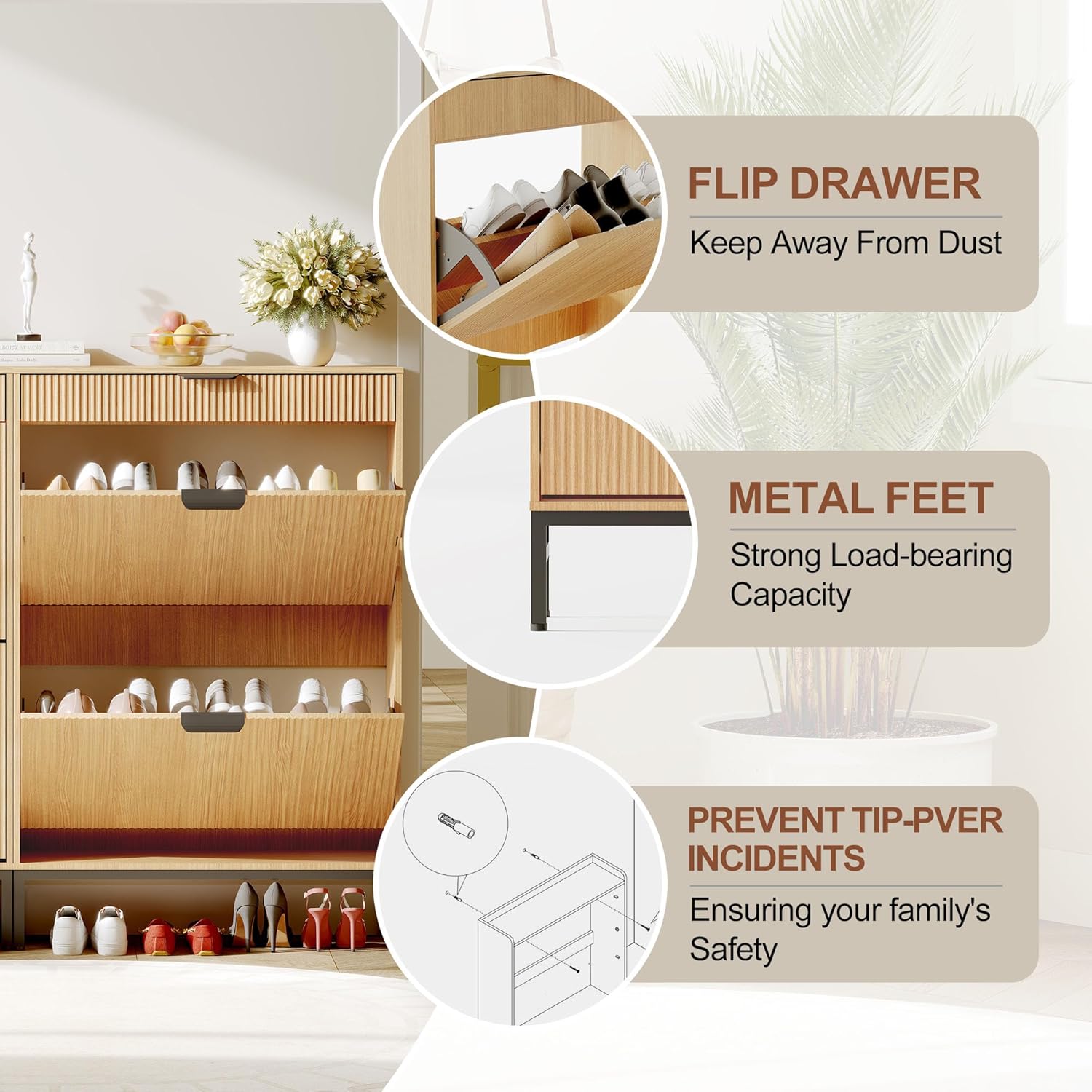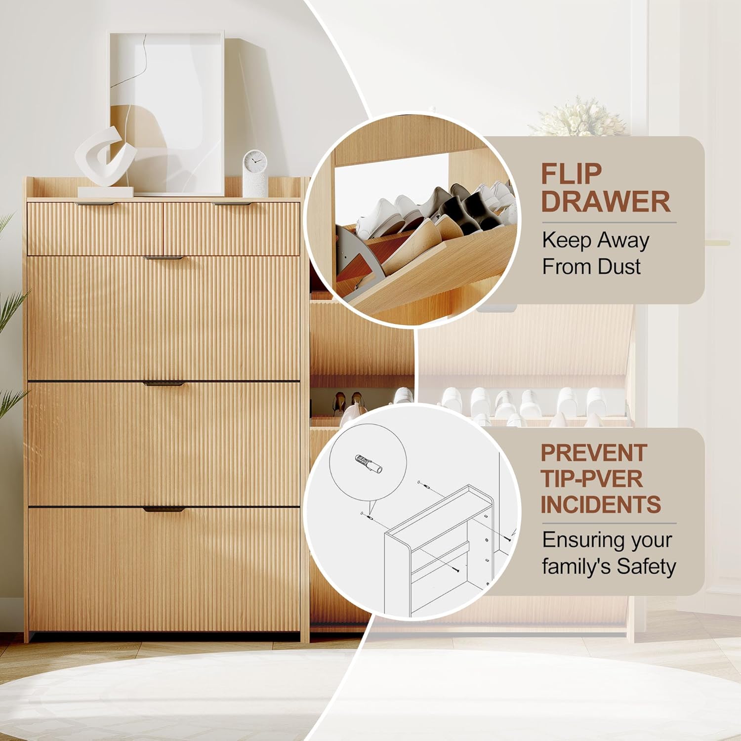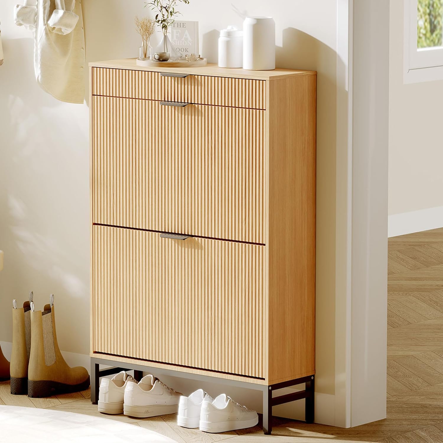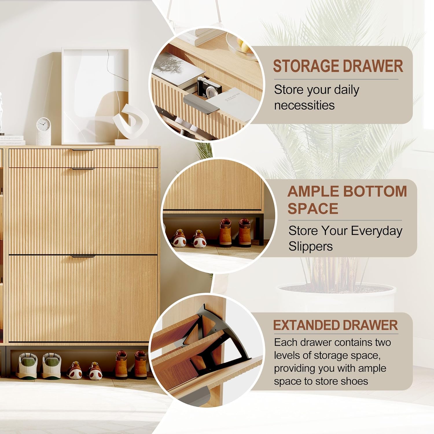 GarveeHome Wave Design Shoe Cabinet with 2 Flip Drawers, a Drawer, Fluted Shoe Cabinet Modern Narrow Shoe Storage, Wooden Shoe Organizer with Large Capacity, Hidden Shoe Racks for Entryway, Wood