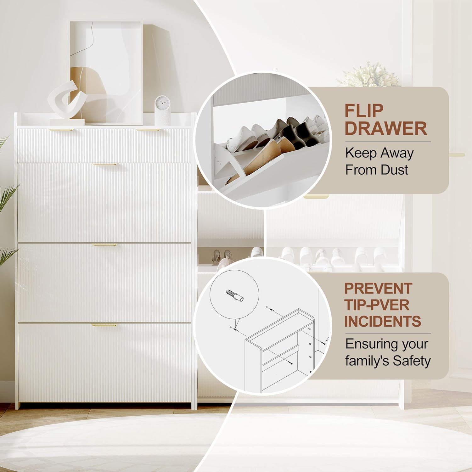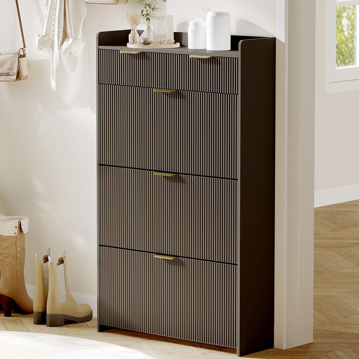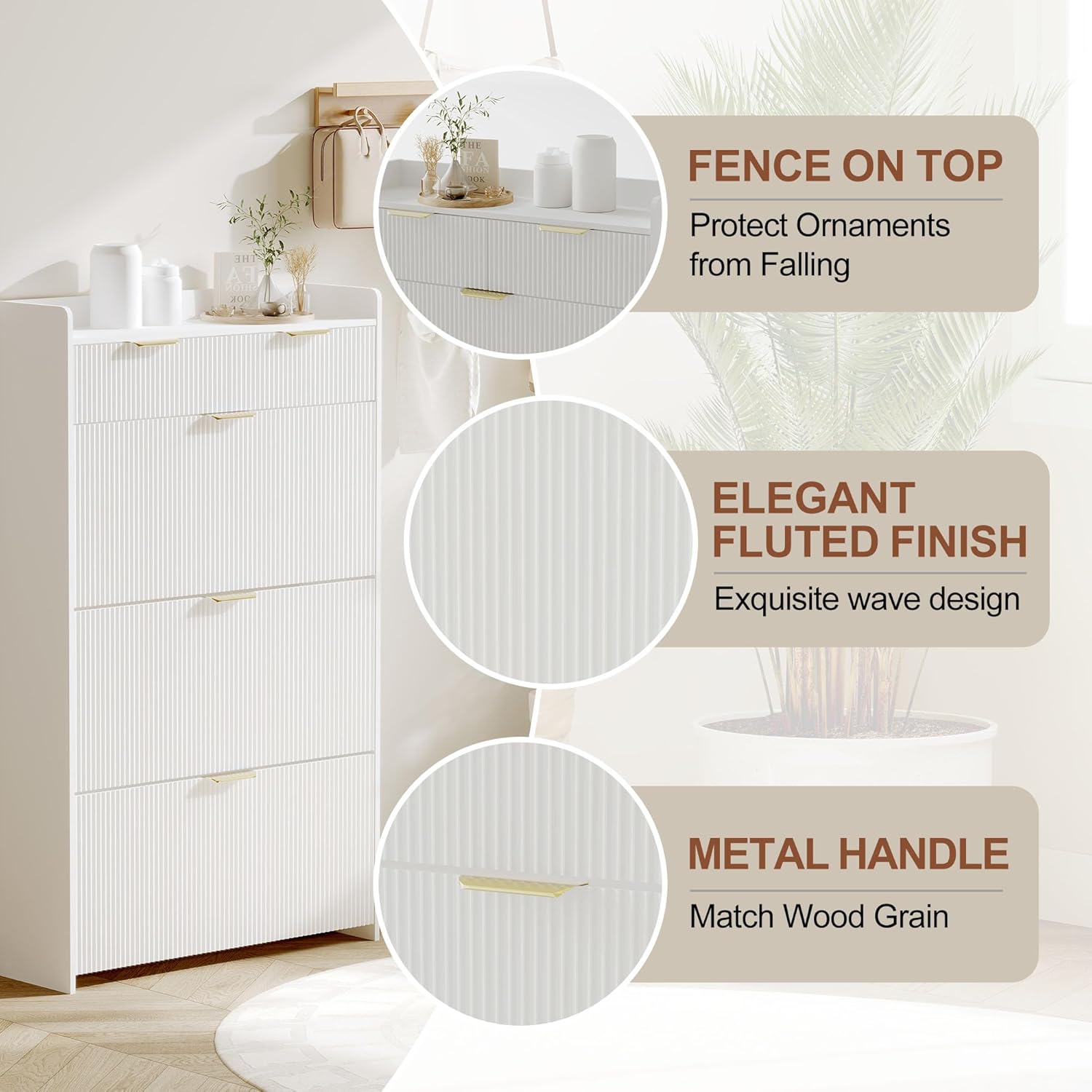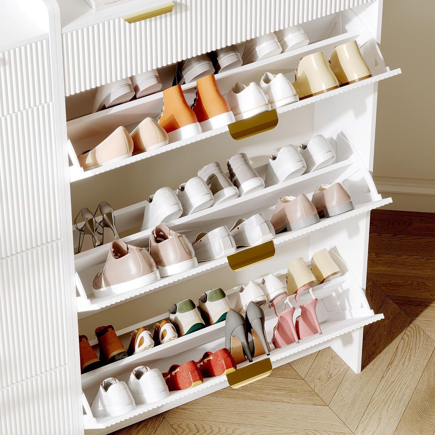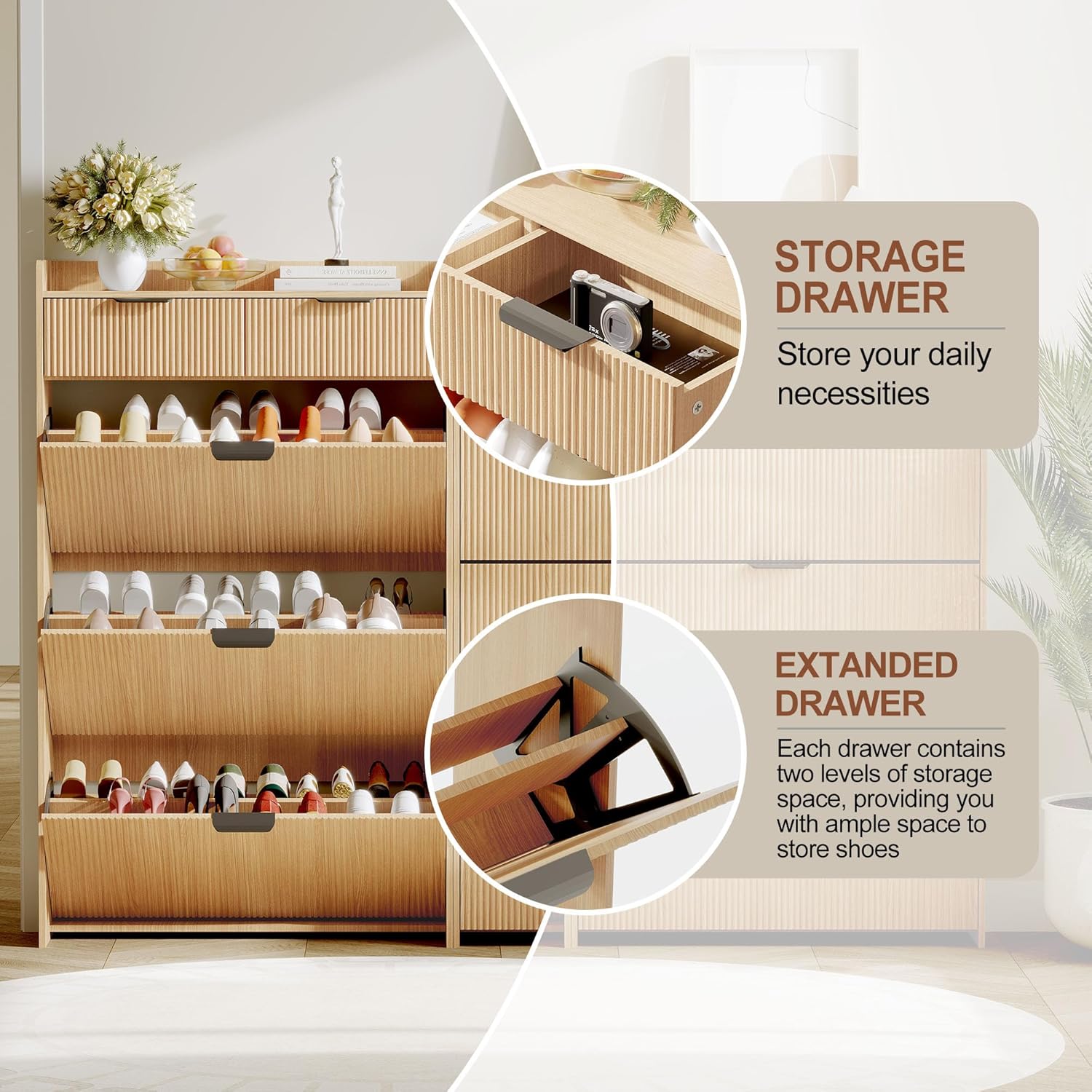 GarveeHome Wave Design Shoe Cabinet with 2 Flip Drawers, a Drawer, Fluted Shoe Cabinet Modern Narrow Shoe Storage, Wooden Shoe Organizer with Large Capacity, Hidden Shoe Racks for Entryway, Wood