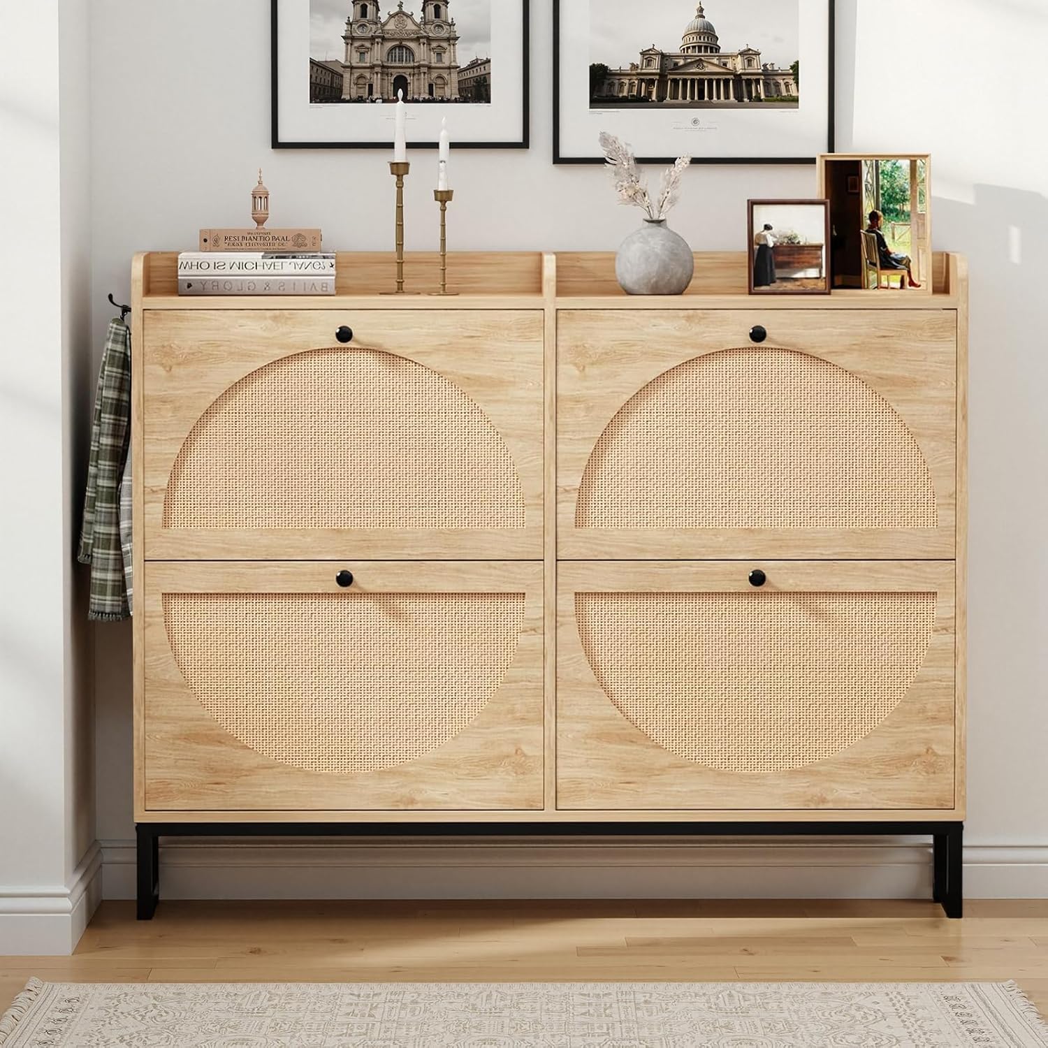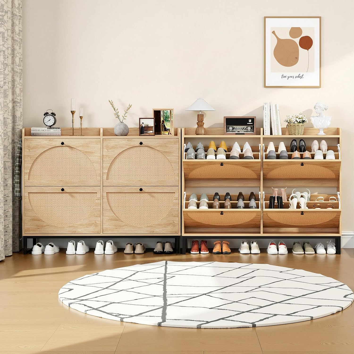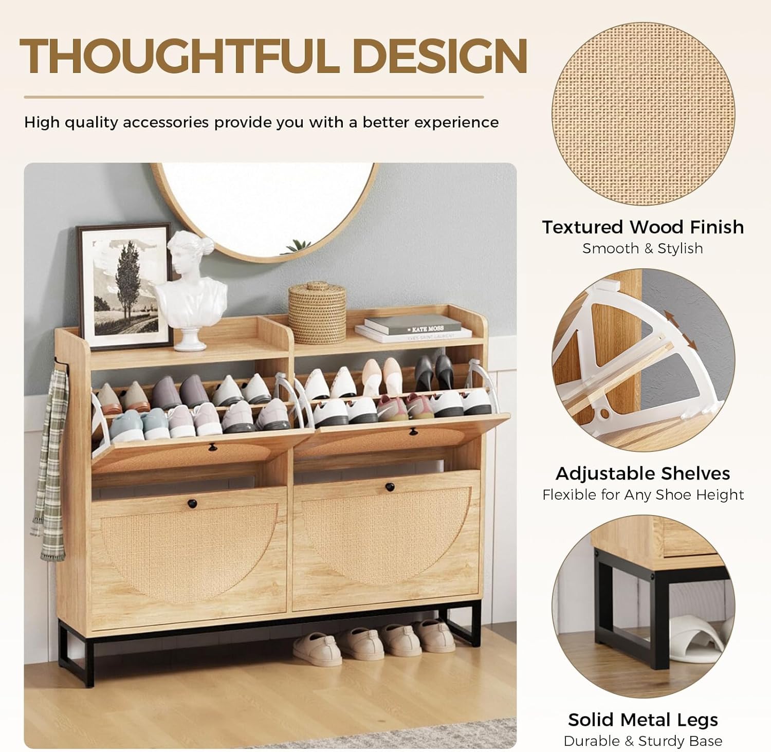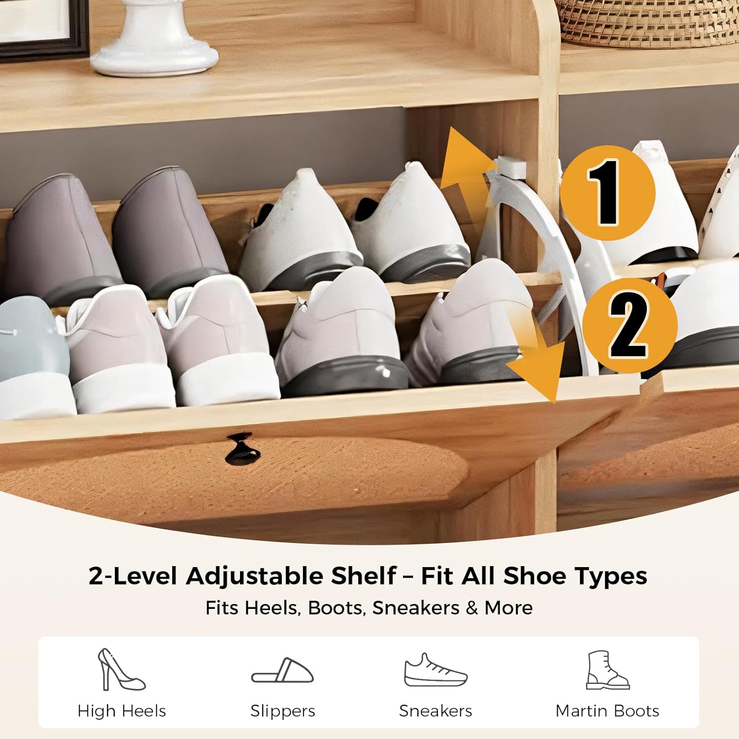 GarveeHome Wave Design Shoe Cabinet with 2 Flip Drawers, a Drawer, Fluted Shoe Cabinet Modern Narrow Shoe Storage, Wooden Shoe Organizer with Large Capacity, Hidden Shoe Racks for Entryway, Wood
