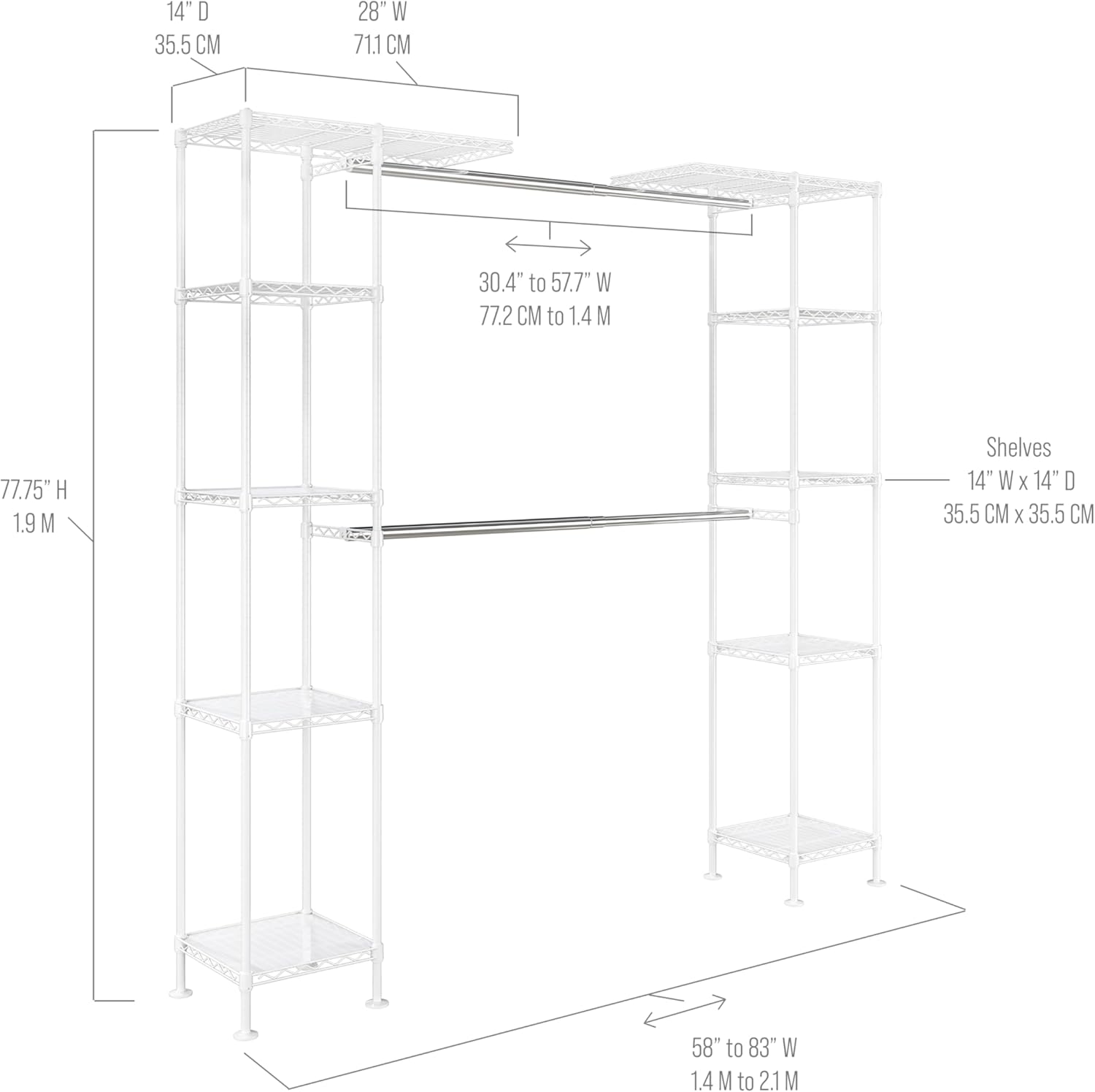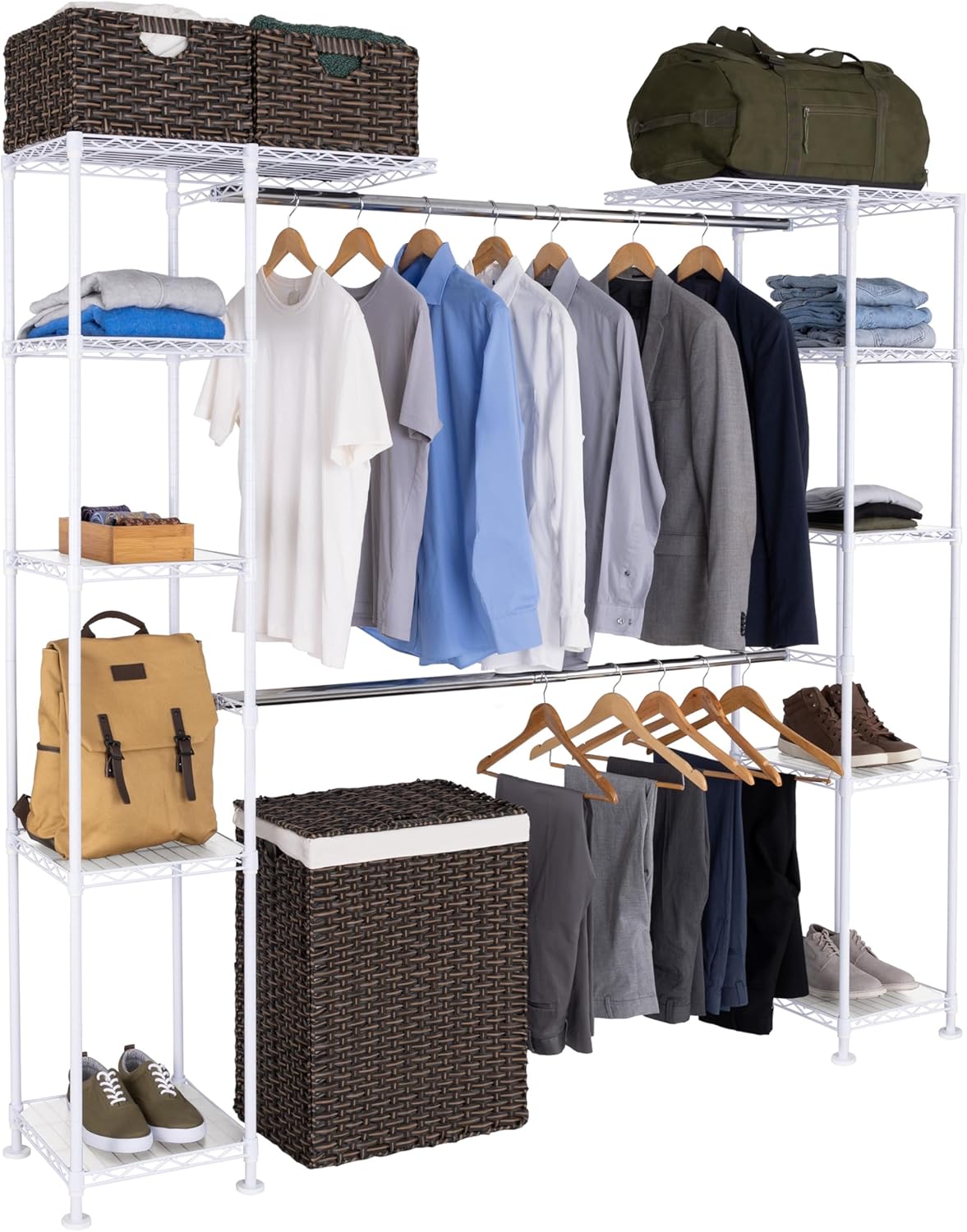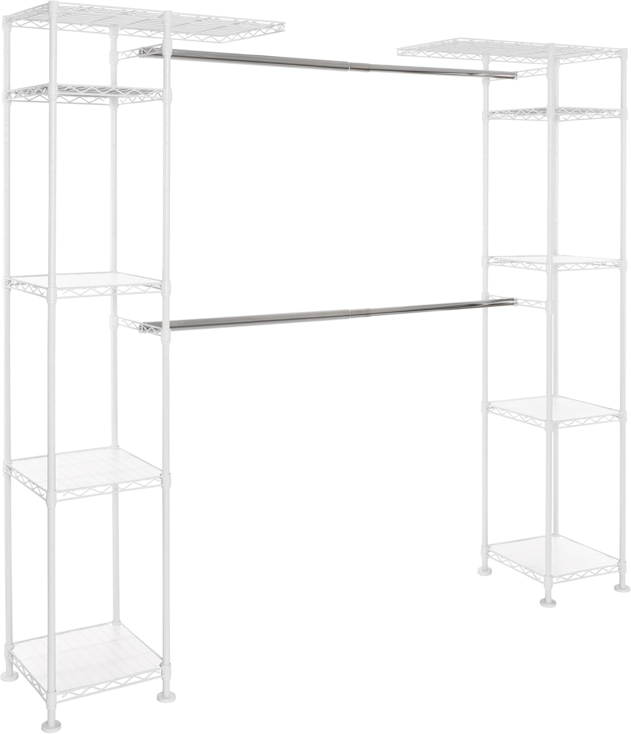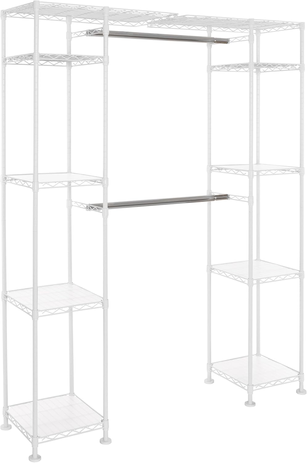 Seville Classics Closet Garment Organizer with Metal Hanging Rod Wardrobe Storage System, w/ Steel Shelves for Clothes, Shirts, Jackets, Coats, Blankets, Shoes, White, Expandable Rack