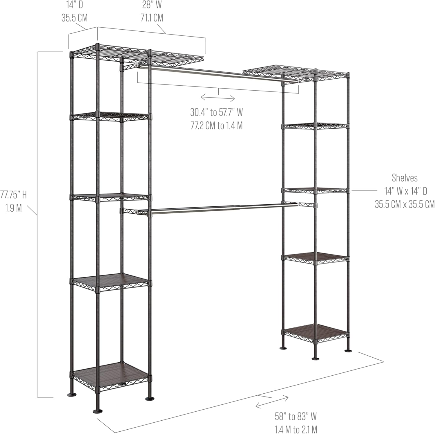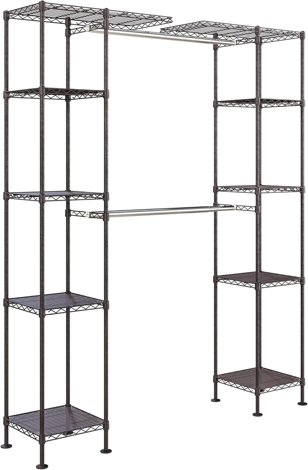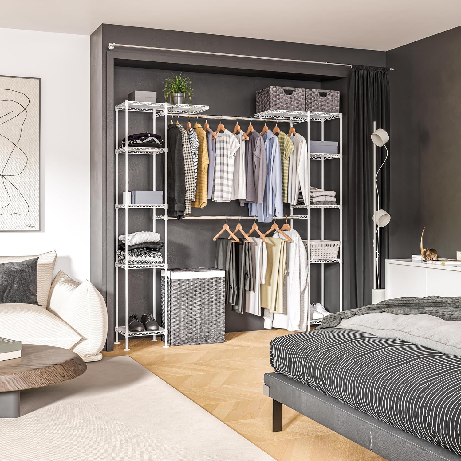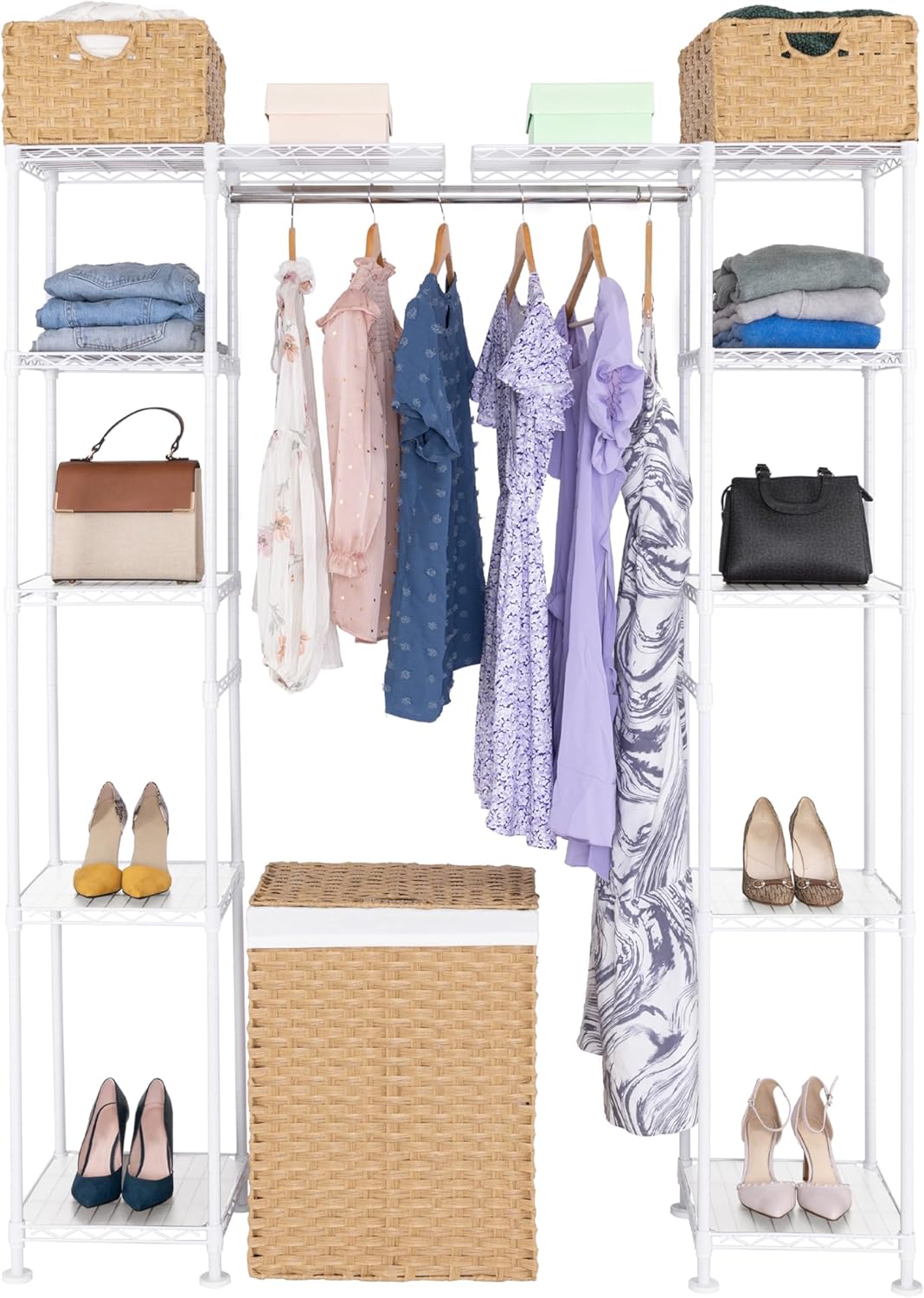 Seville Classics Closet Garment Organizer with Metal Hanging Rod Wardrobe Storage System, w/ Steel Shelves for Clothes, Shirts, Jackets, Coats, Blankets, Shoes, White, Expandable Rack