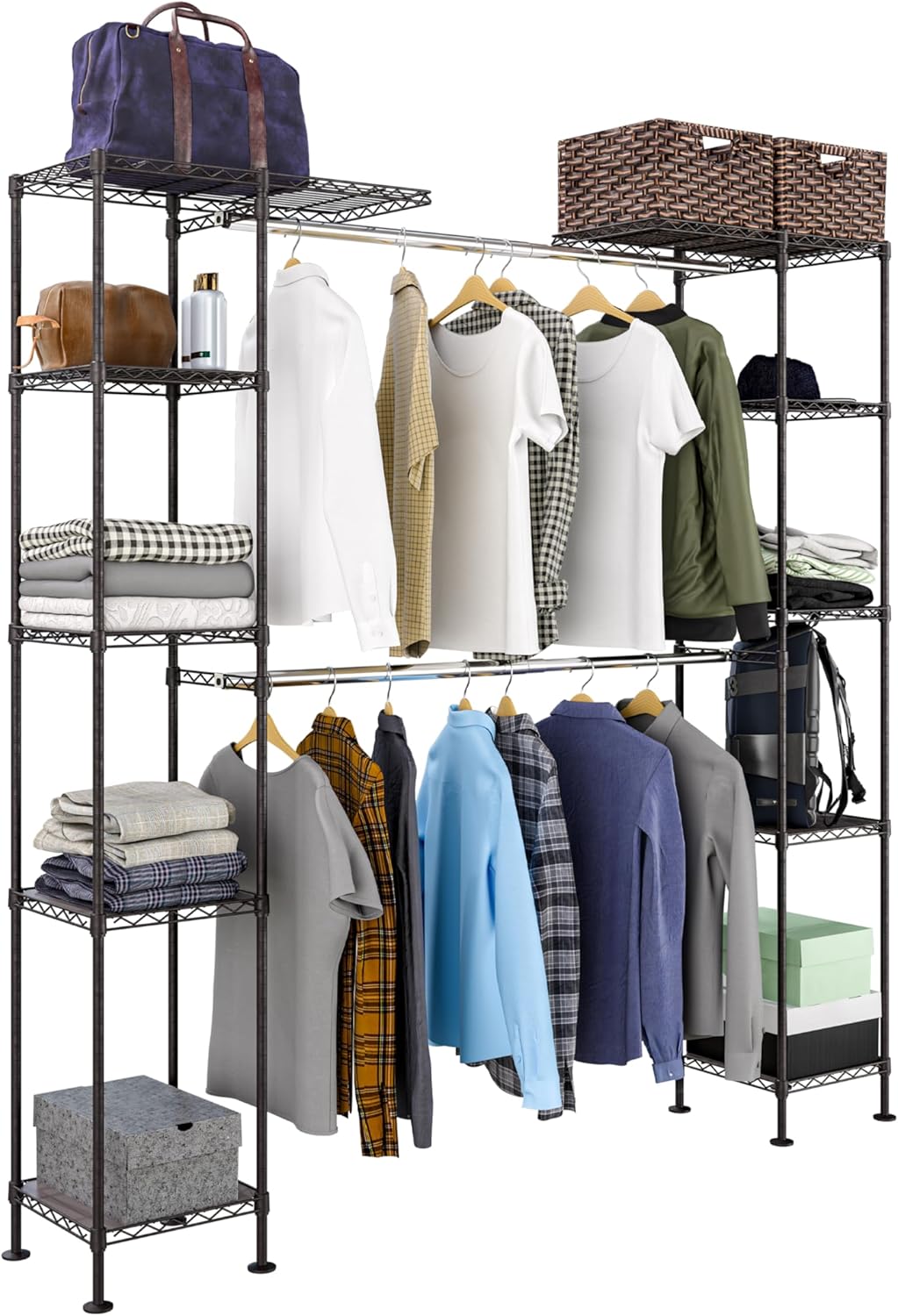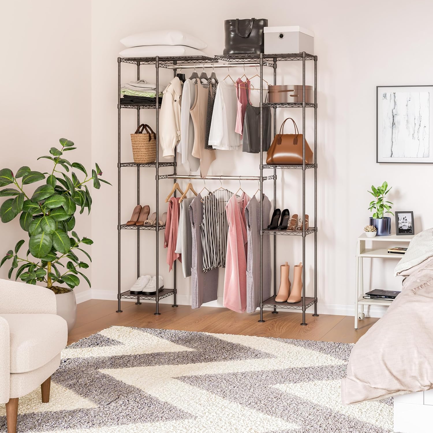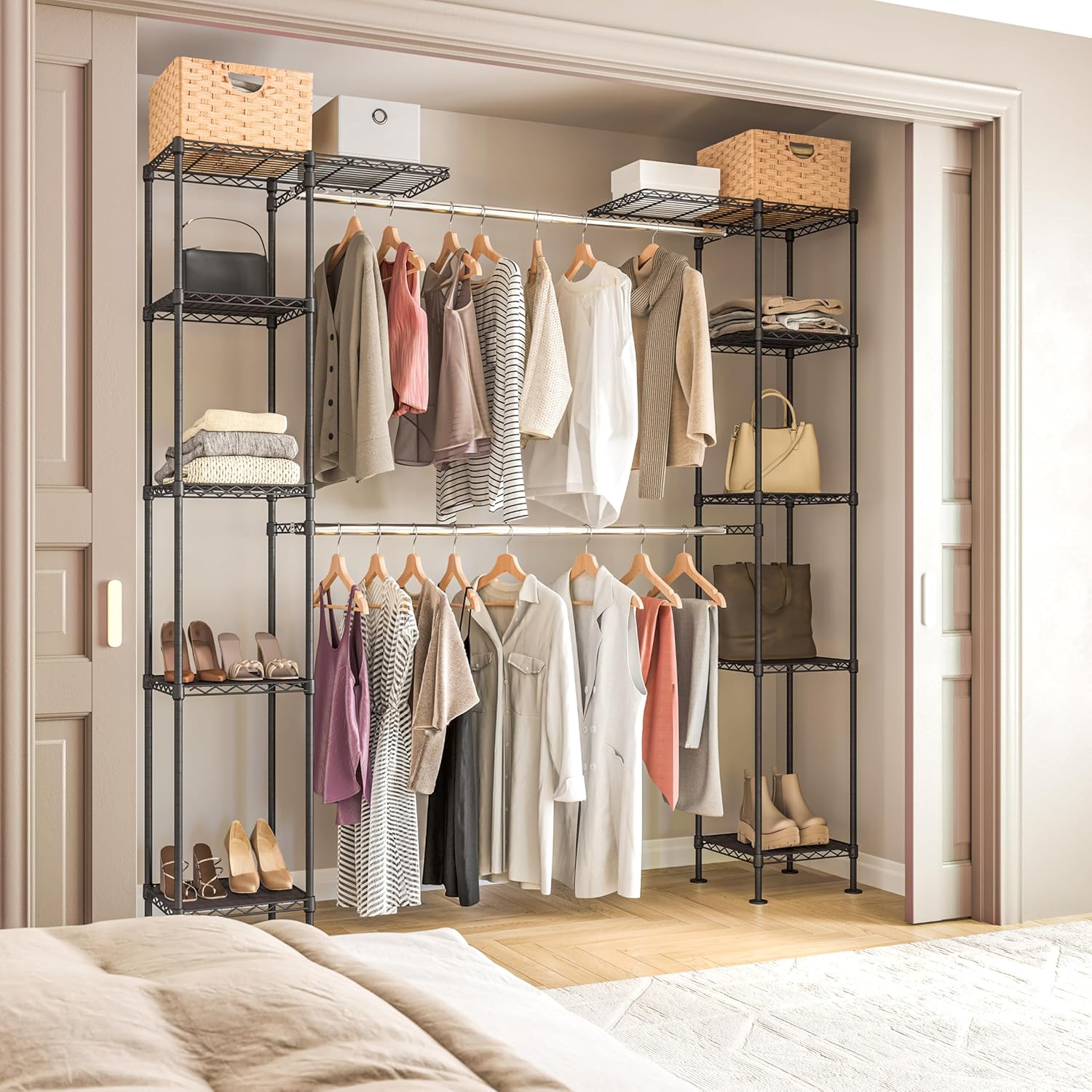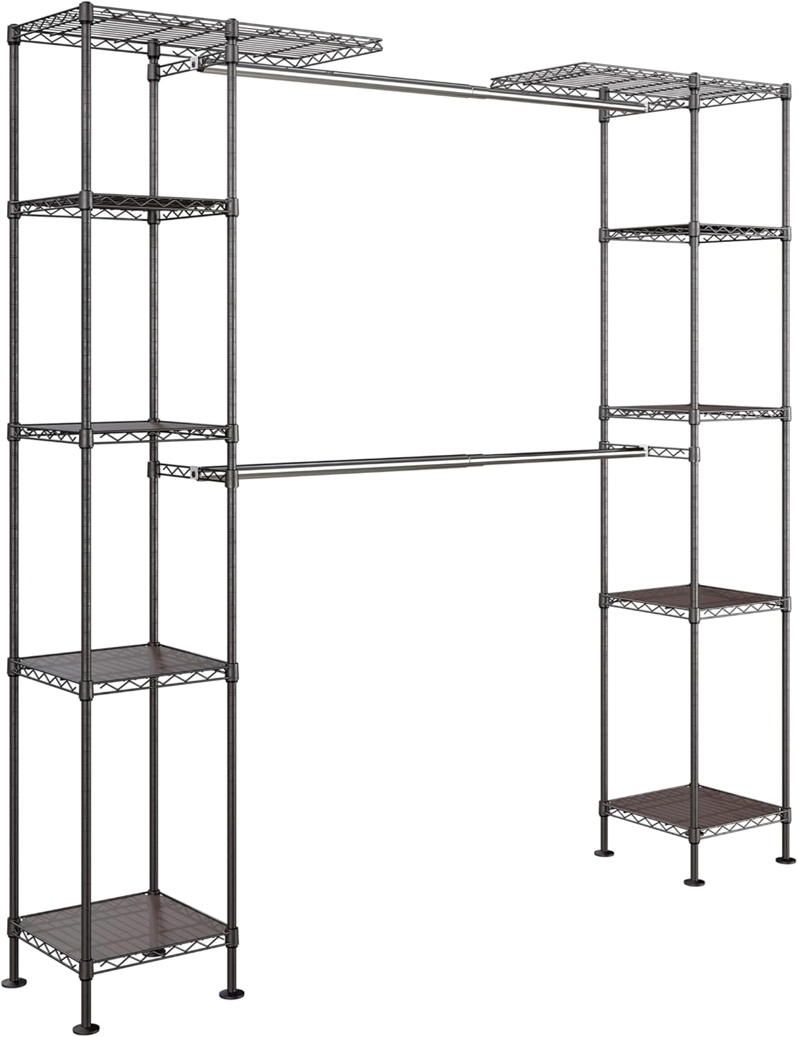 Seville Classics Closet Garment Organizer with Metal Hanging Rod Wardrobe Storage System, w/ Steel Shelves for Clothes, Shirts, Jackets, Coats, Blankets, Shoes, White, Expandable Rack
