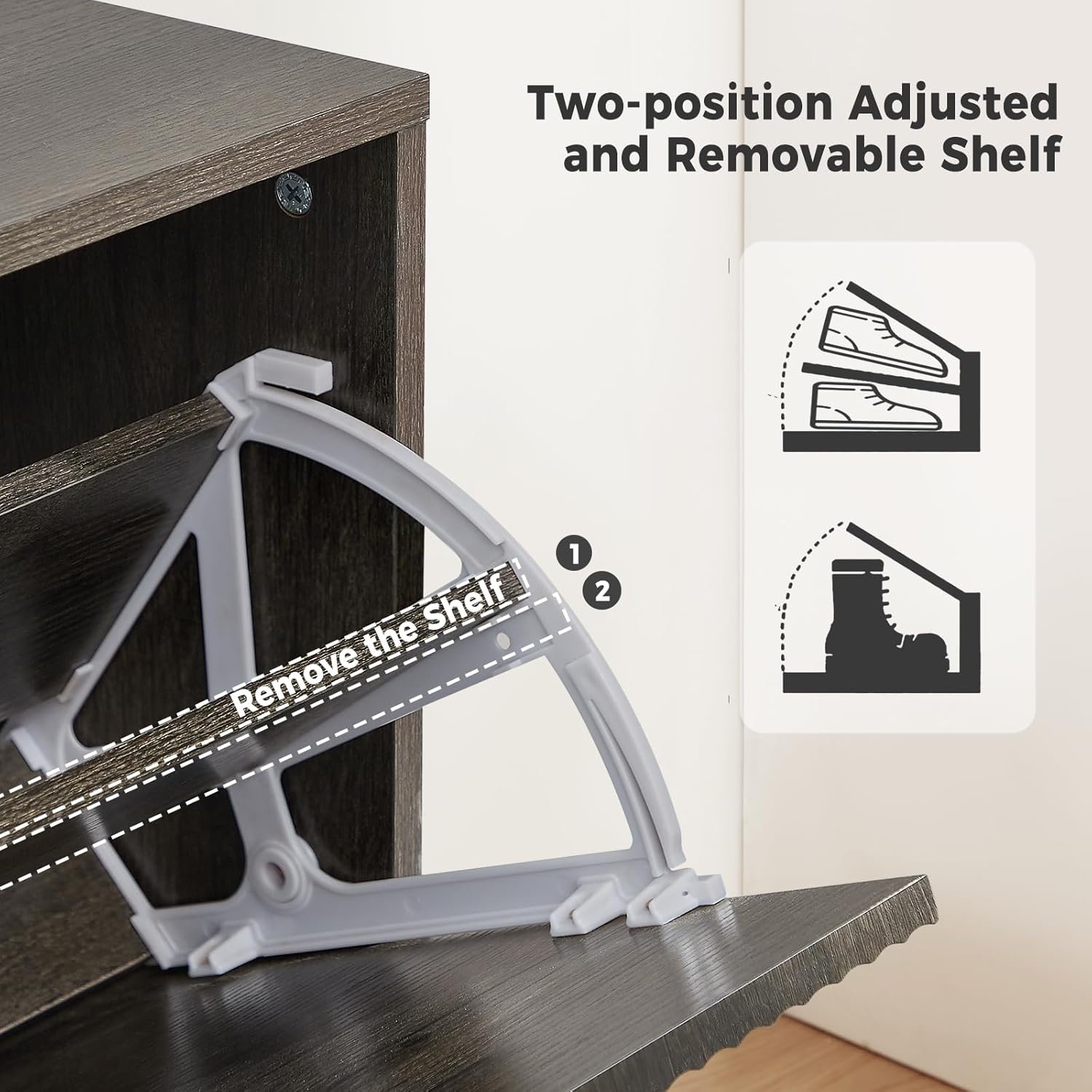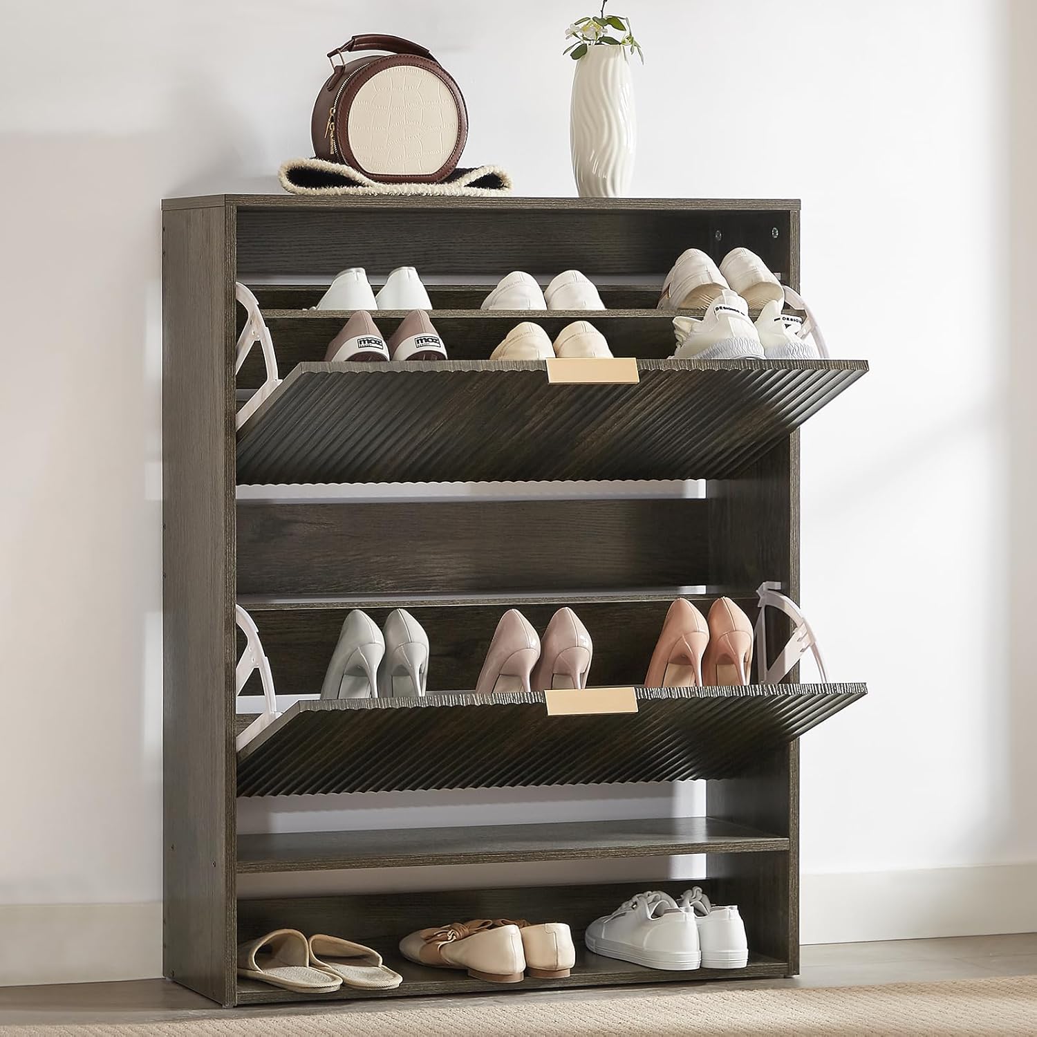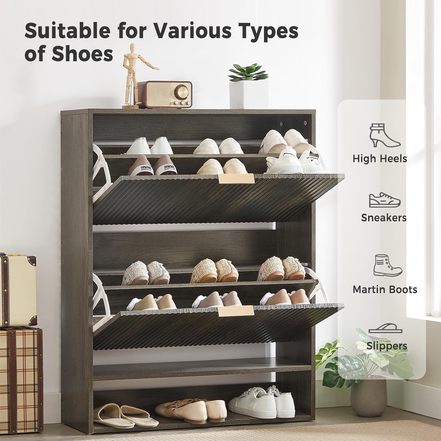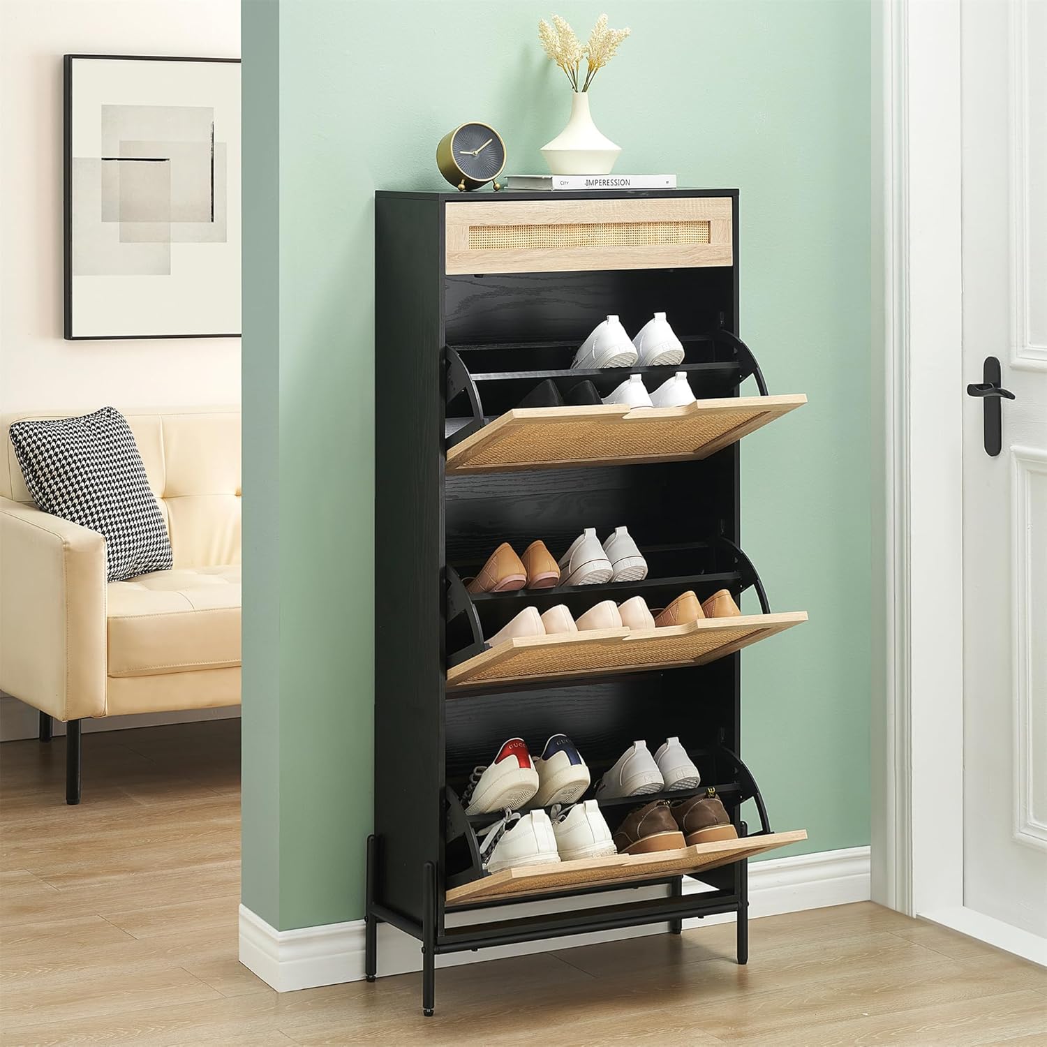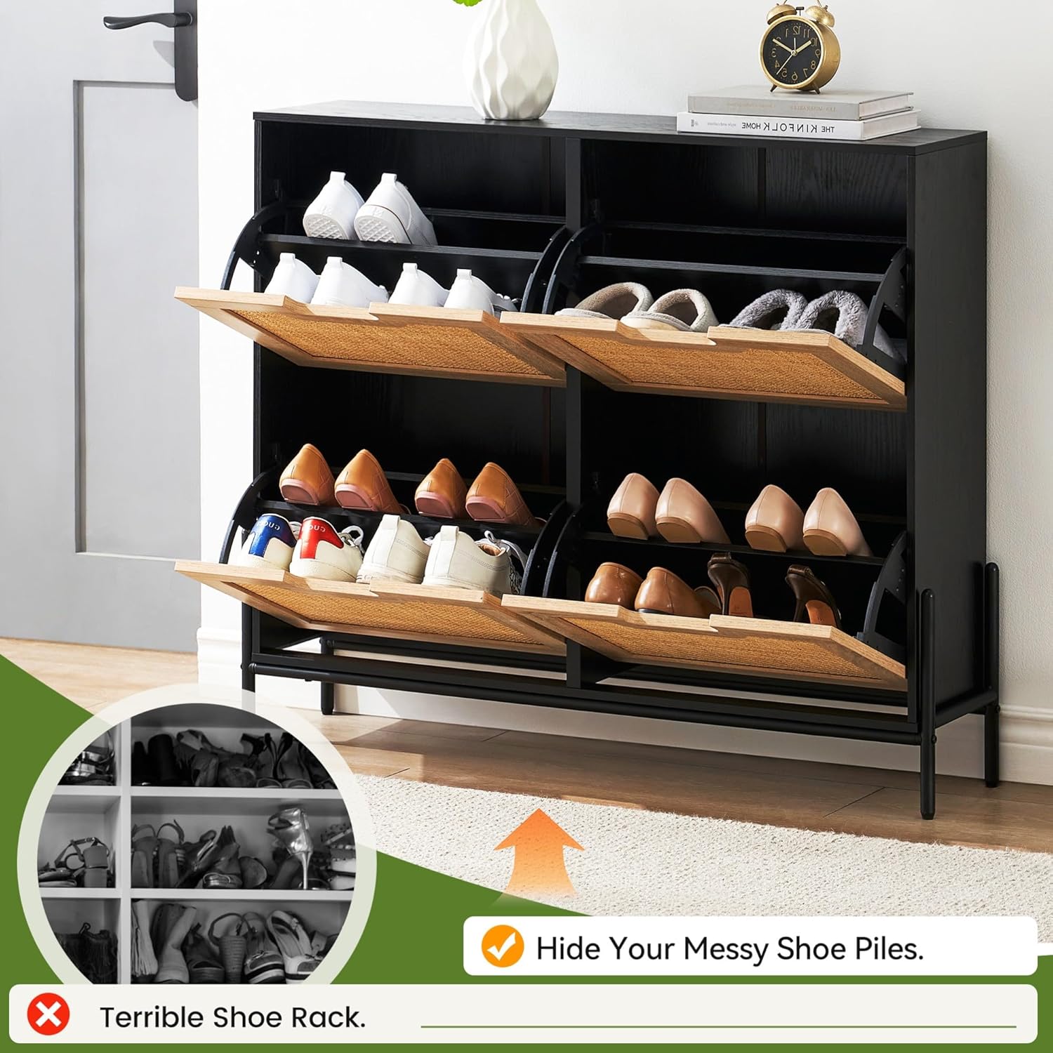 GAOMON Natural Rattan 4 Flip Door Shoe Rack Storage Cabinet, Shoe Cabinet Organizer Freestanding with 3-Tier Adjustable Shelves for Entryway, Entrance Hallway (4 Flip Doors, Black)