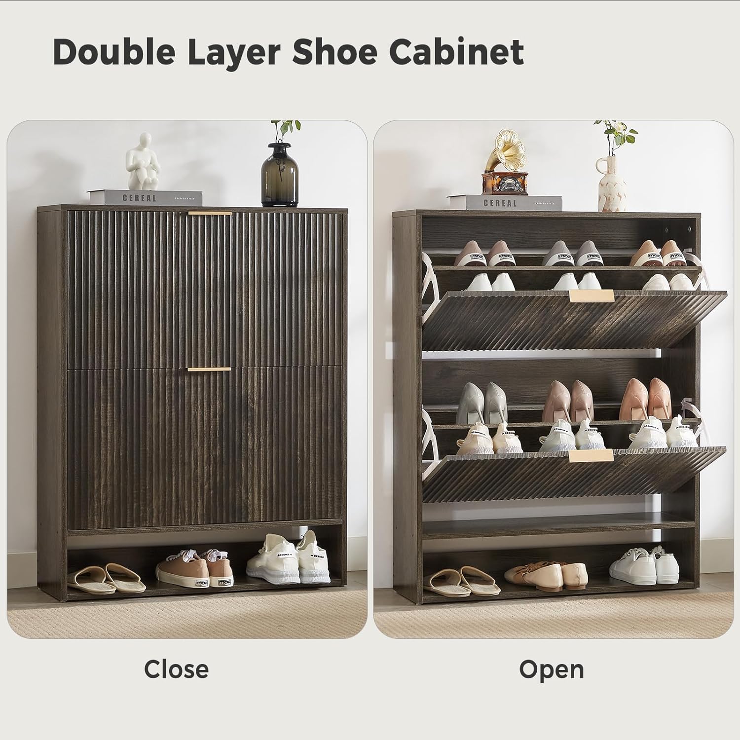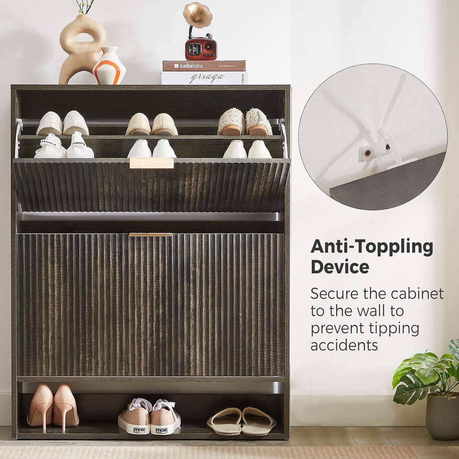 Unovivy 31.5''W Black Slim Shoe Cabinet, Fluted Modern Hidden Free Standing Shoe Rack Storage Organizer Cabinet with 2 Flip Drawers, Wood Mid Century for Entryway, Hallway