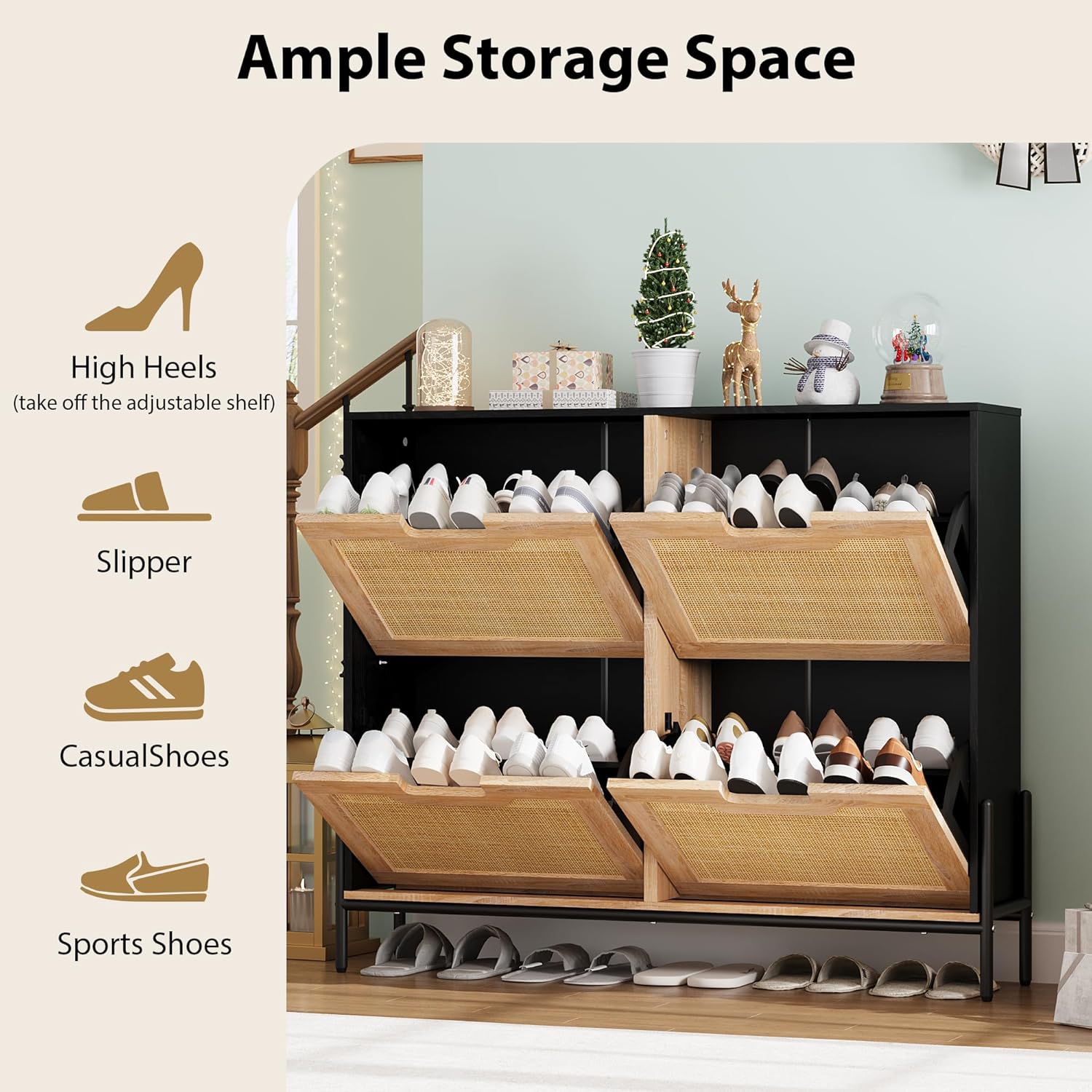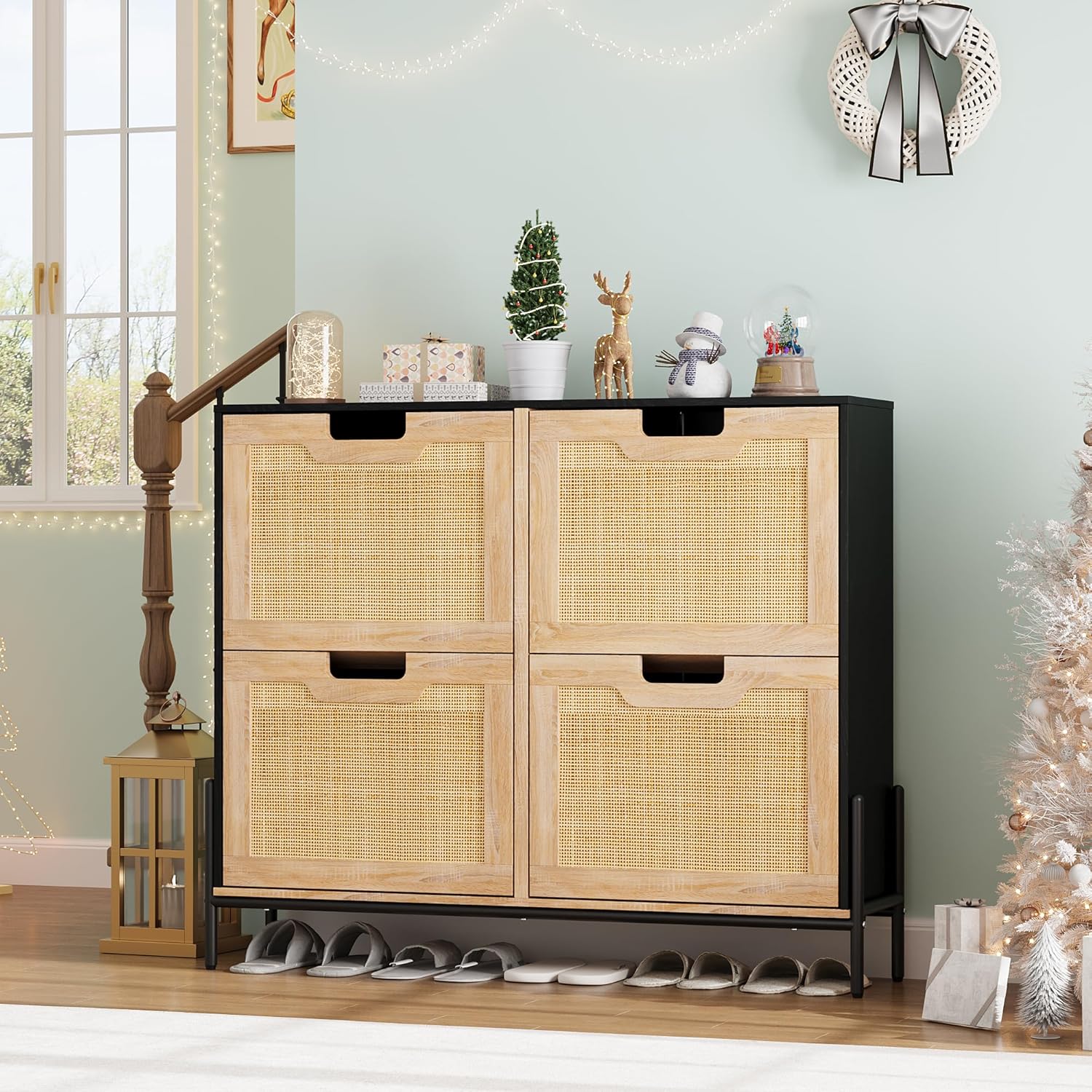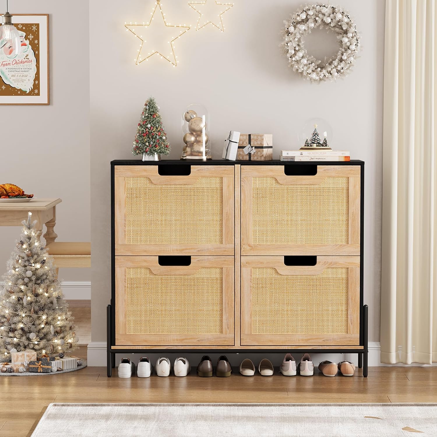 GarveeHome Natural 4 Flip Door Entrance Shoe Cabinet Freestanding, Rattan Storage Cabinet with 3-Tier Adjustable Shelves for Entryway, Entrance Hallway, Entry Way Cabinet with Storage, White