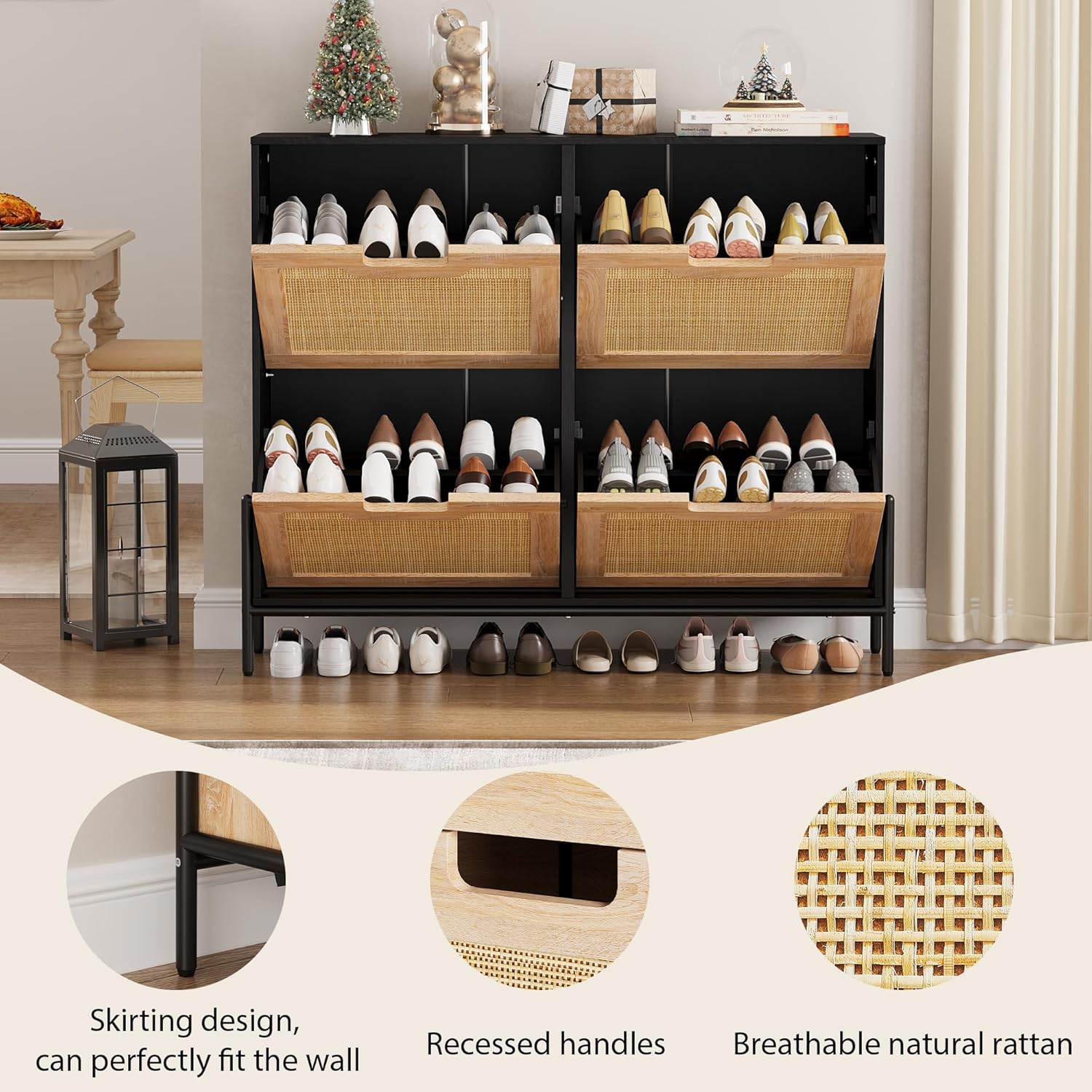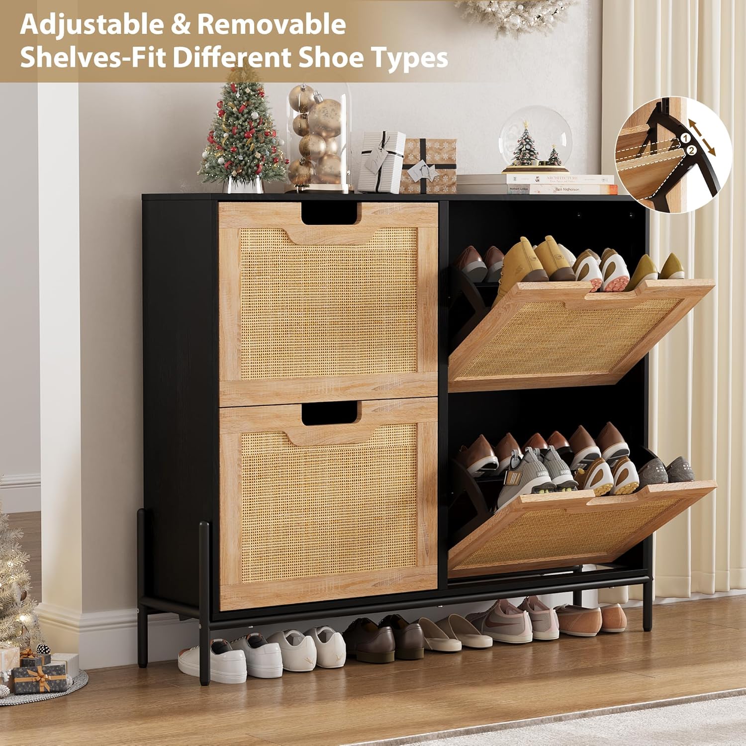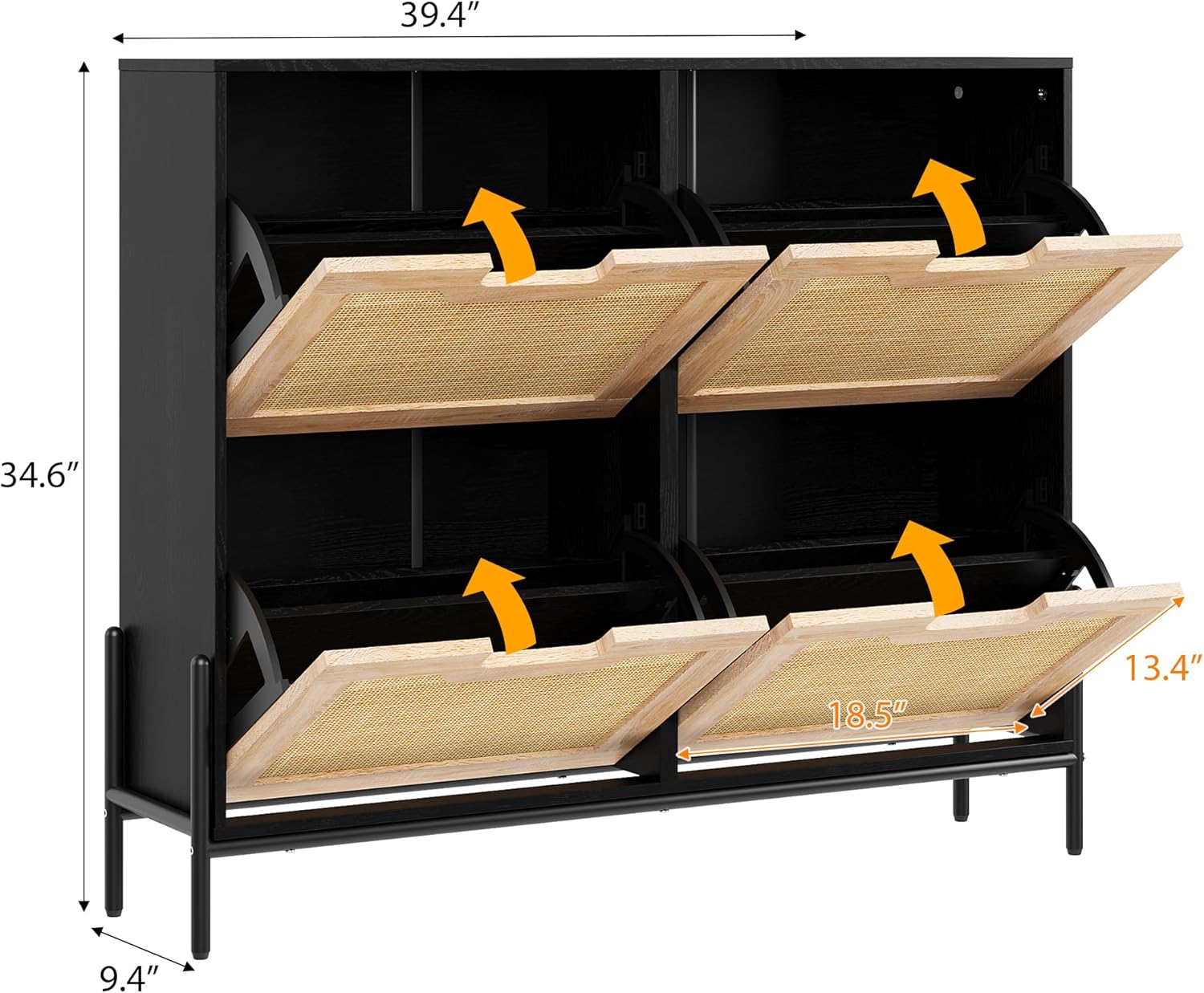 GarveeHome Natural 4 Flip Door Entrance Shoe Cabinet Freestanding, Rattan Storage Cabinet with 3-Tier Adjustable Shelves for Entryway, Entrance Hallway, Entry Way Cabinet with Storage, White