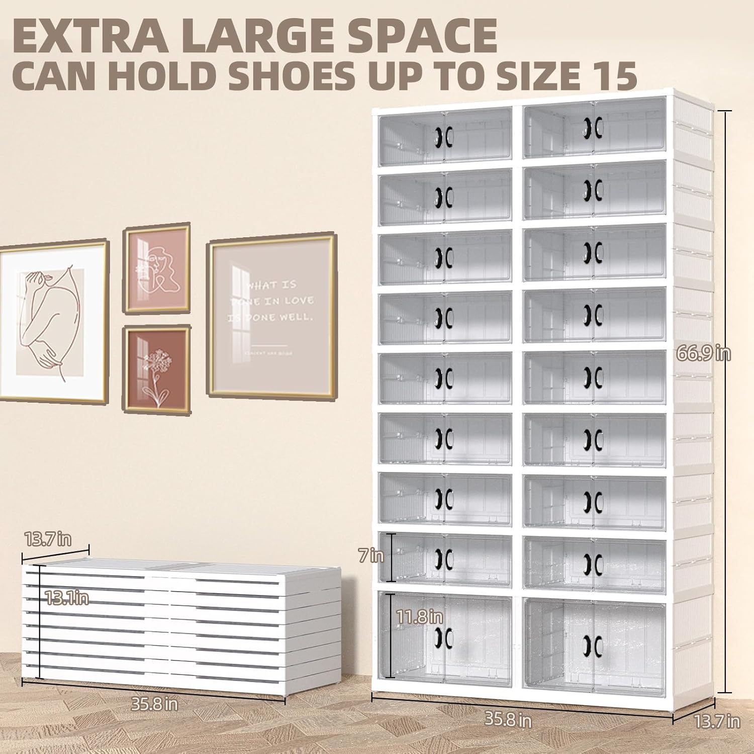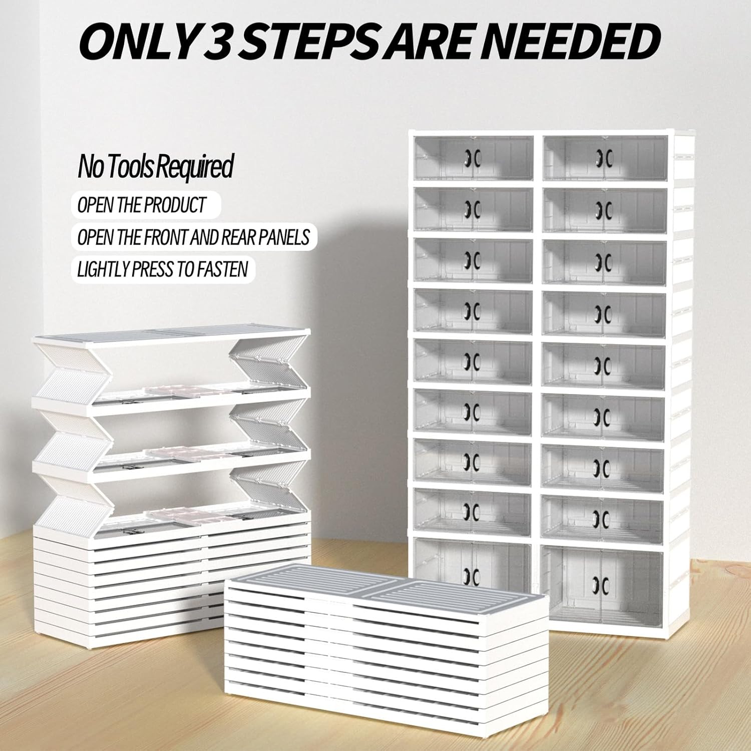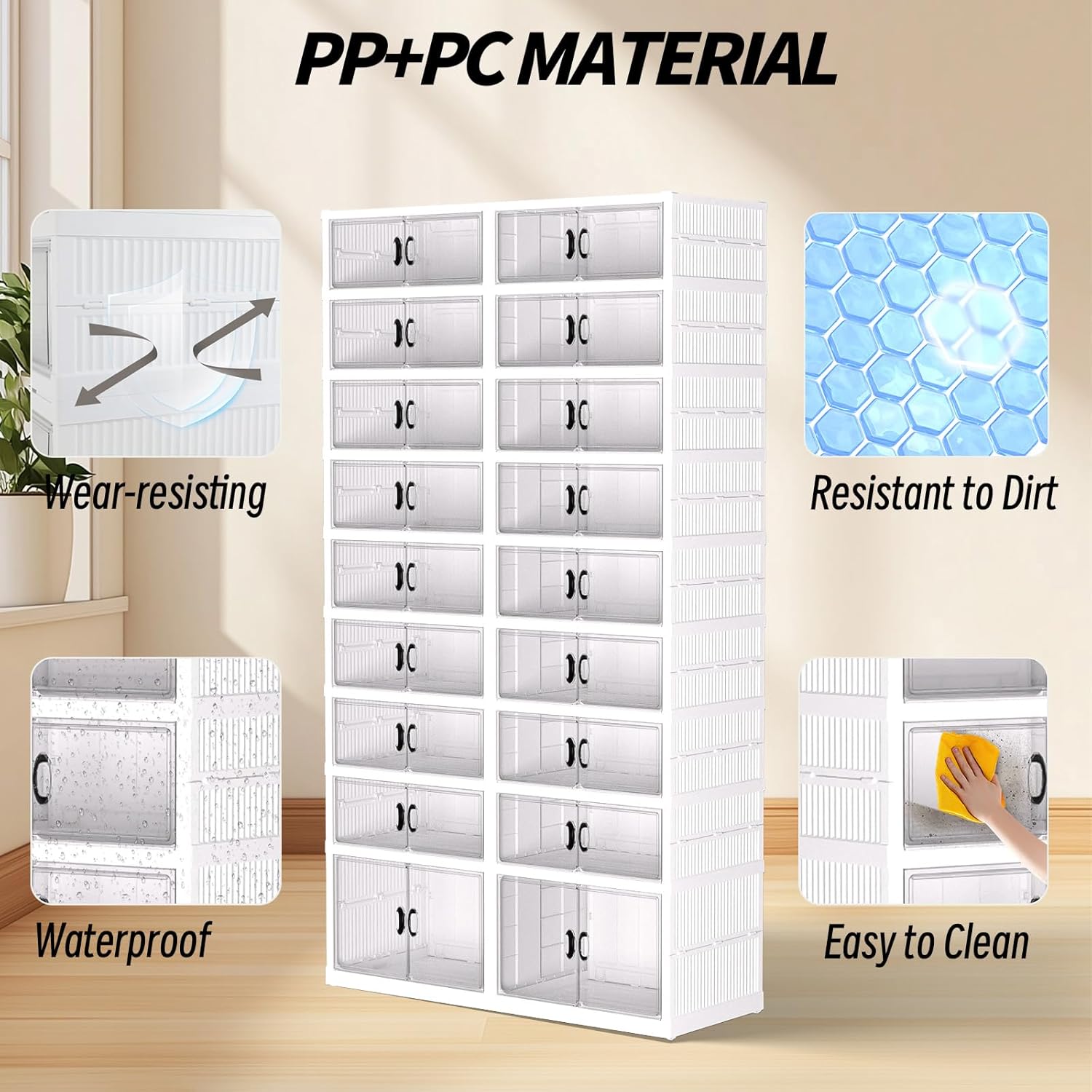 AntBox Portable Shoe Rack Organizer, Stackable Sneaker Organizer Cabinet with Magnetic Door, Folding Design, Clear Plastic Storage Container, 10 Tier 20 Pairs (Clear) - S2-S20-D10(C)