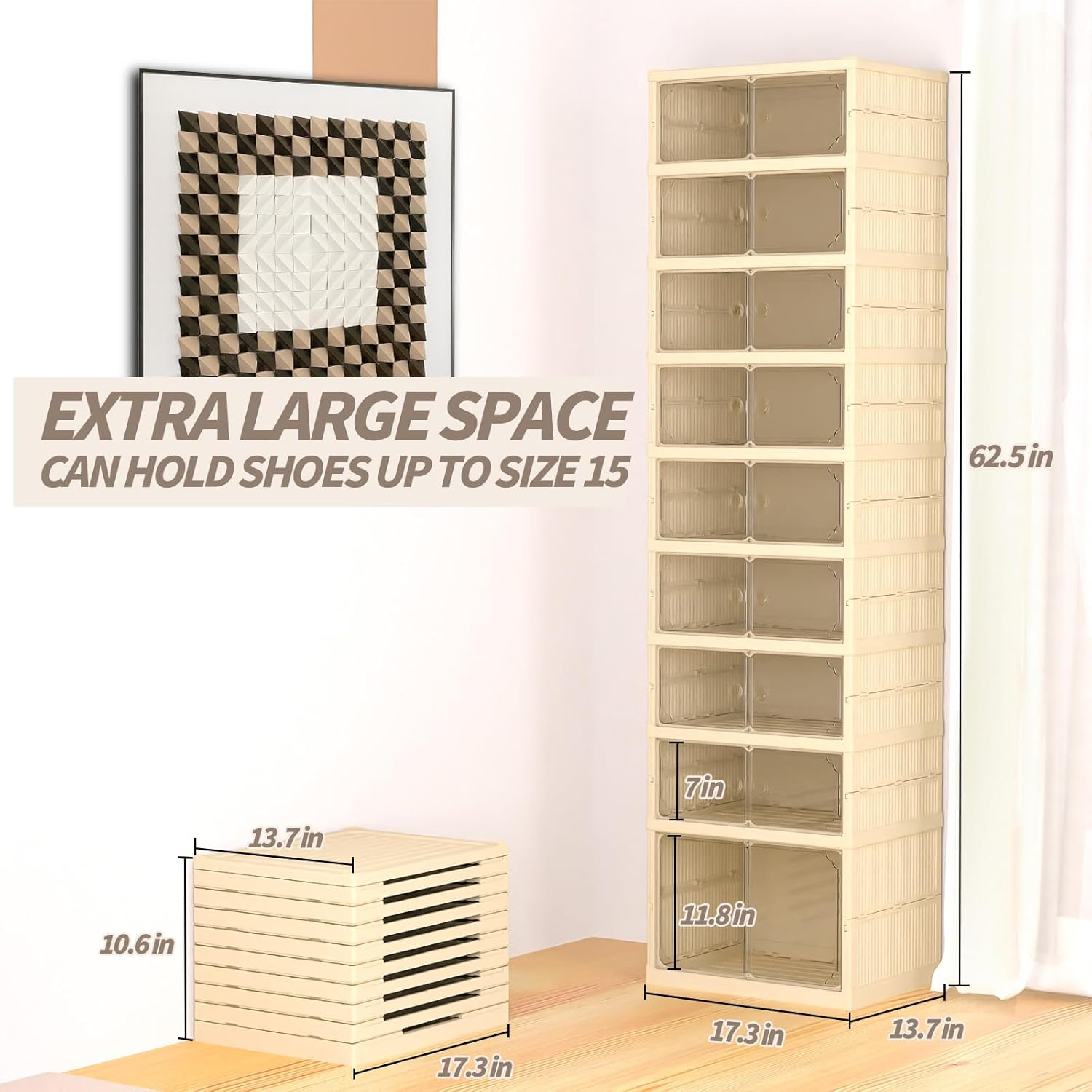 9 Tier 36 Pair Folding Shoe Rack with Wheels and Magnetic Doors,Stackable Transparent Shoe Cabinet Shoe Organizer Storage for Closet Entryway Bedroom