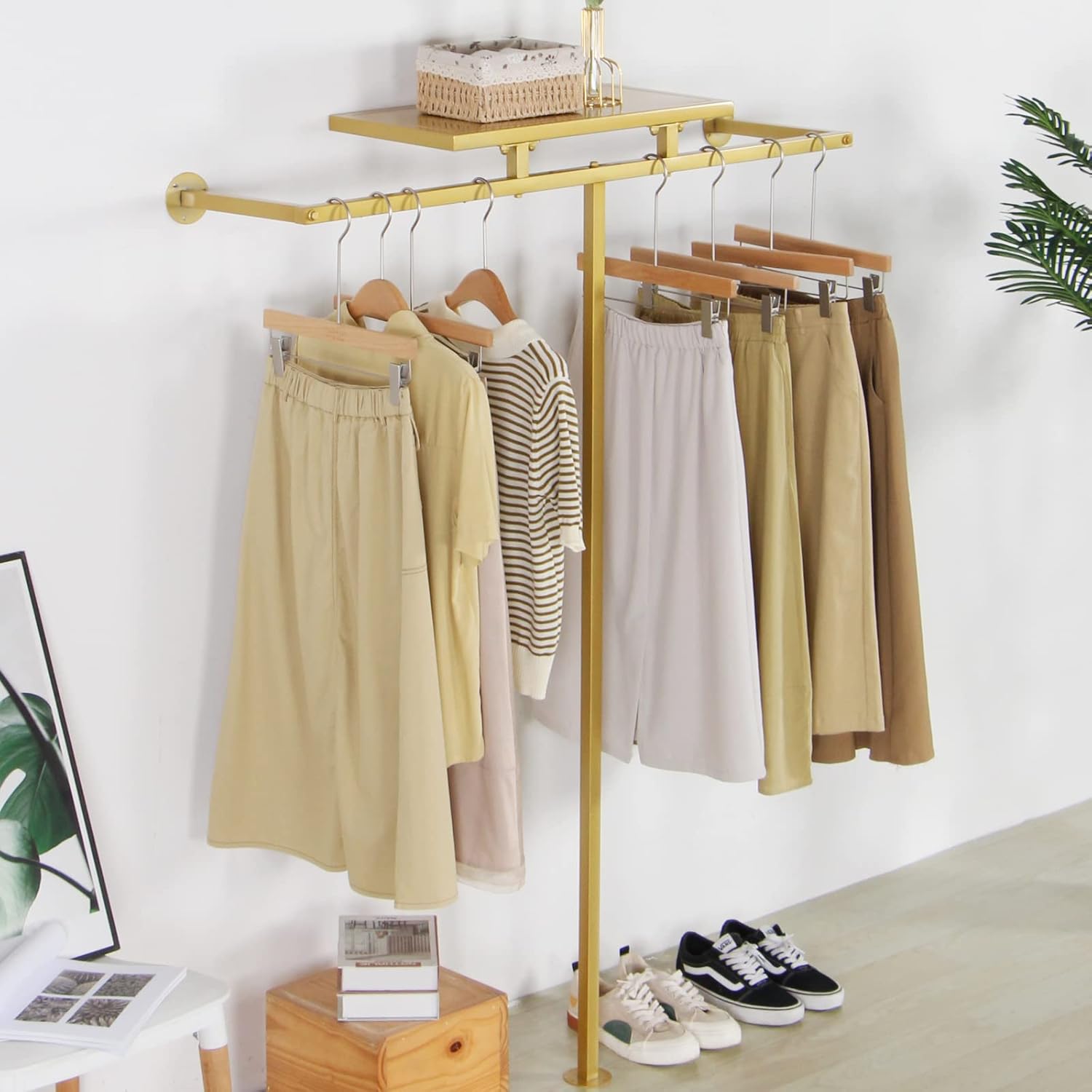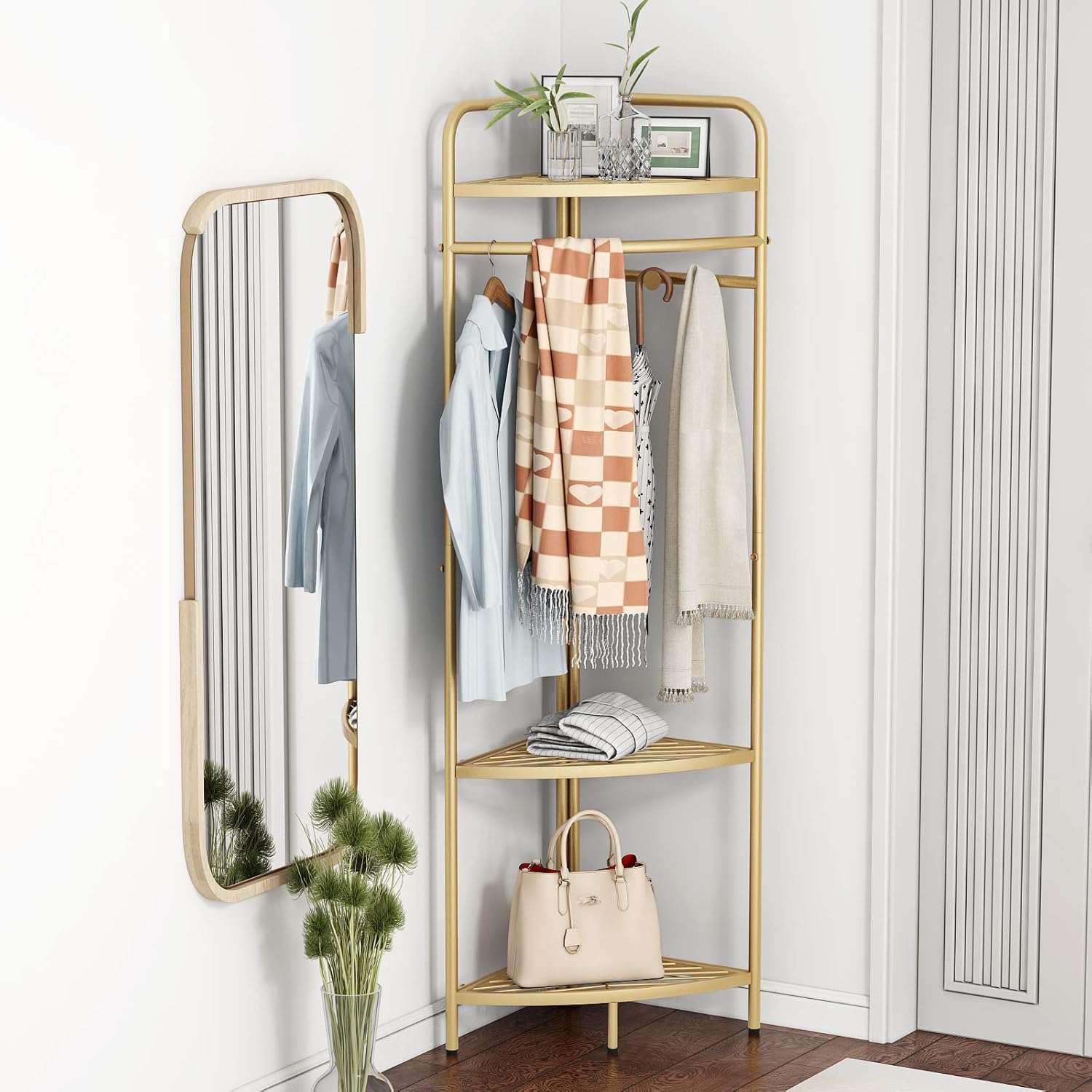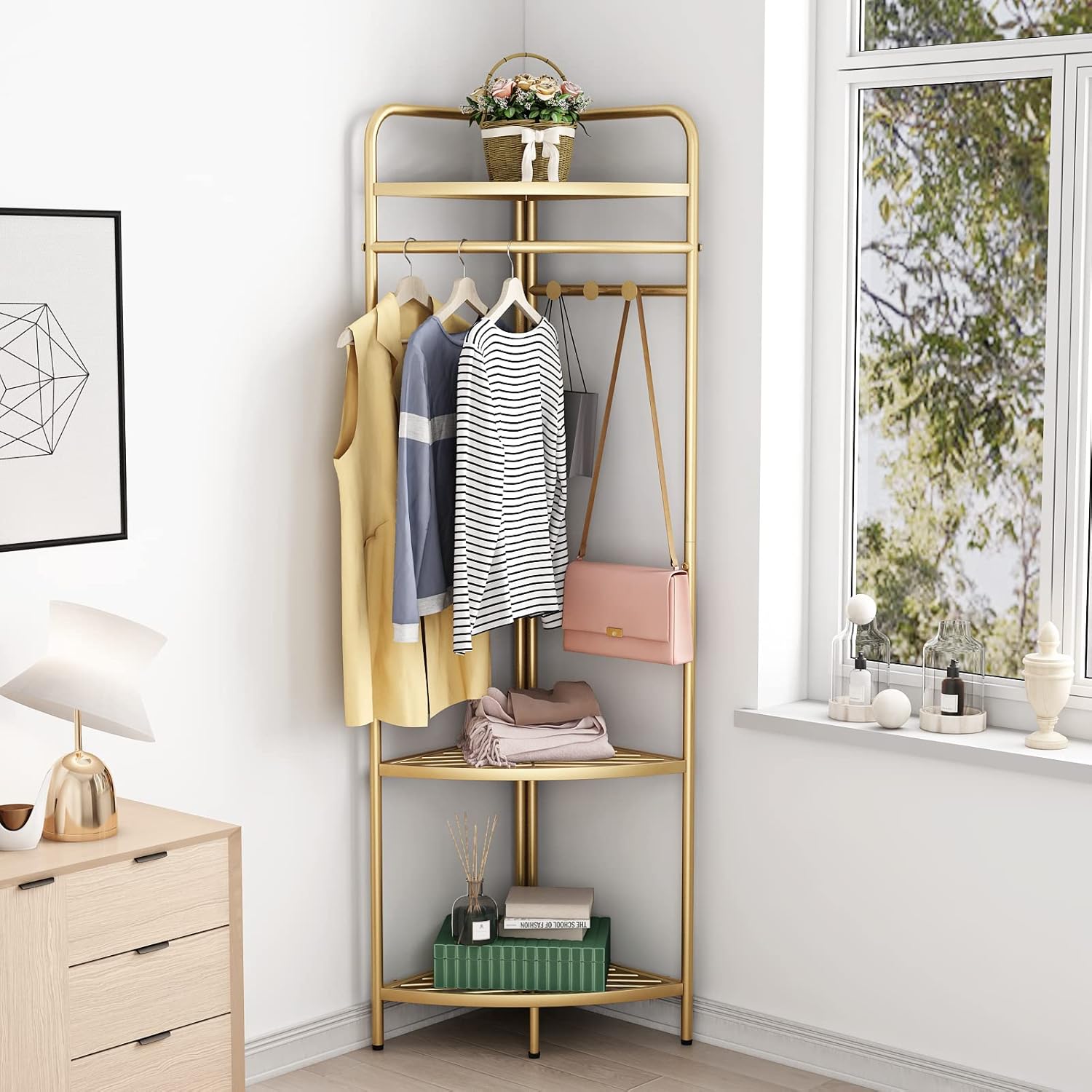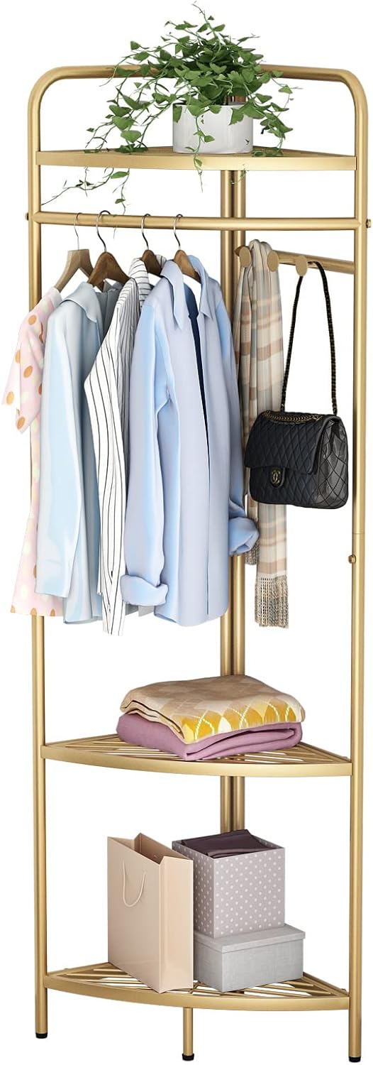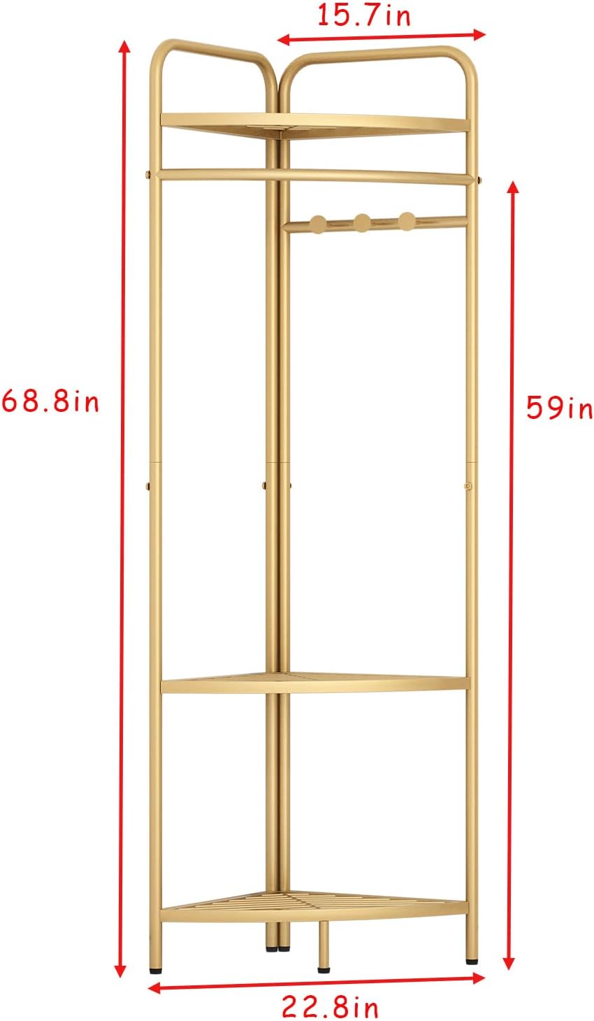 Corner Gold Clothing Racks Freestanding, Gold Metal Coat Racks with Hooks, Heavy Duty Modern Clothes Rack with 3 Tier Storage Shelves for Home,Bedroom,Living Room
