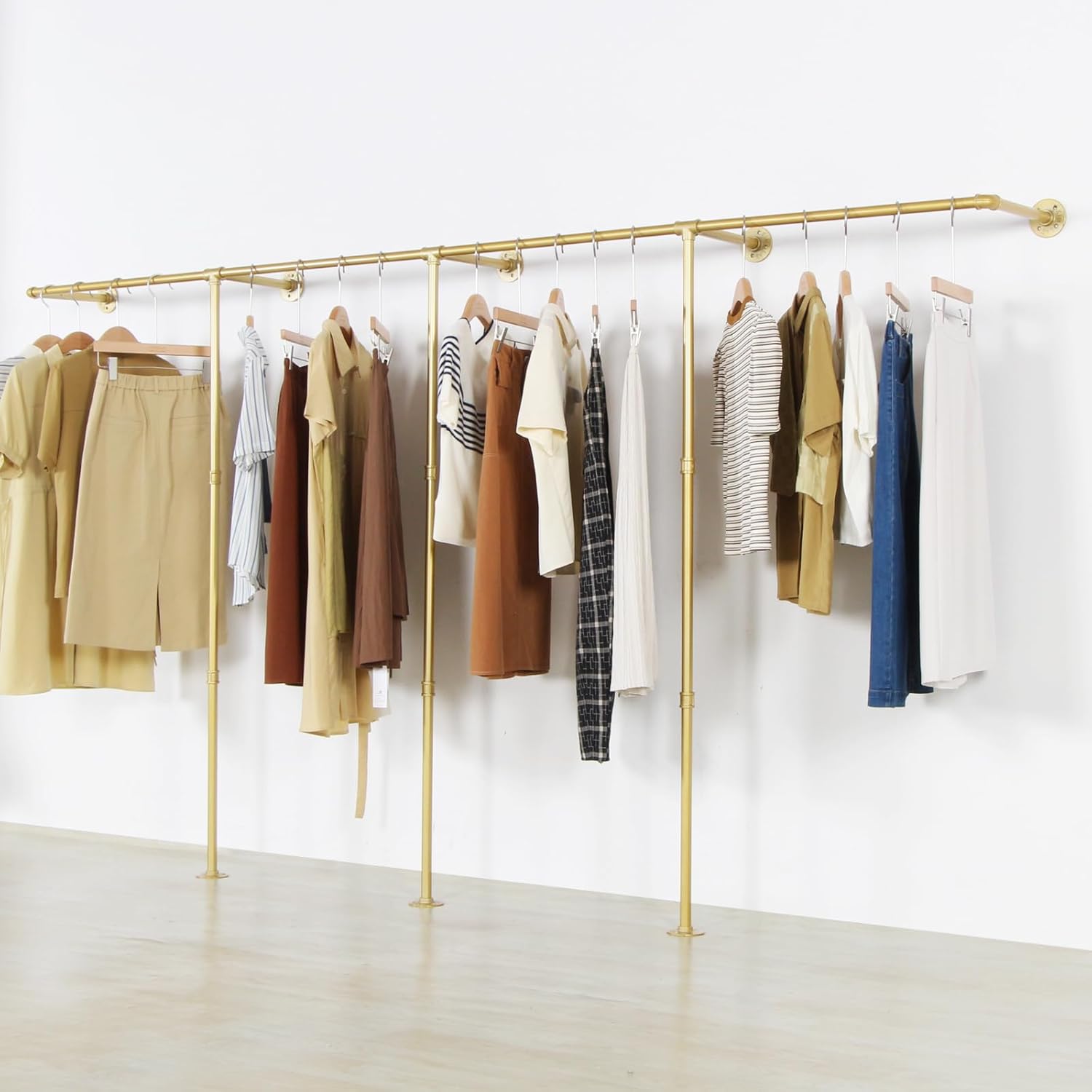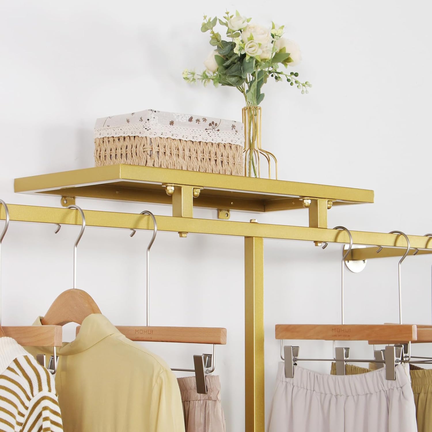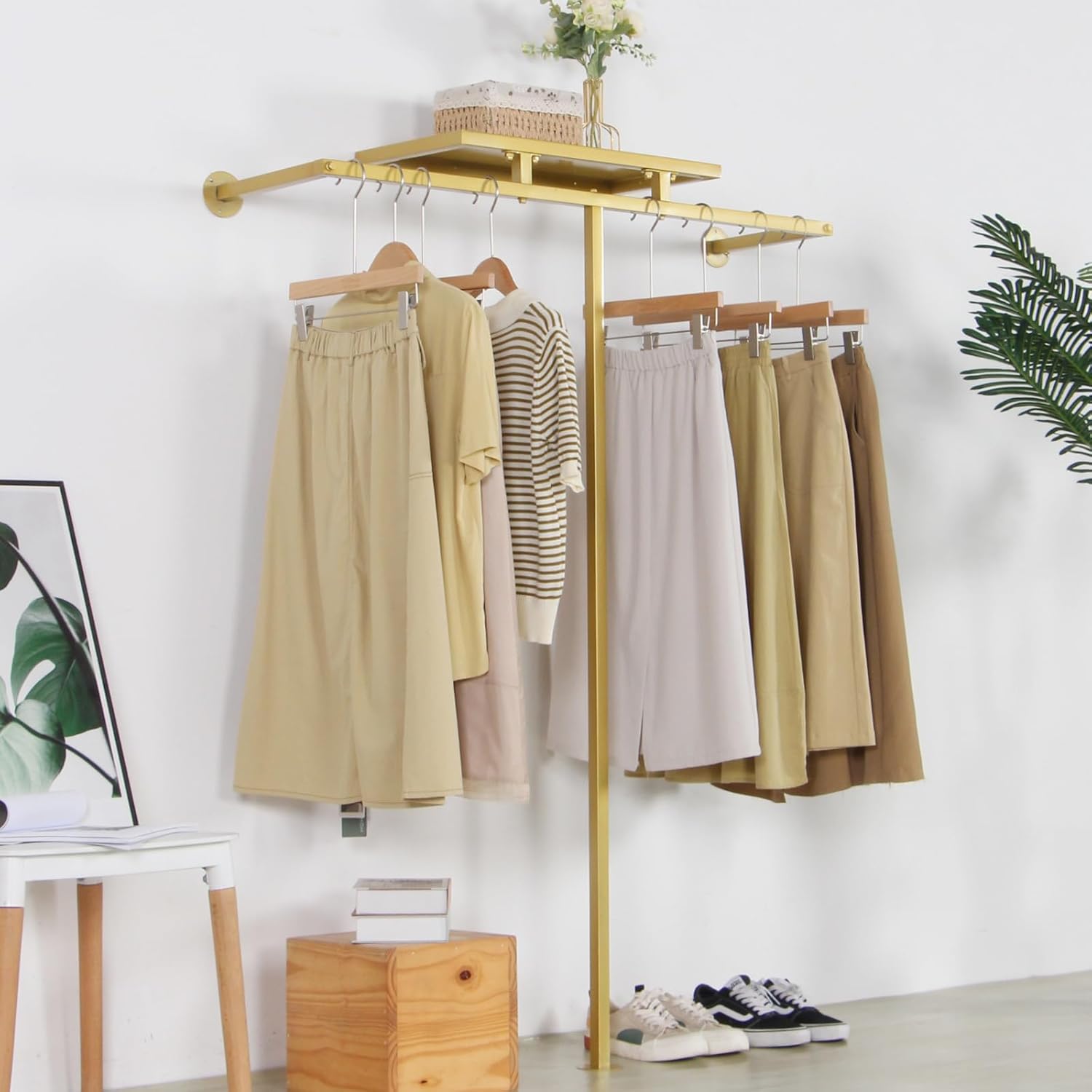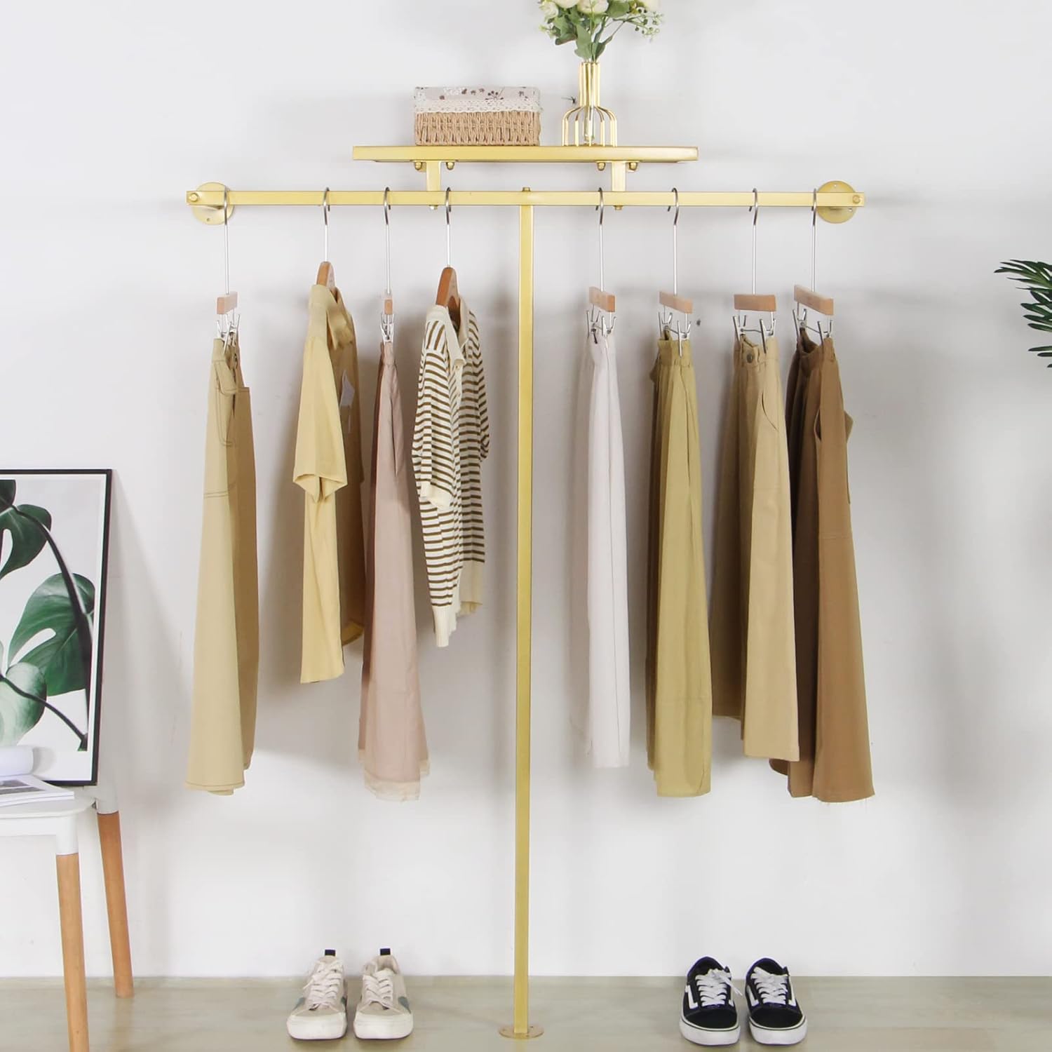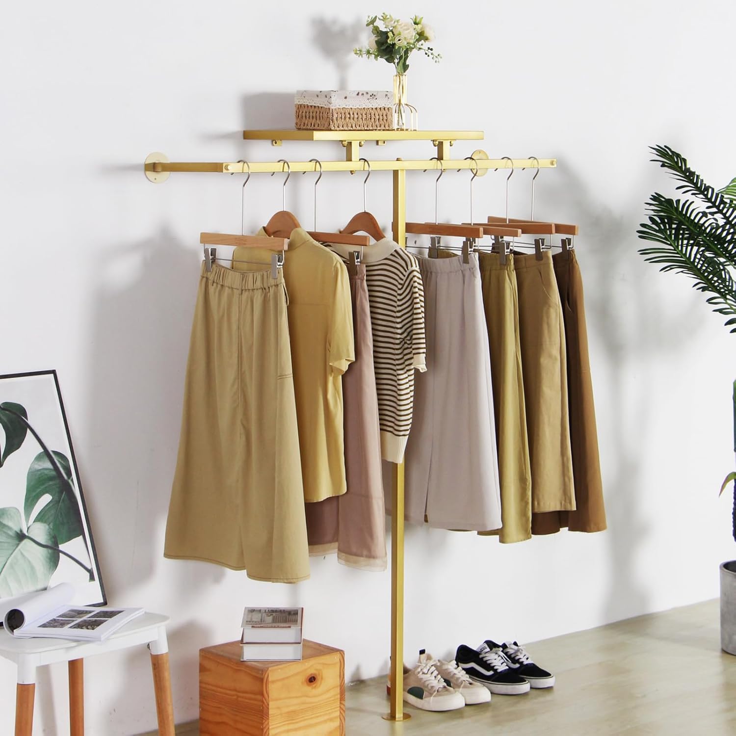Corner Gold Clothing Racks Freestanding, Gold Metal Coat Racks with Hooks, Heavy Duty Modern Clothes Rack with 3 Tier Storage Shelves for Home,Bedroom,Living Room