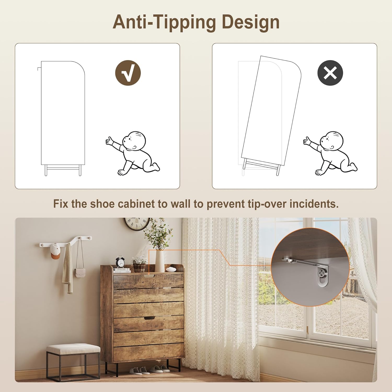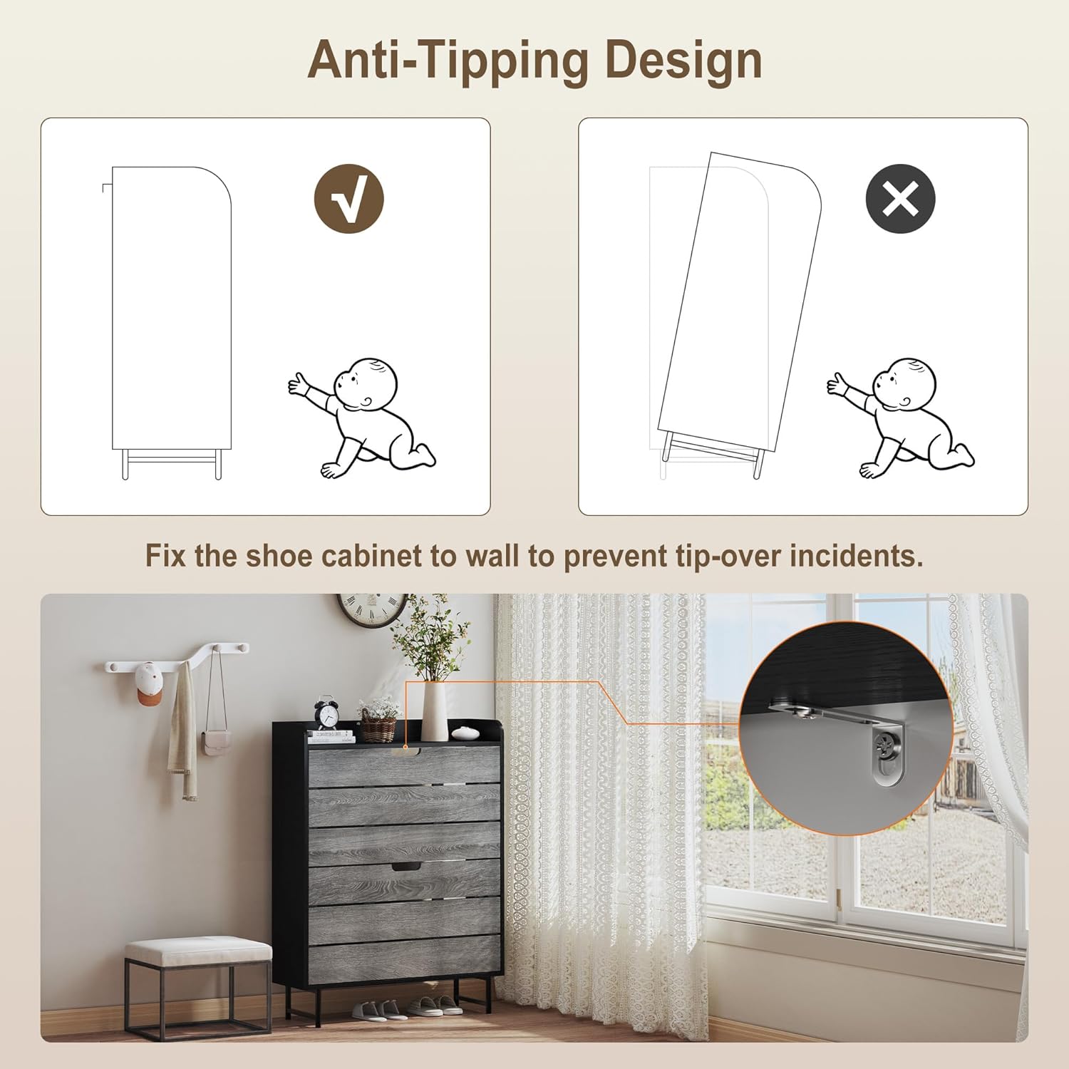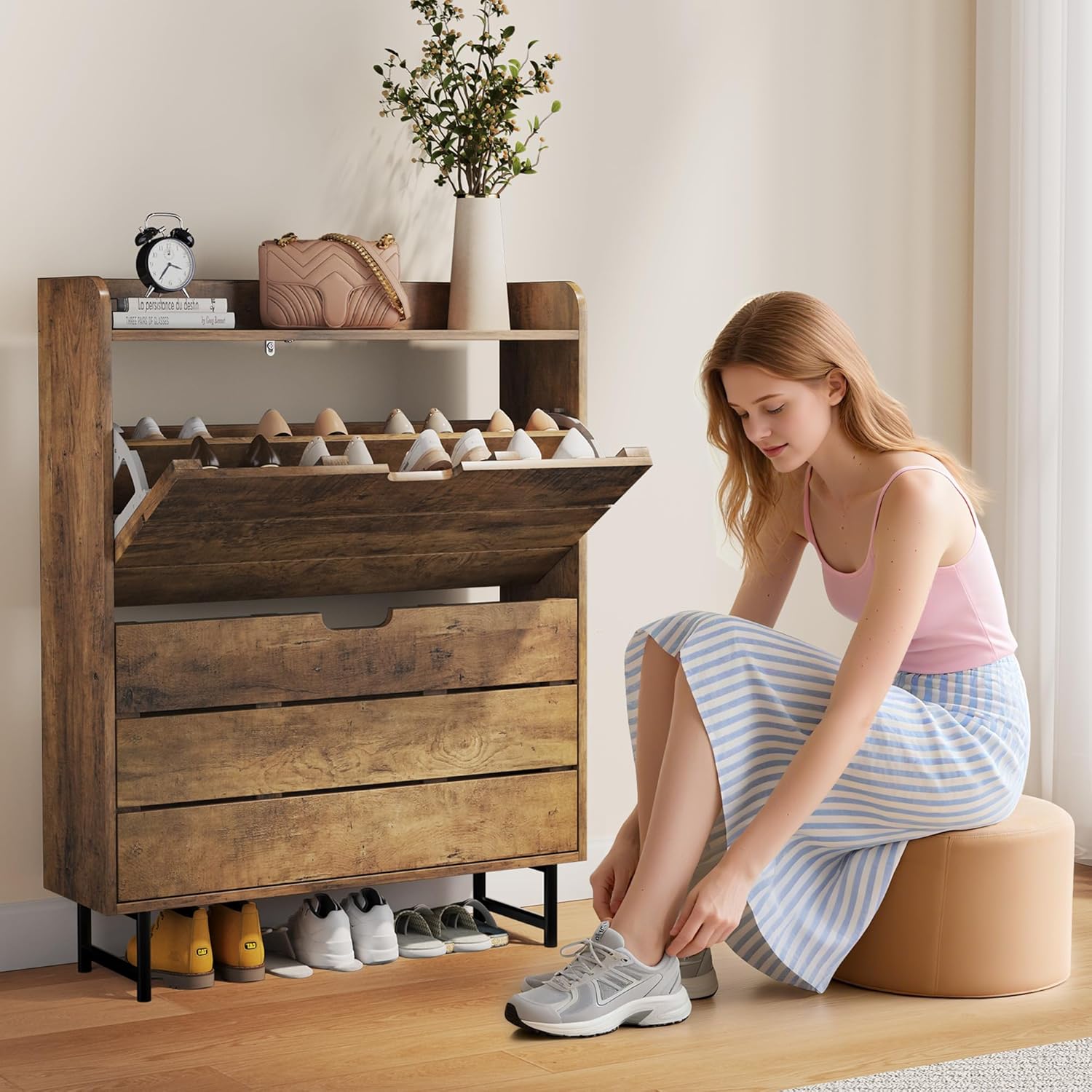 Shoe Storage Cabinet with 2 Flip Drawers, Wooden Shoe Rack Organizer Cabinet with Adjustable Shelf, Narrow Shoe Cabinet for Entryway, Hallway, Living Room (Grey)