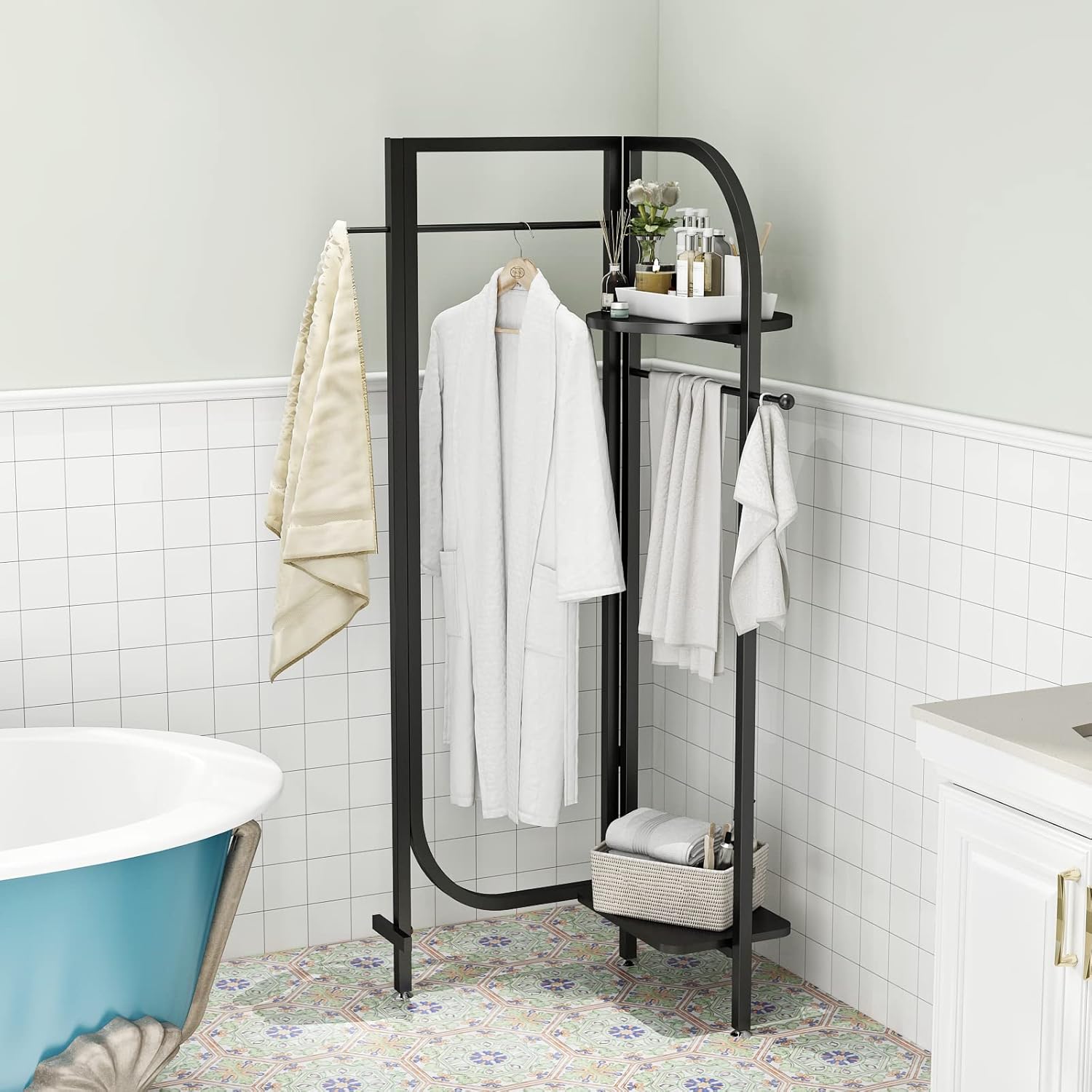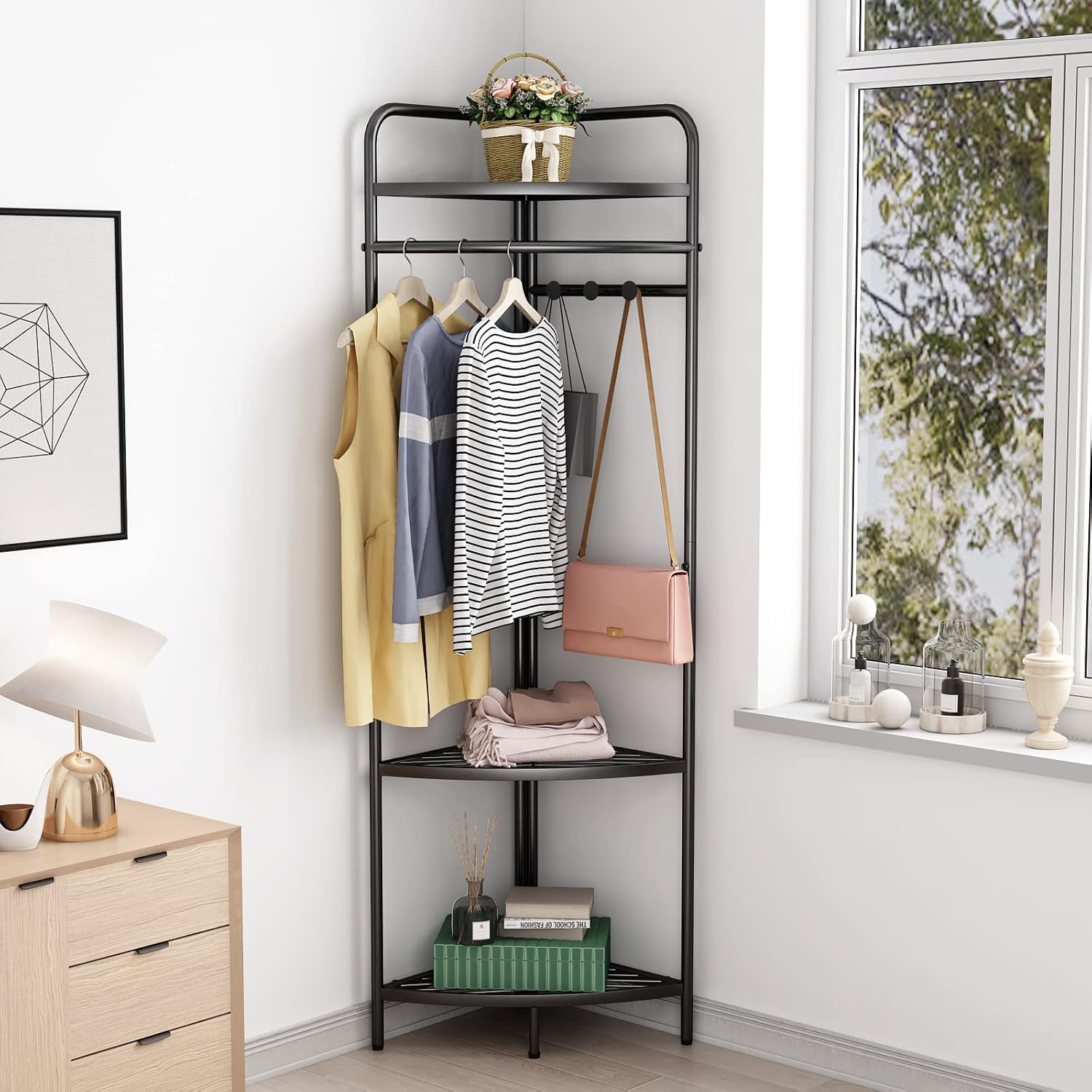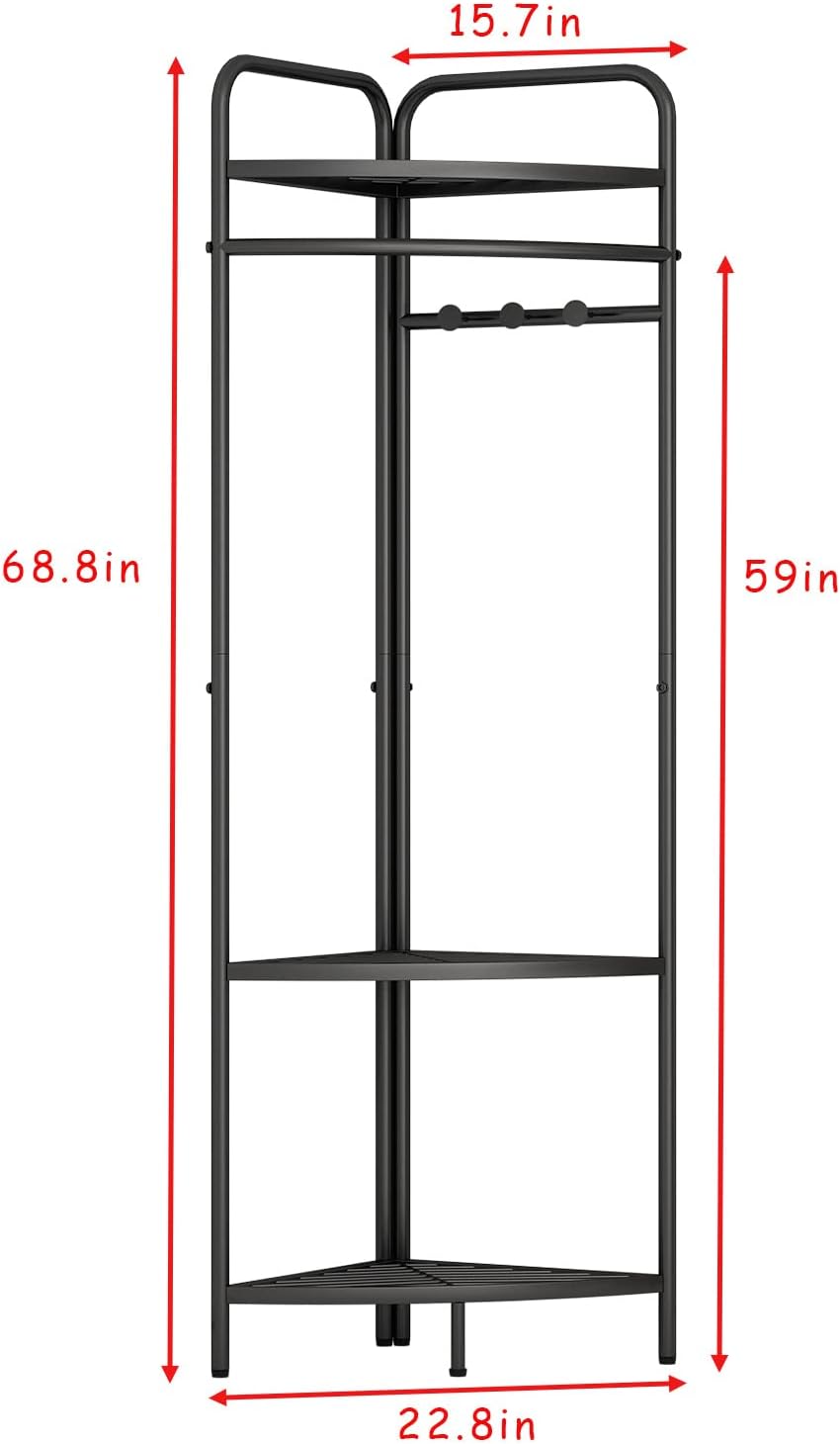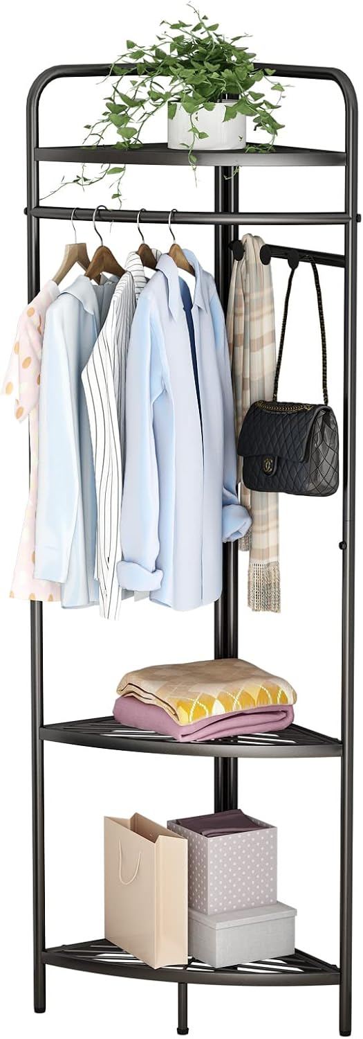 Corner Black Clothing Racks Freestanding, Metal Black Coat Racks with Hooks, Heavy Duty Modern Clothes Rack with 3 Tier Storage Shelves for Home,Bedroom,Living Room