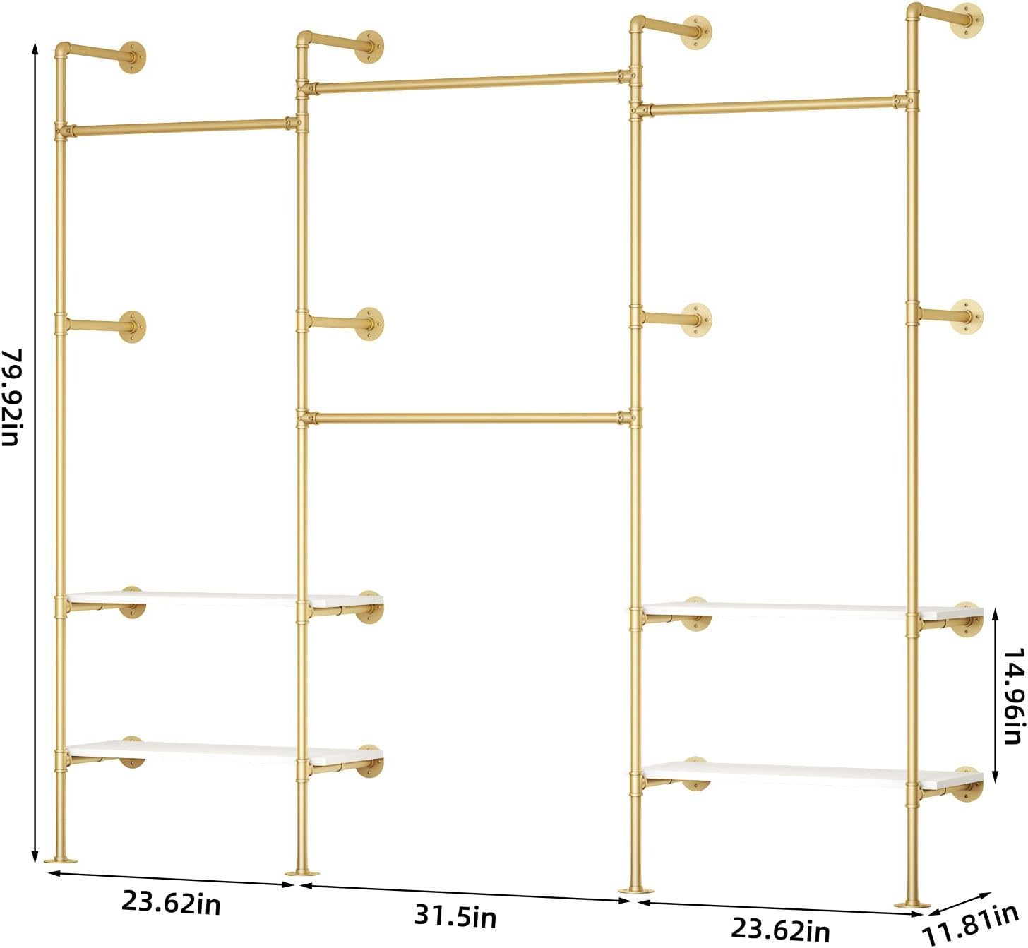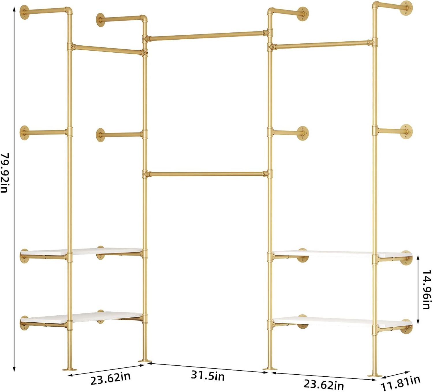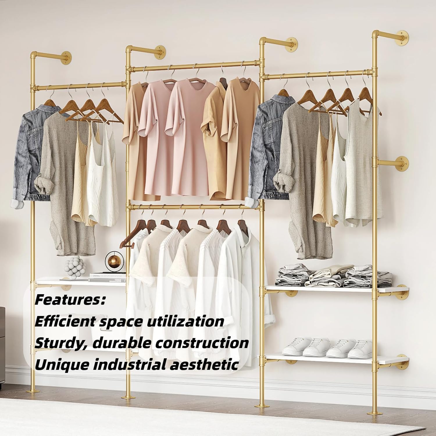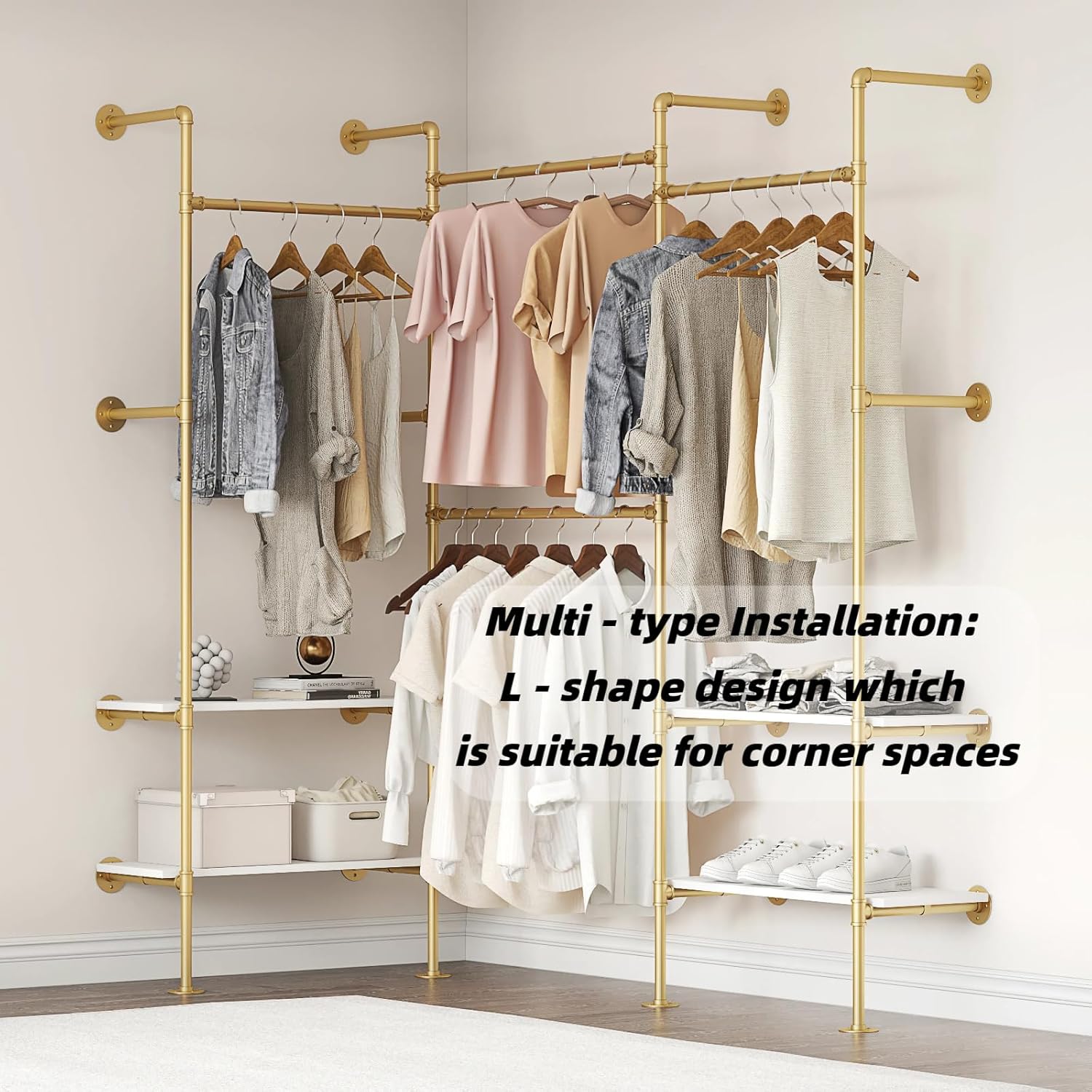 Industrial Pipe Clothing Rack, Wall Mounted Clothes Rack for Hanging Clothes, Retail Display Rack with Shelves, Add Corner installation Method (Gold, III-2Tier)