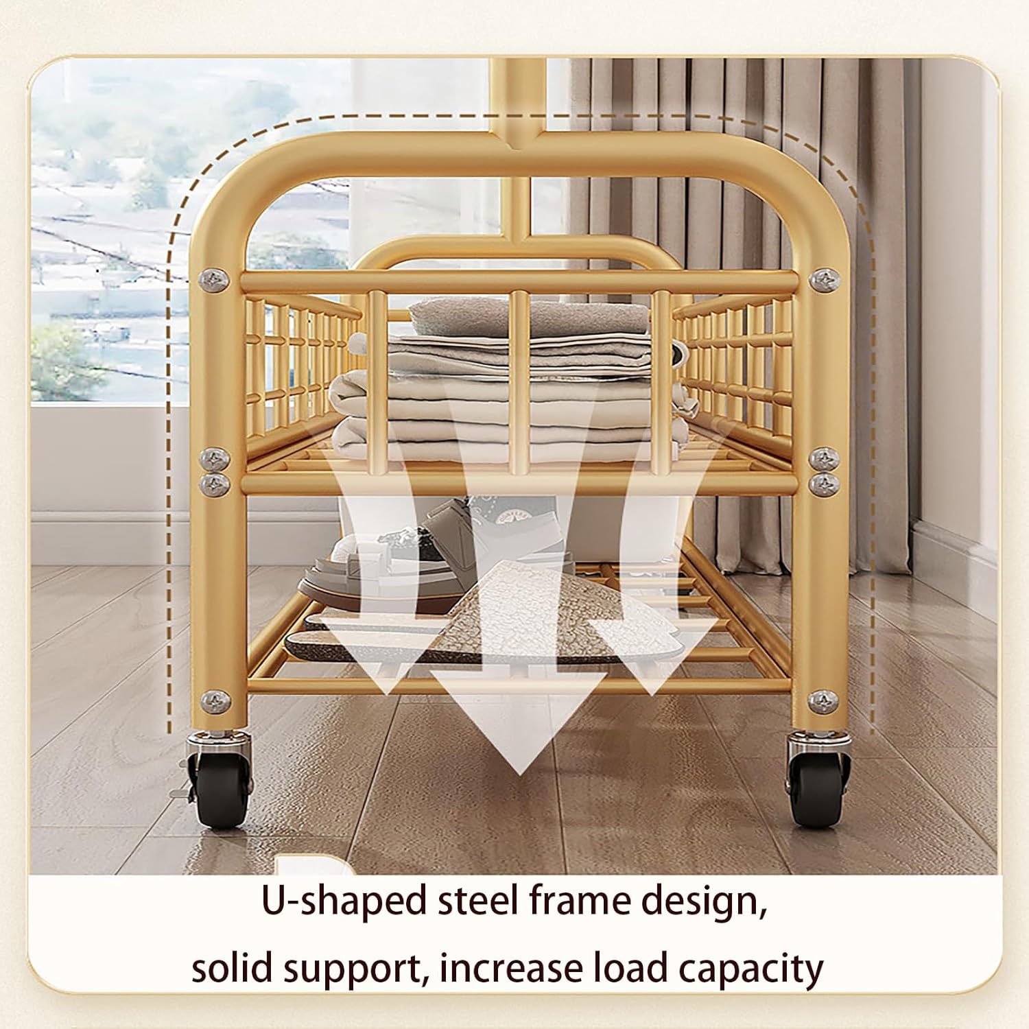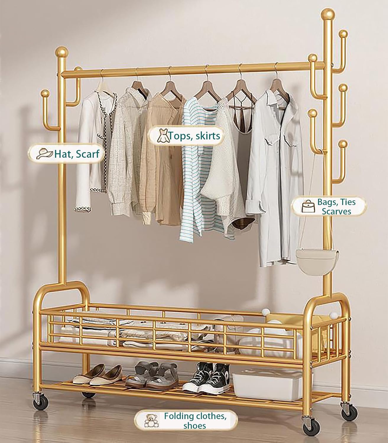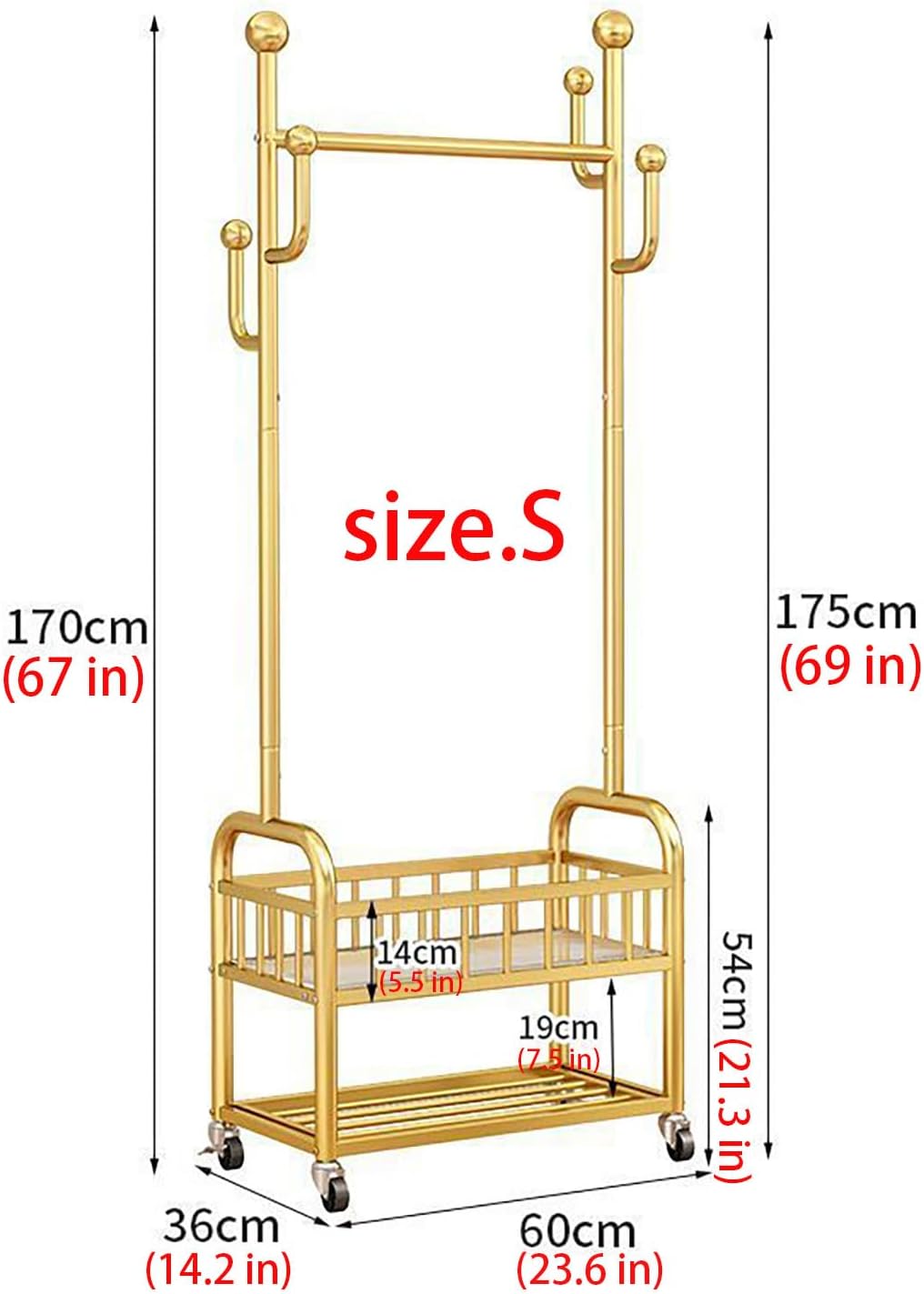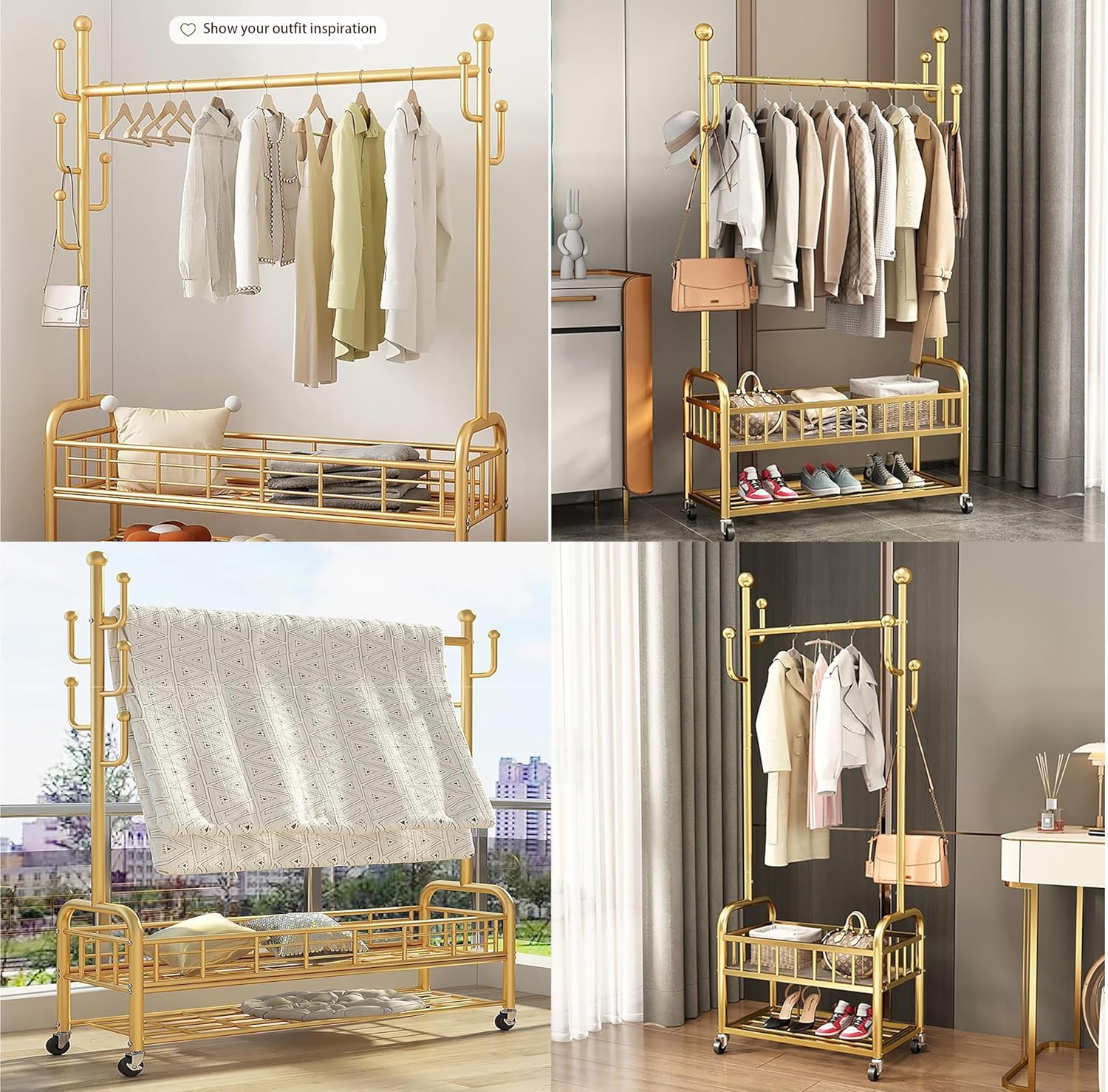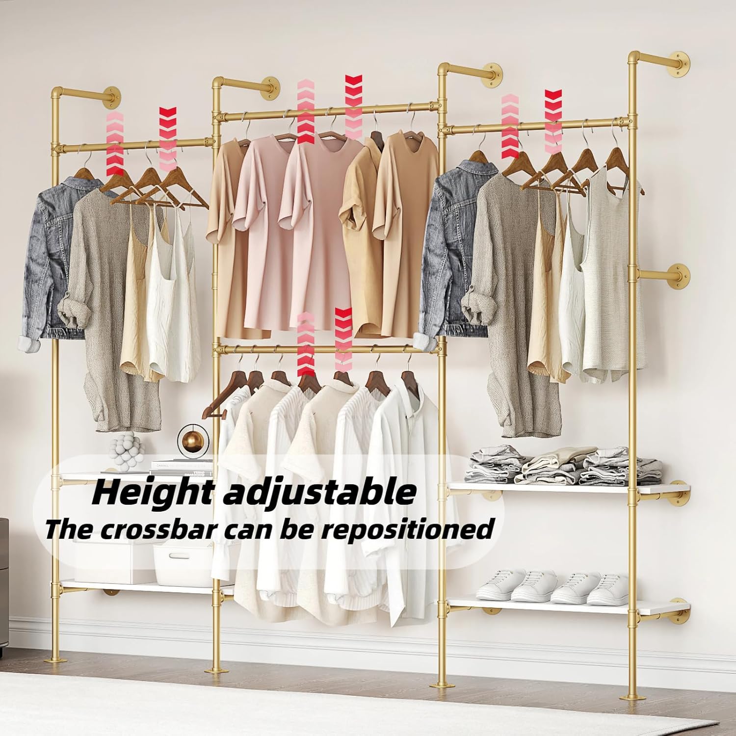 Industrial Pipe Clothing Rack, Wall Mounted Clothes Rack for Hanging Clothes, Retail Display Rack with Shelves, Add Corner installation Method (Gold, III-2Tier)