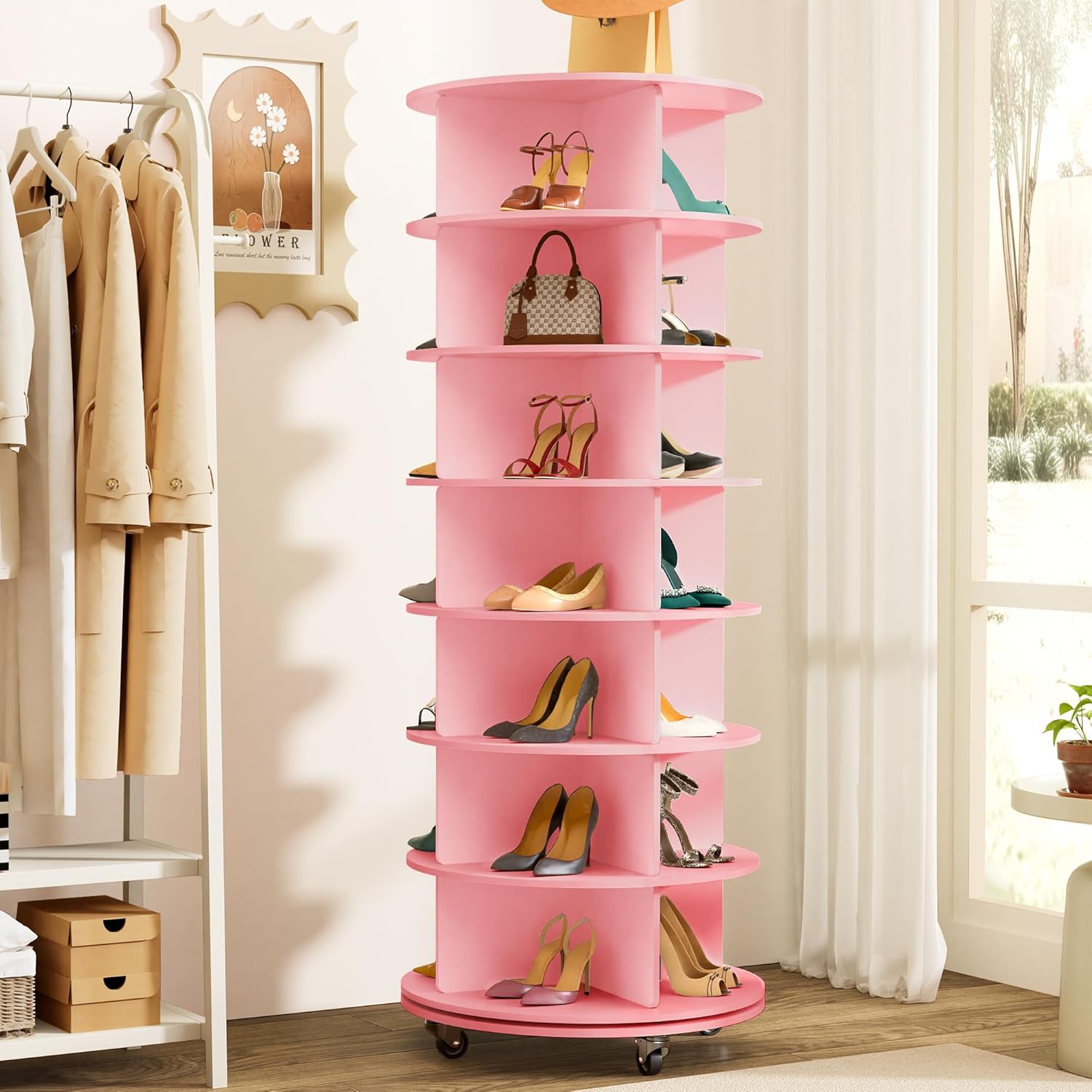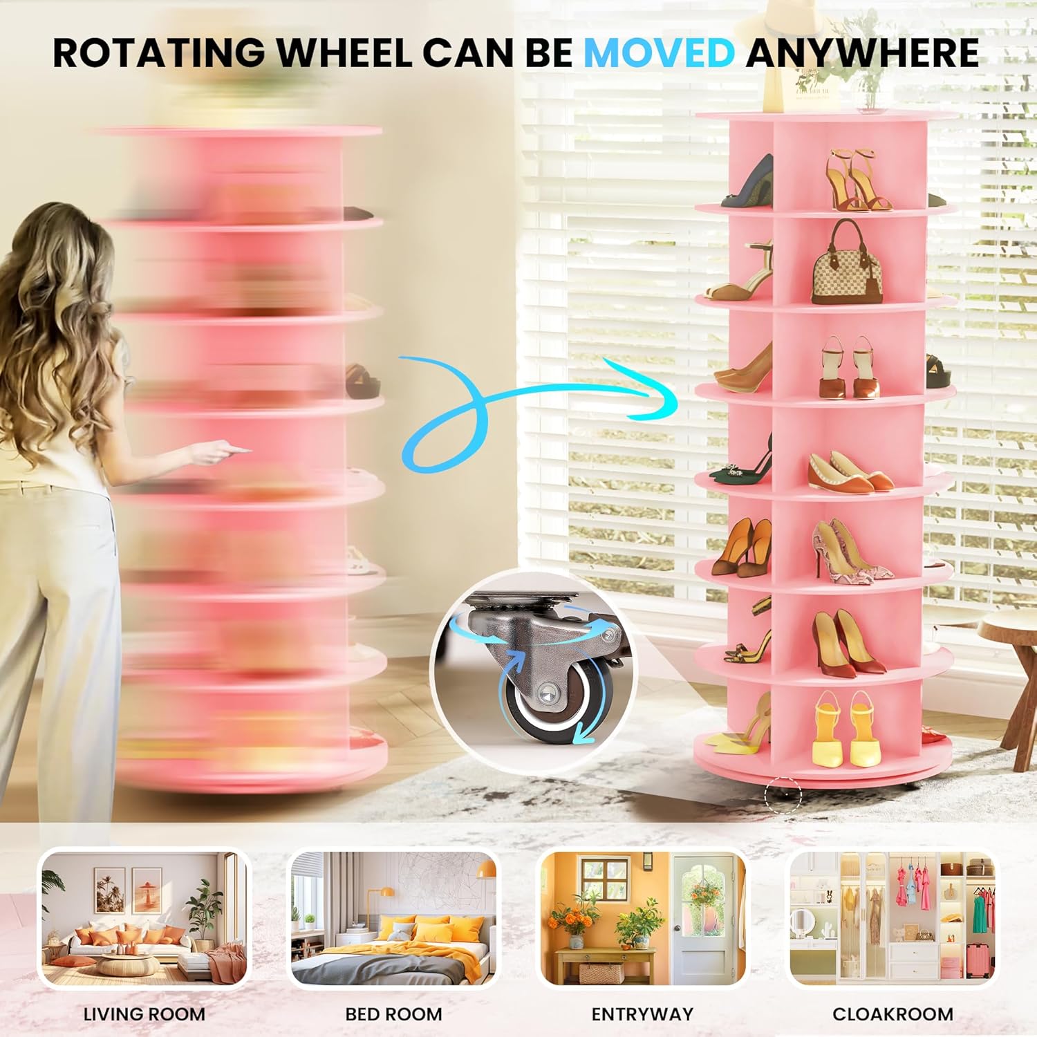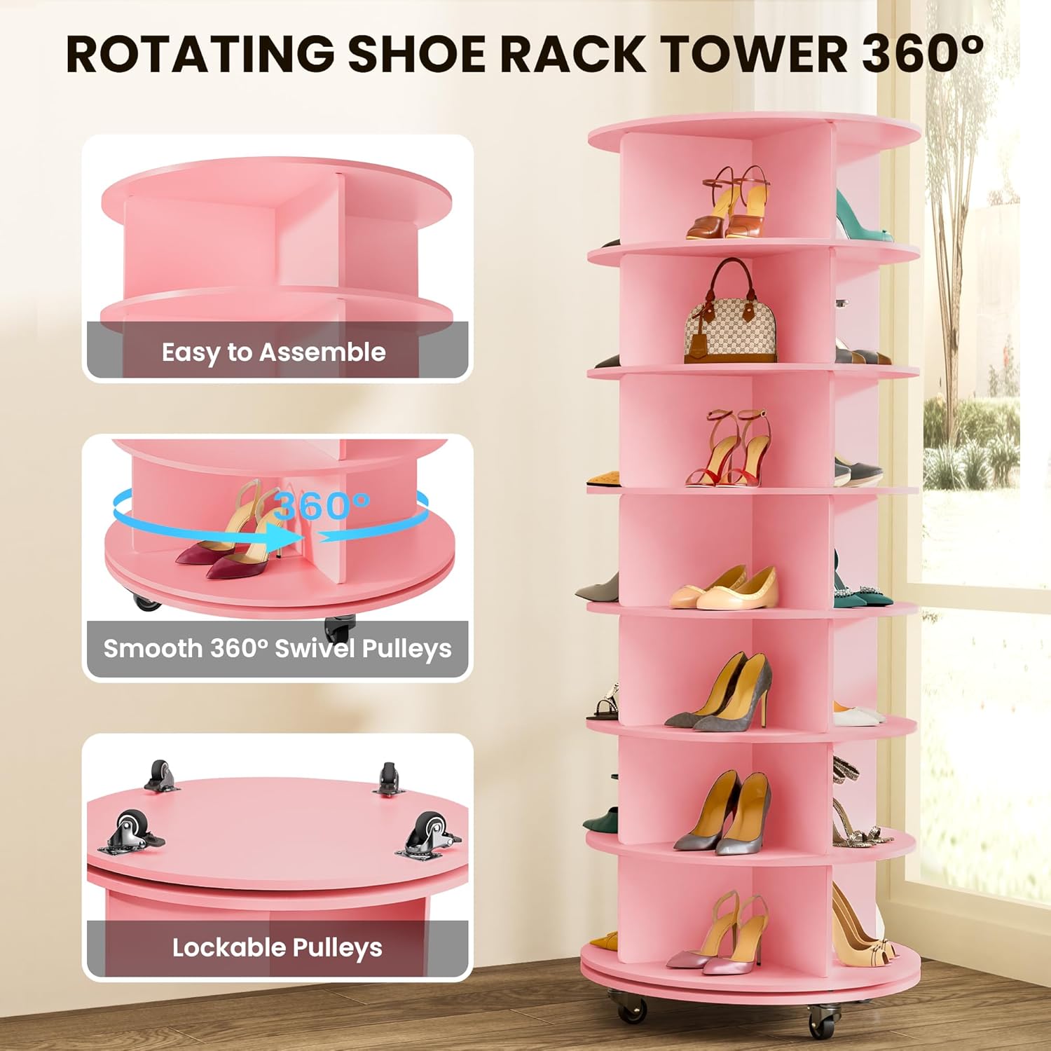 7 Tier Rotating Shoe Rack Tower with Wheels, 360 Revolving Shoe Rack Storage Round Carousel lazy susan, 66.9" Spinning Shoe tower Shoe Closet Organizer for Entryway Living Room Hallway Pink