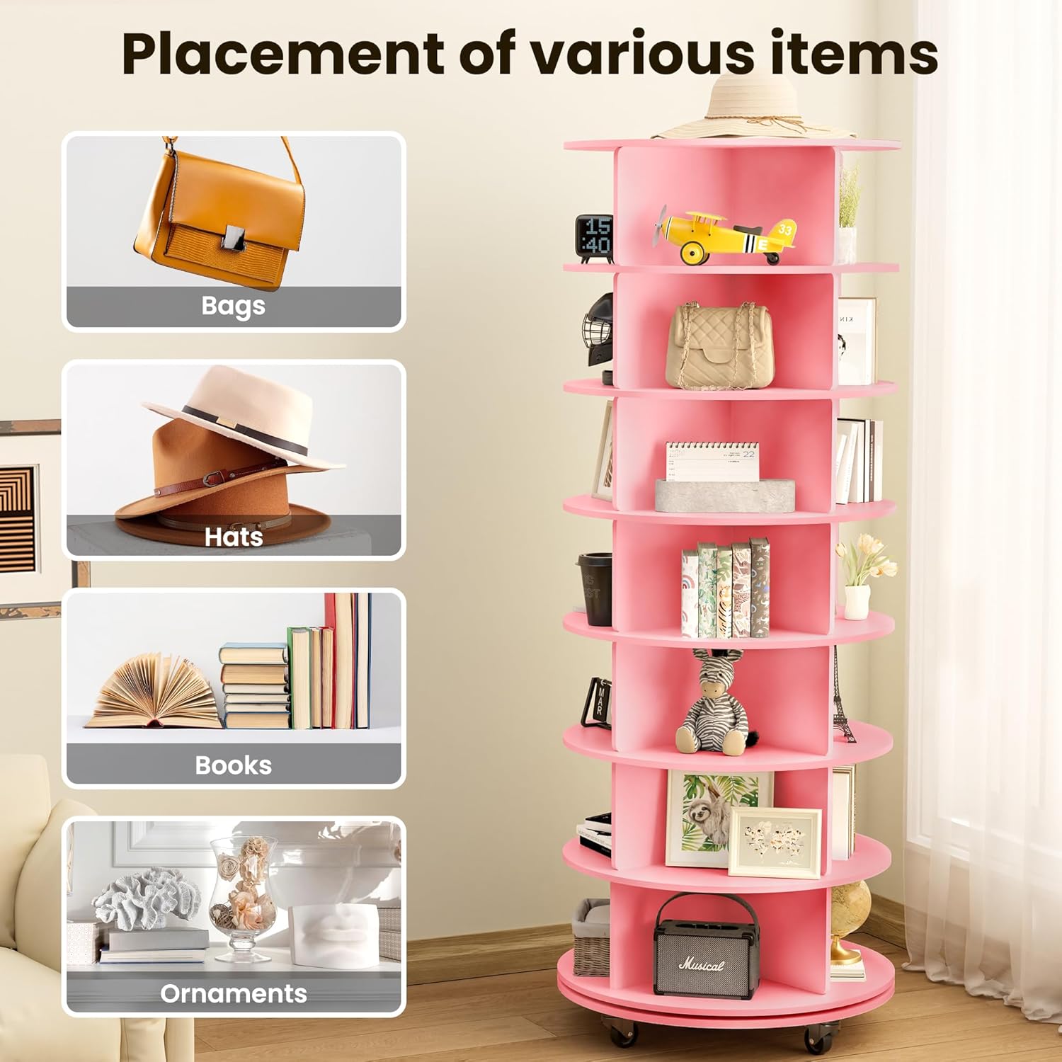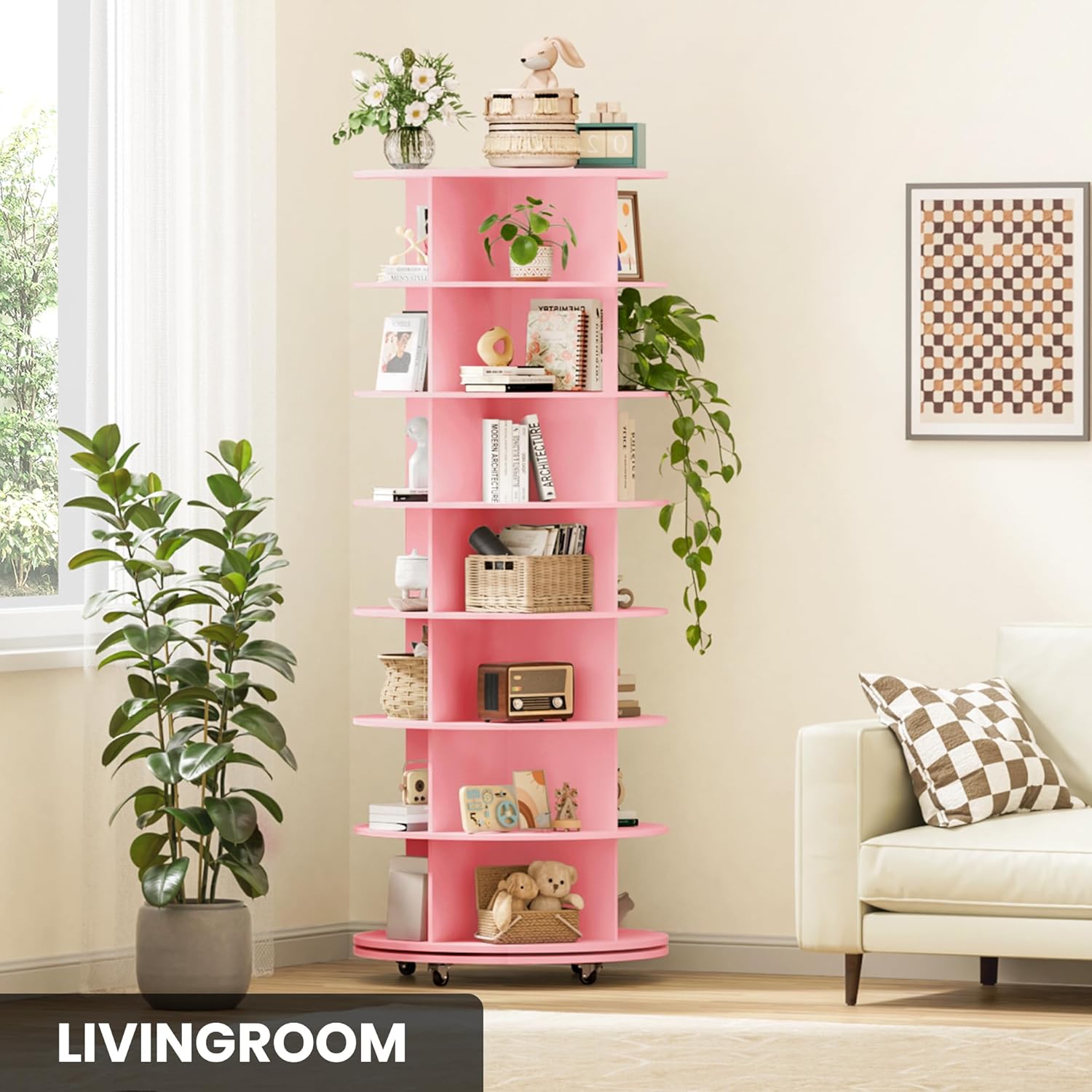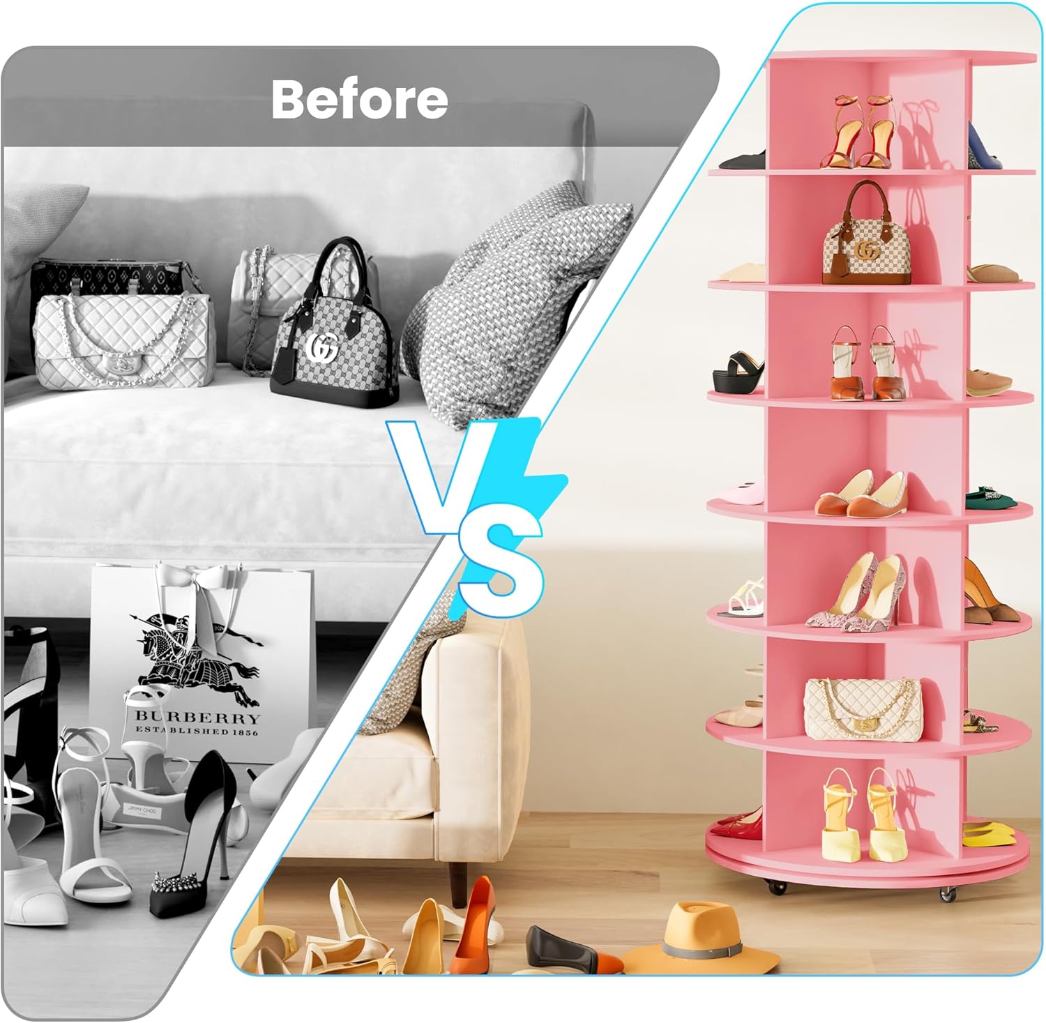 7 Tier Rotating Shoe Rack Tower with Wheels, 360 Revolving Shoe Rack Storage Round Carousel lazy susan, 66.9" Spinning Shoe tower Shoe Closet Organizer for Entryway Living Room Hallway Pink