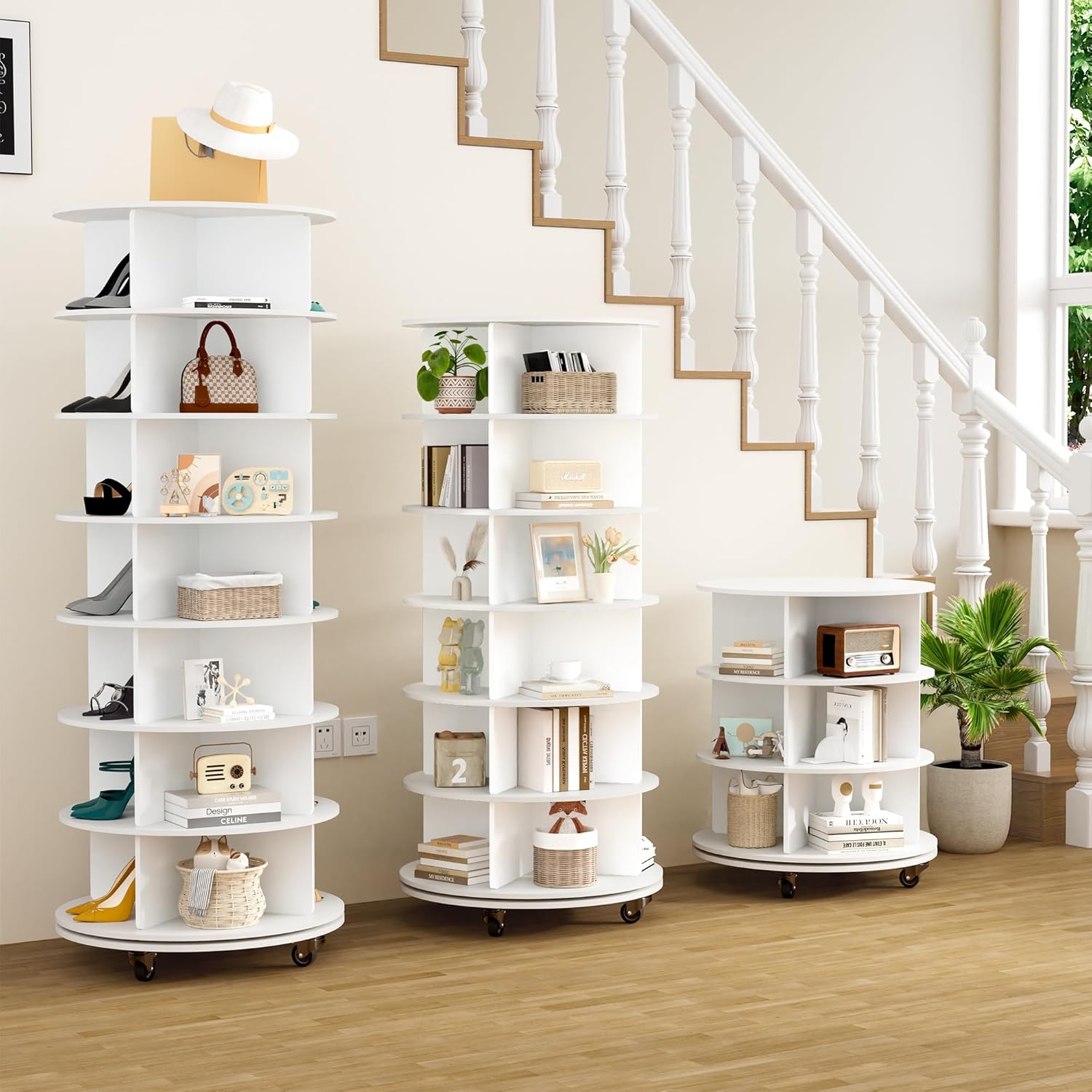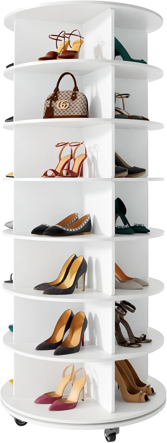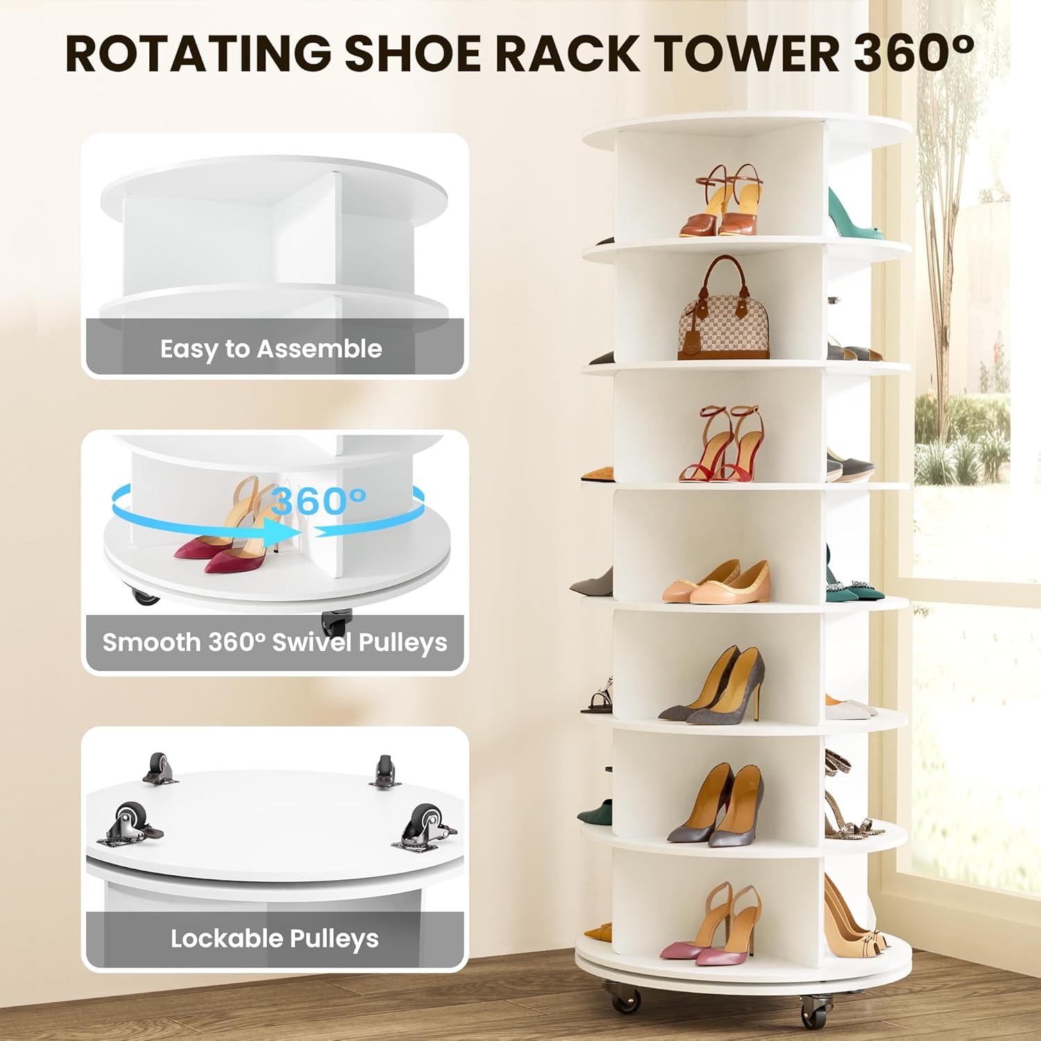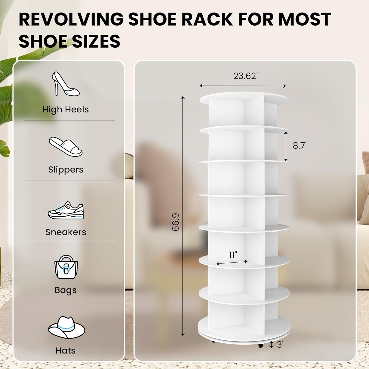 7-Tier Rotating Shoe Rack Tower 360 with Wheels, 66.9in Spinning Shoe Tower, Revolving Shoe Rack, Shoe Carousel Closet Organizer, Free Standing Shoe Rack for Entryway Living Room Hallway White