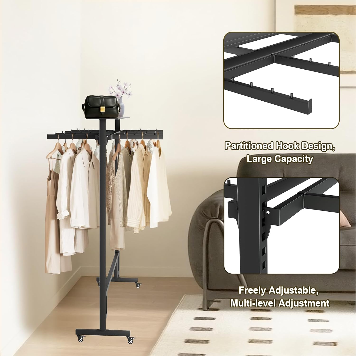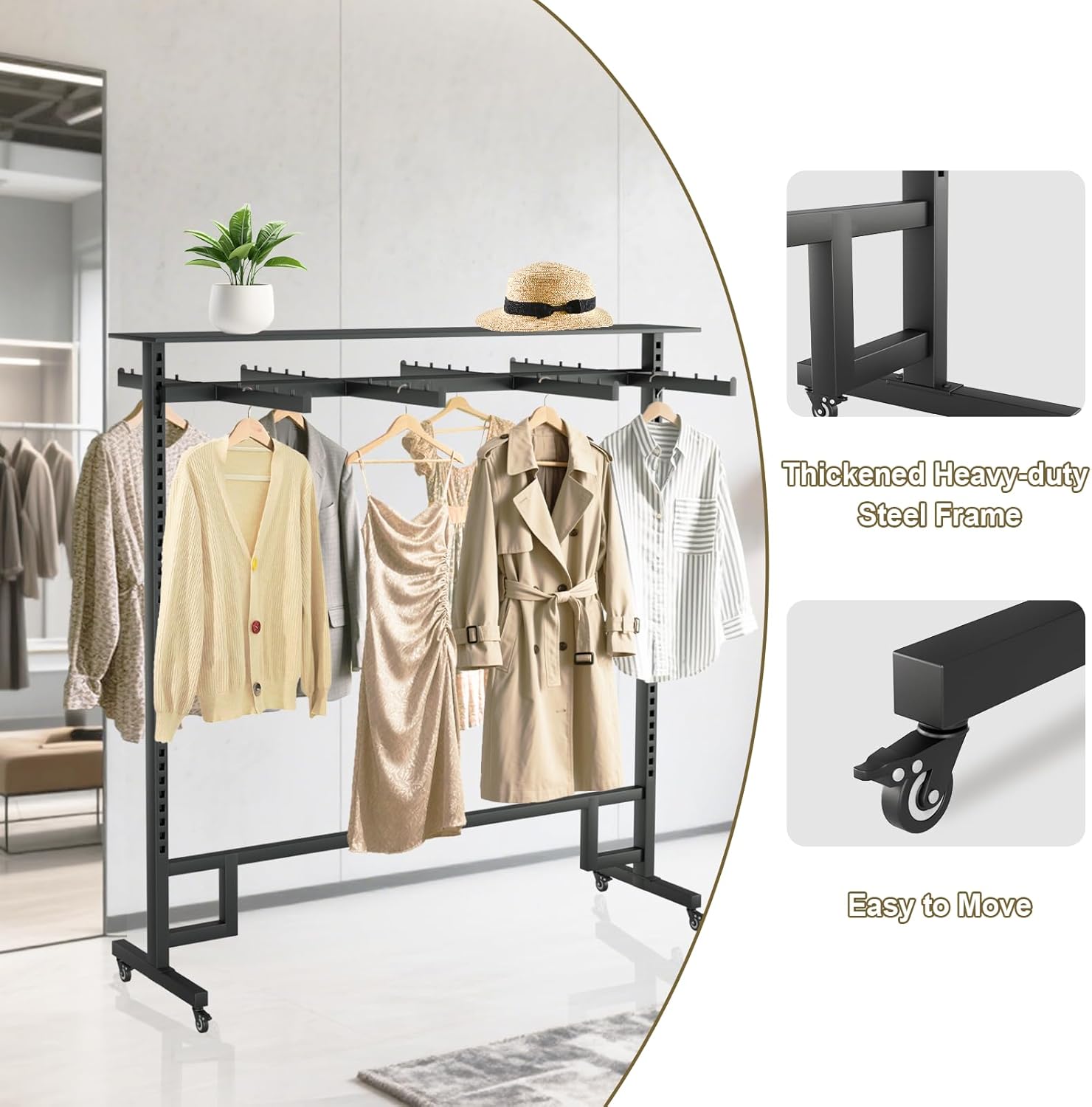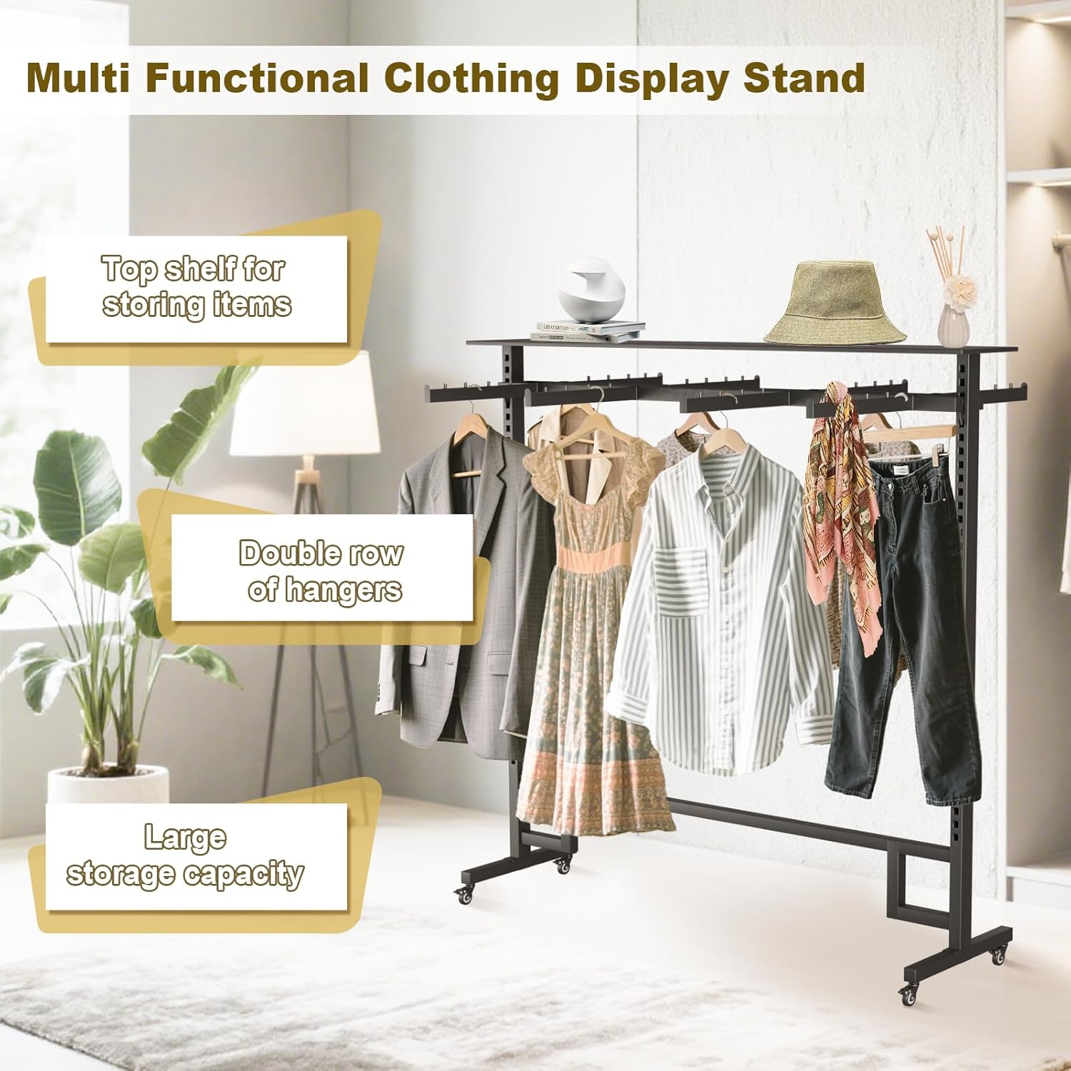 Retail Clothing Rack with Adjustable 8 Arms, Portable Boutique Display Stand on Wheels and Shelf, Floor Standing Metal Garment Rack for Hanging Shirts, Black
