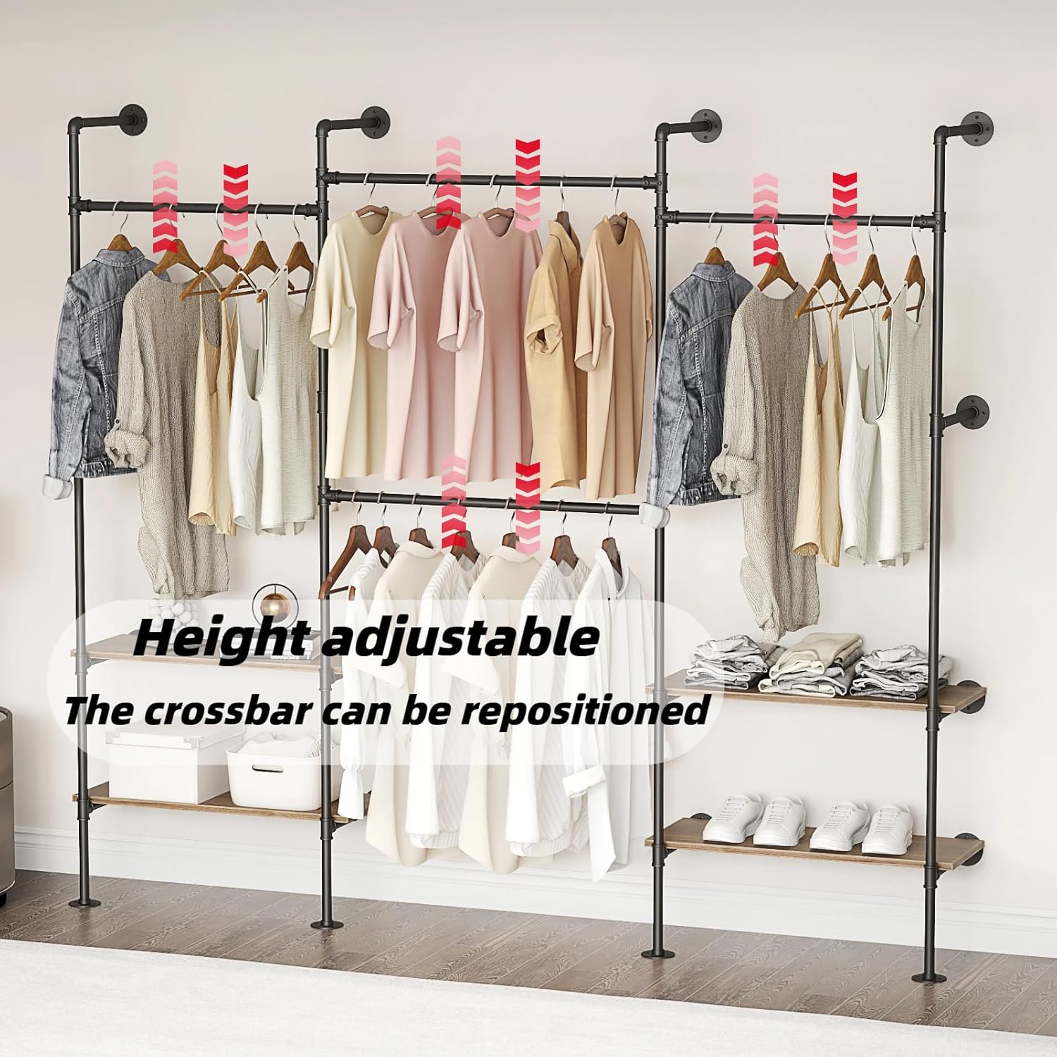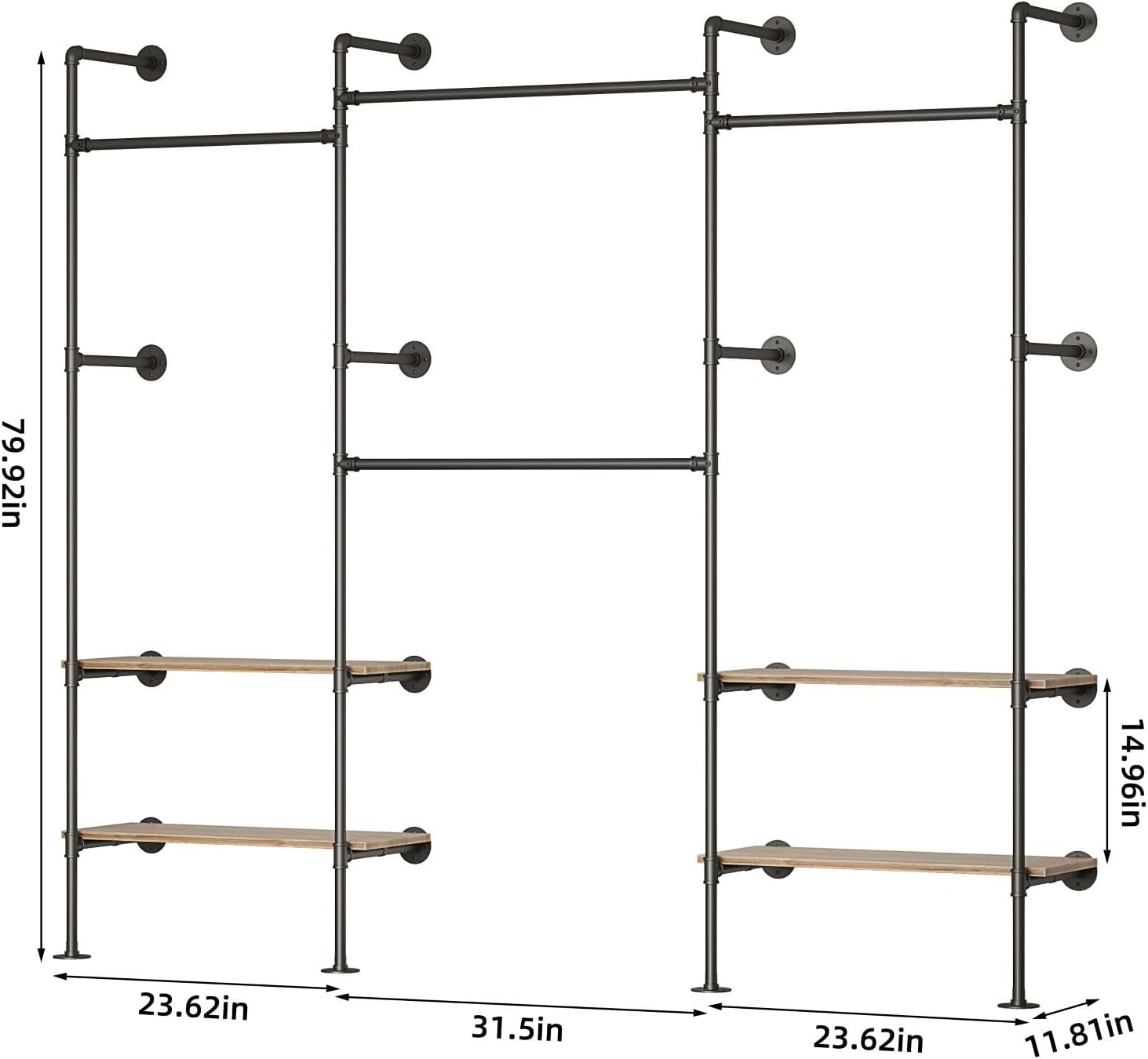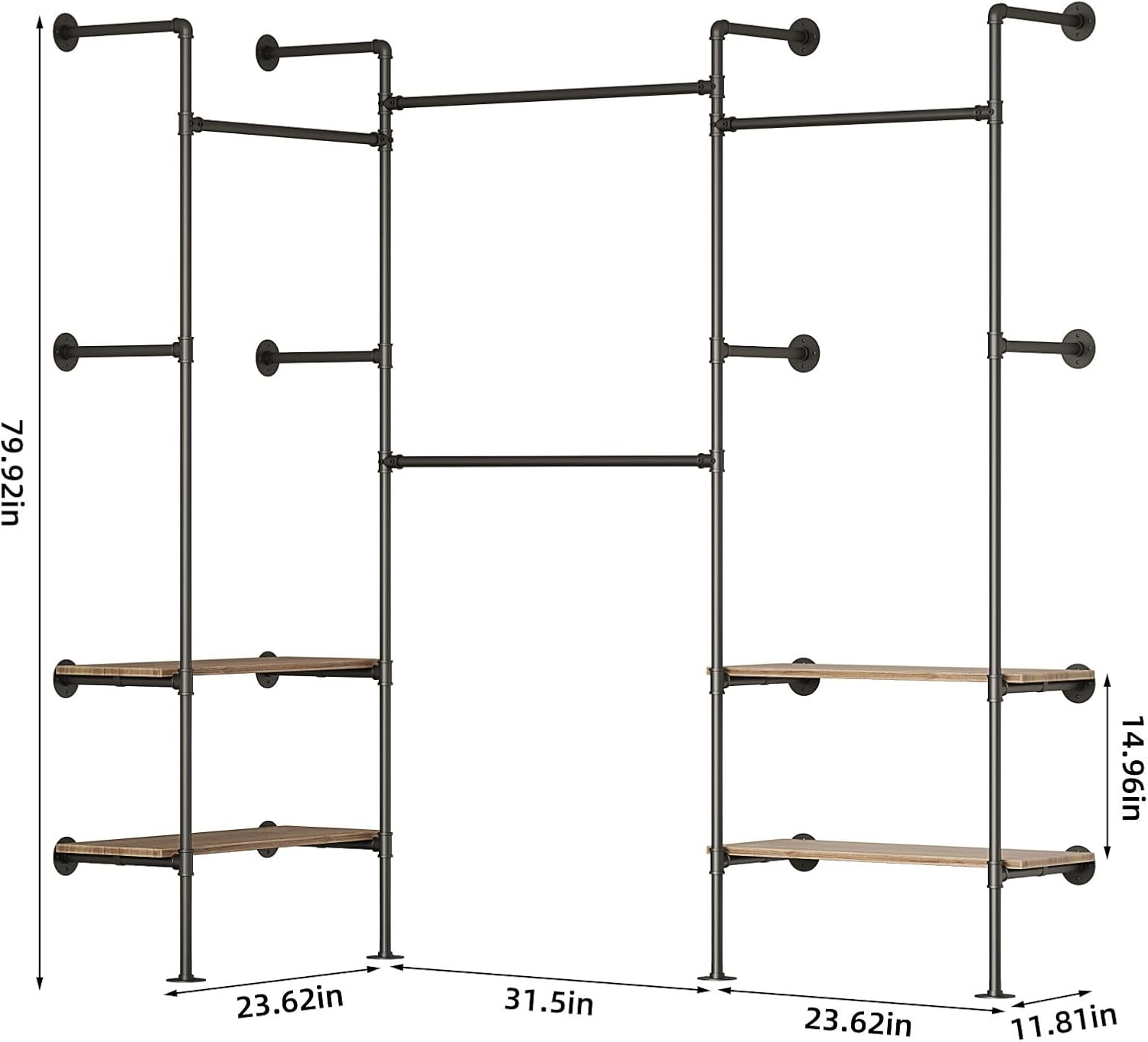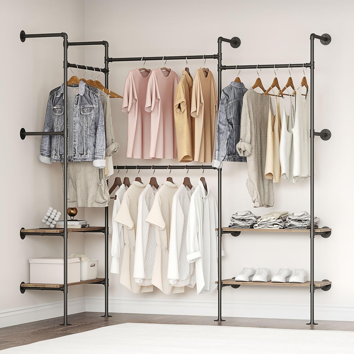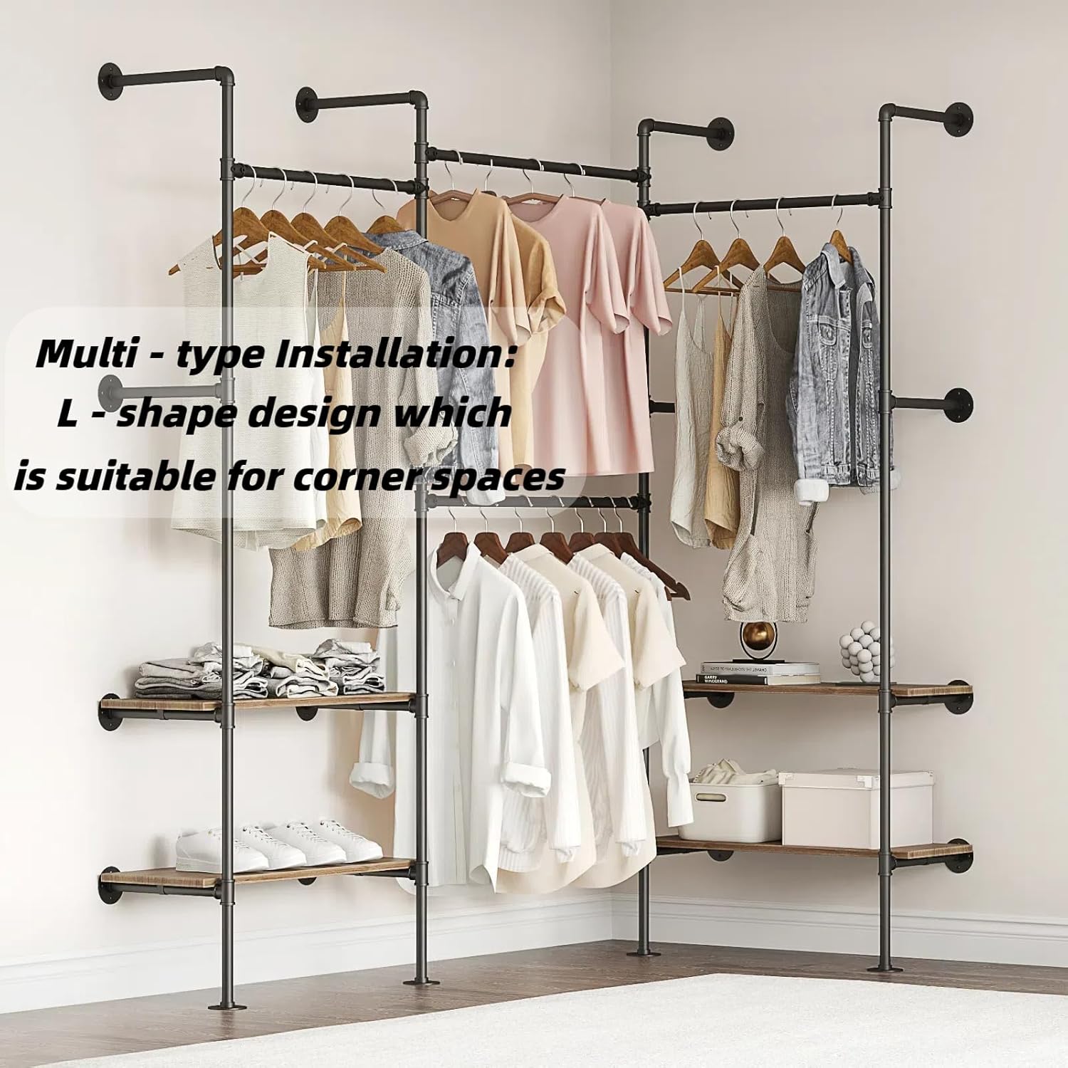 Industrial Pipe Clothing Rack, Wall Mounted Clothes Rack for Hanging Clothes, Retail Display Rack with Shelves, Add Corner installation Method (Black, III-2Tier)