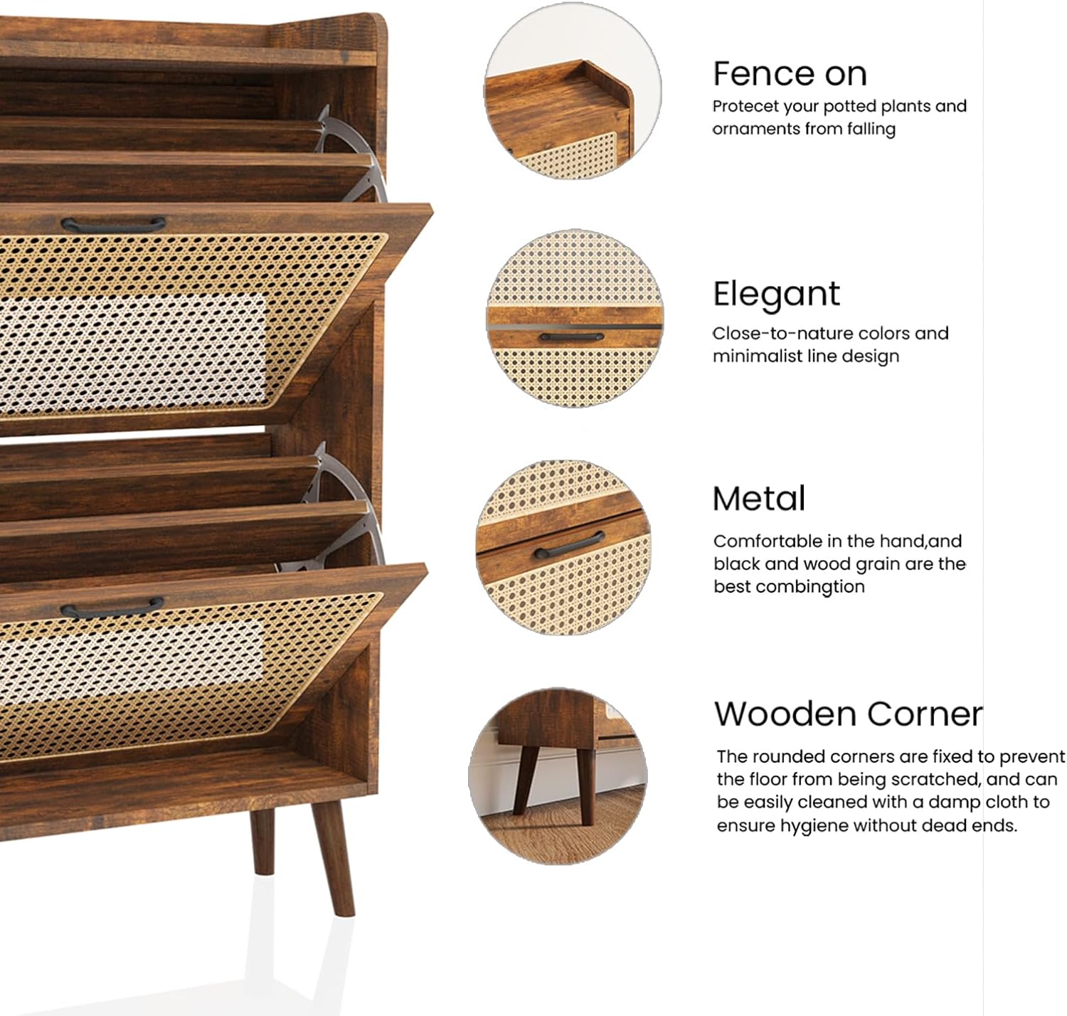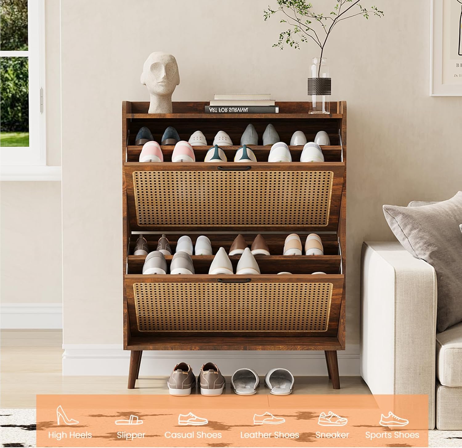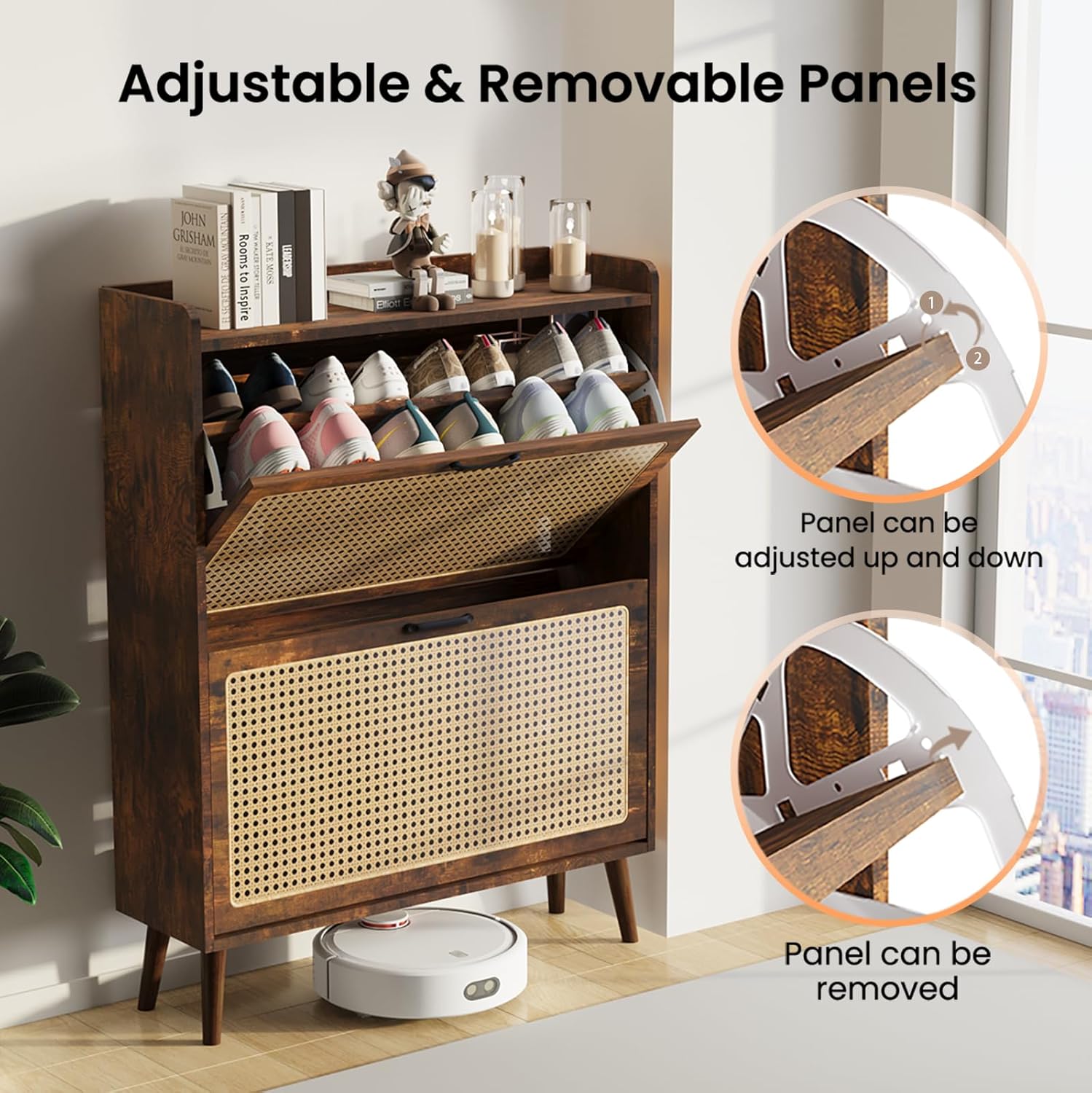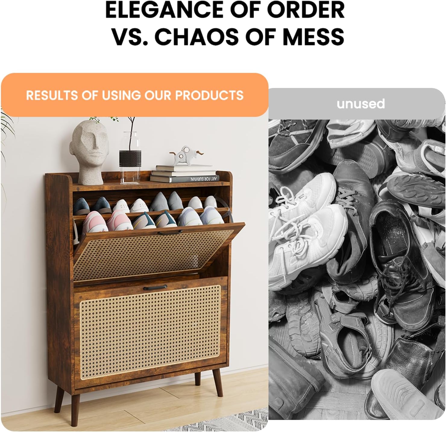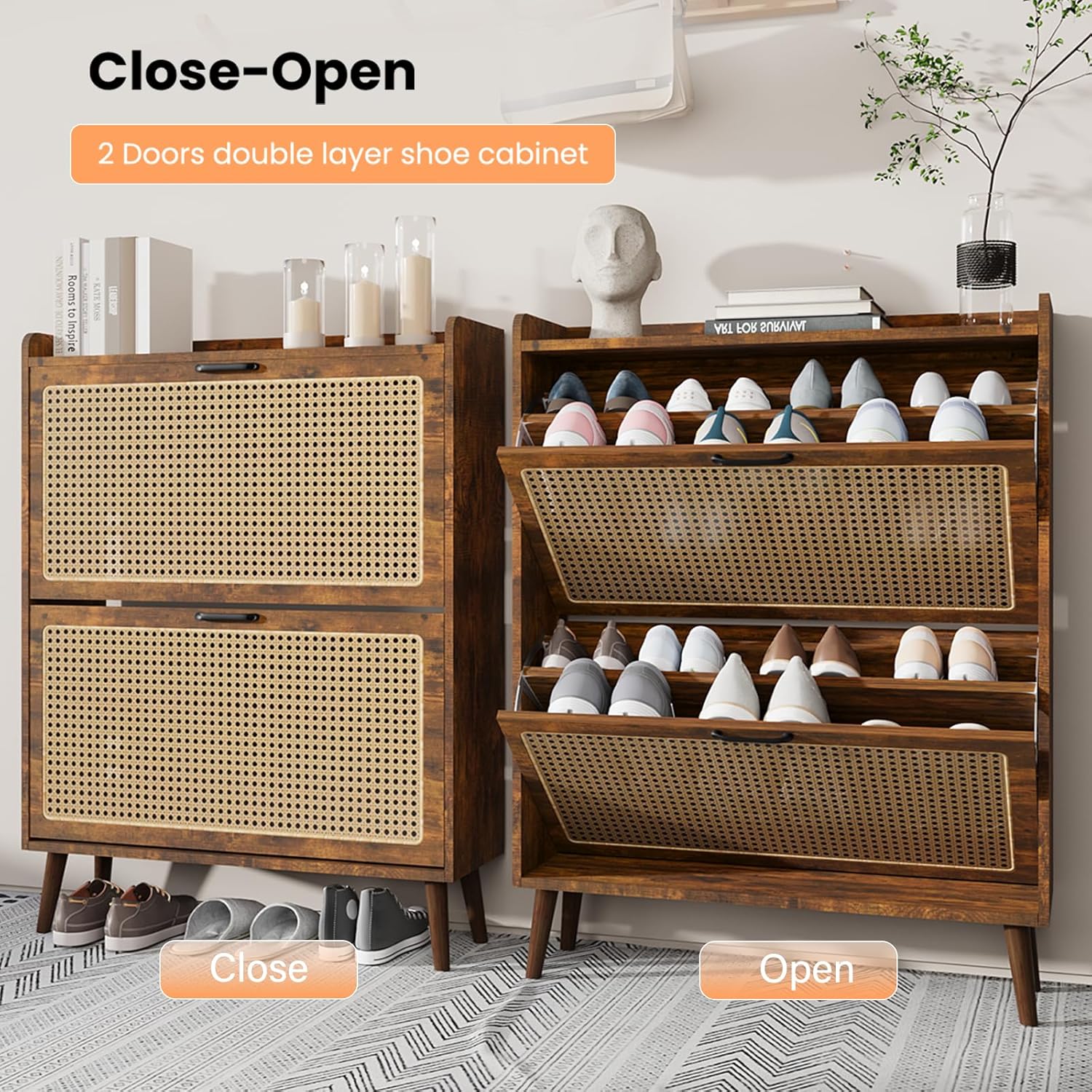 Shoe Cabinet Storage Entryway: Narrow 2 Tier Flip Drawer Shoe Storage for Hallway and Entrance - Rattan Slim Organizer with Walnut Wooden Legs & Mental Handles
