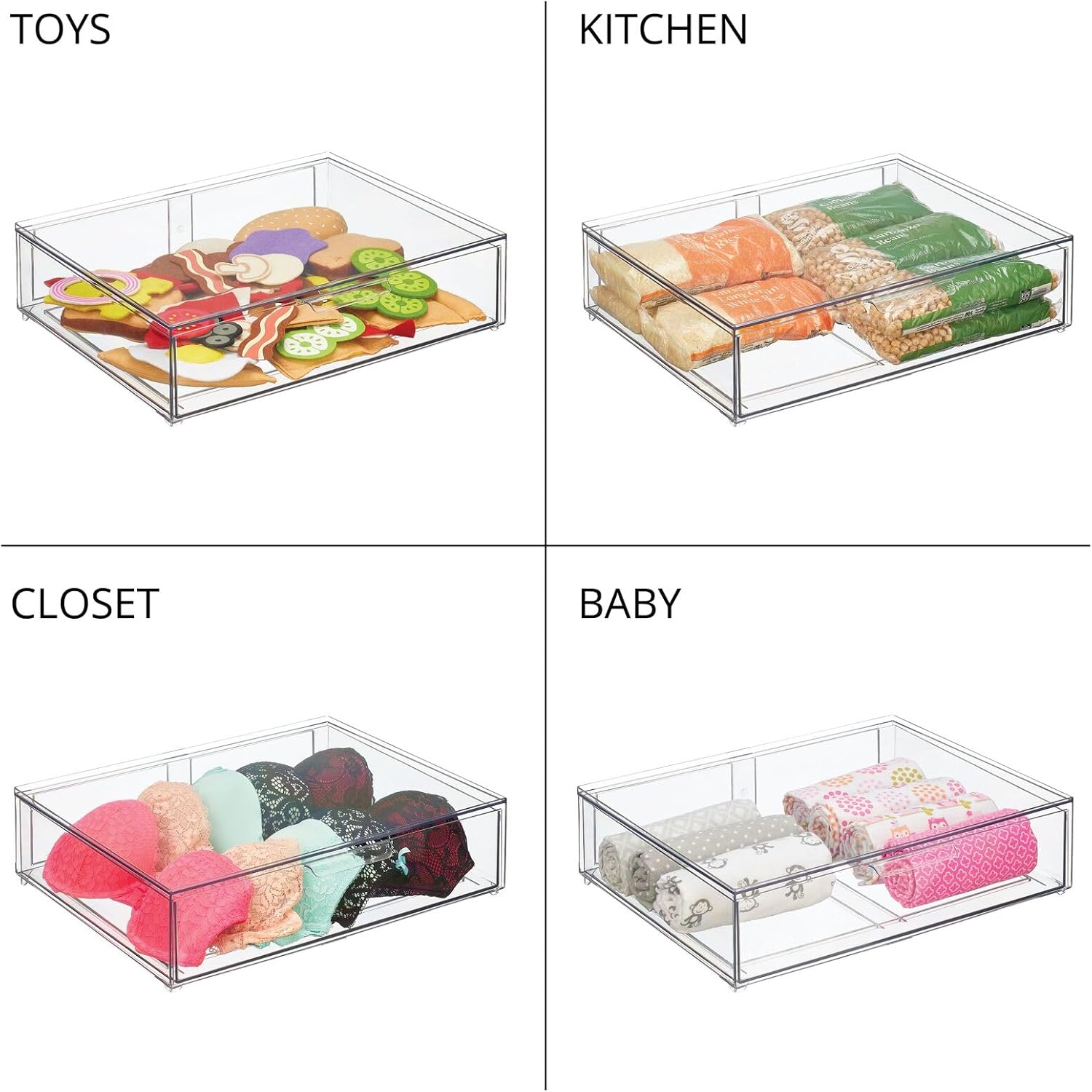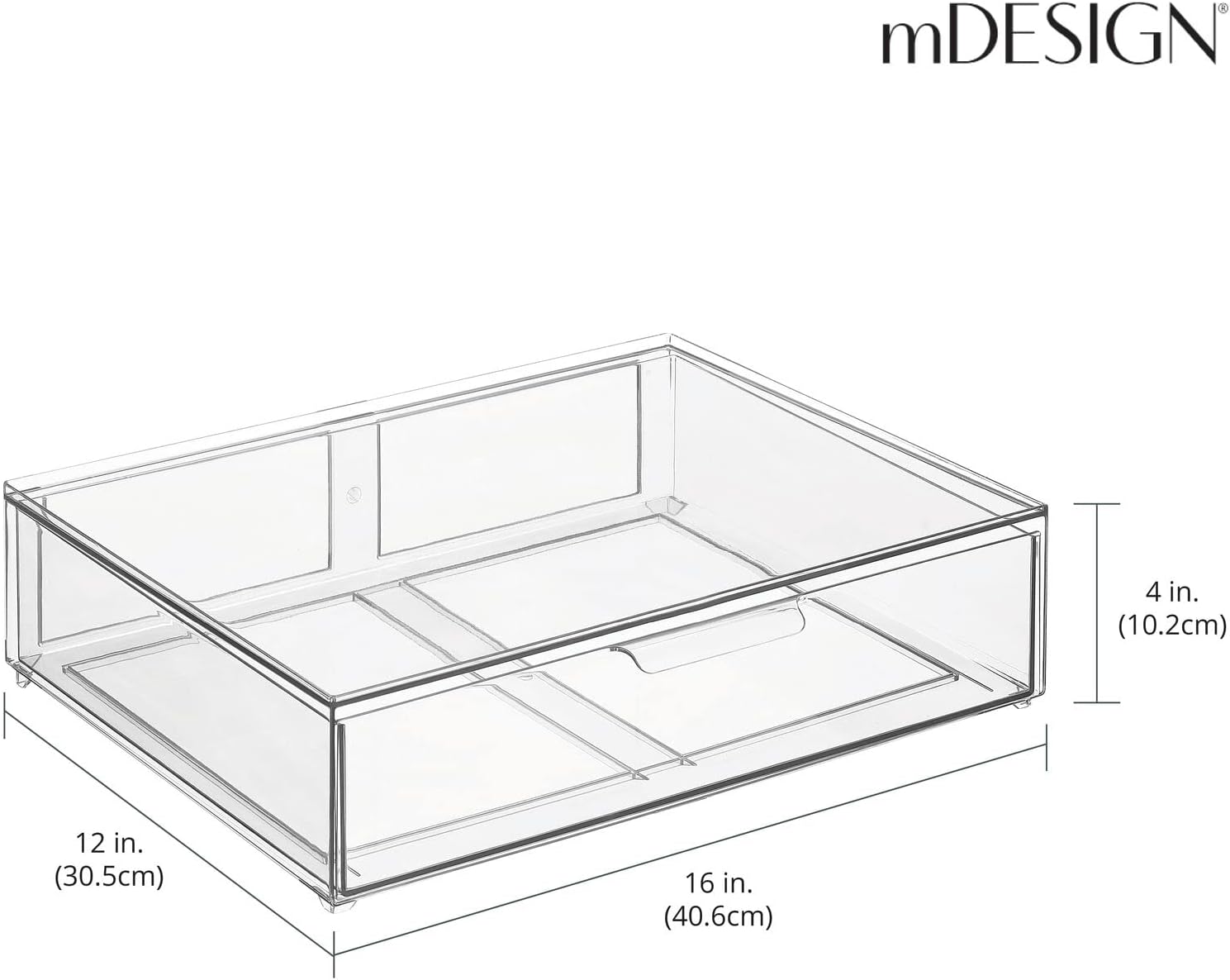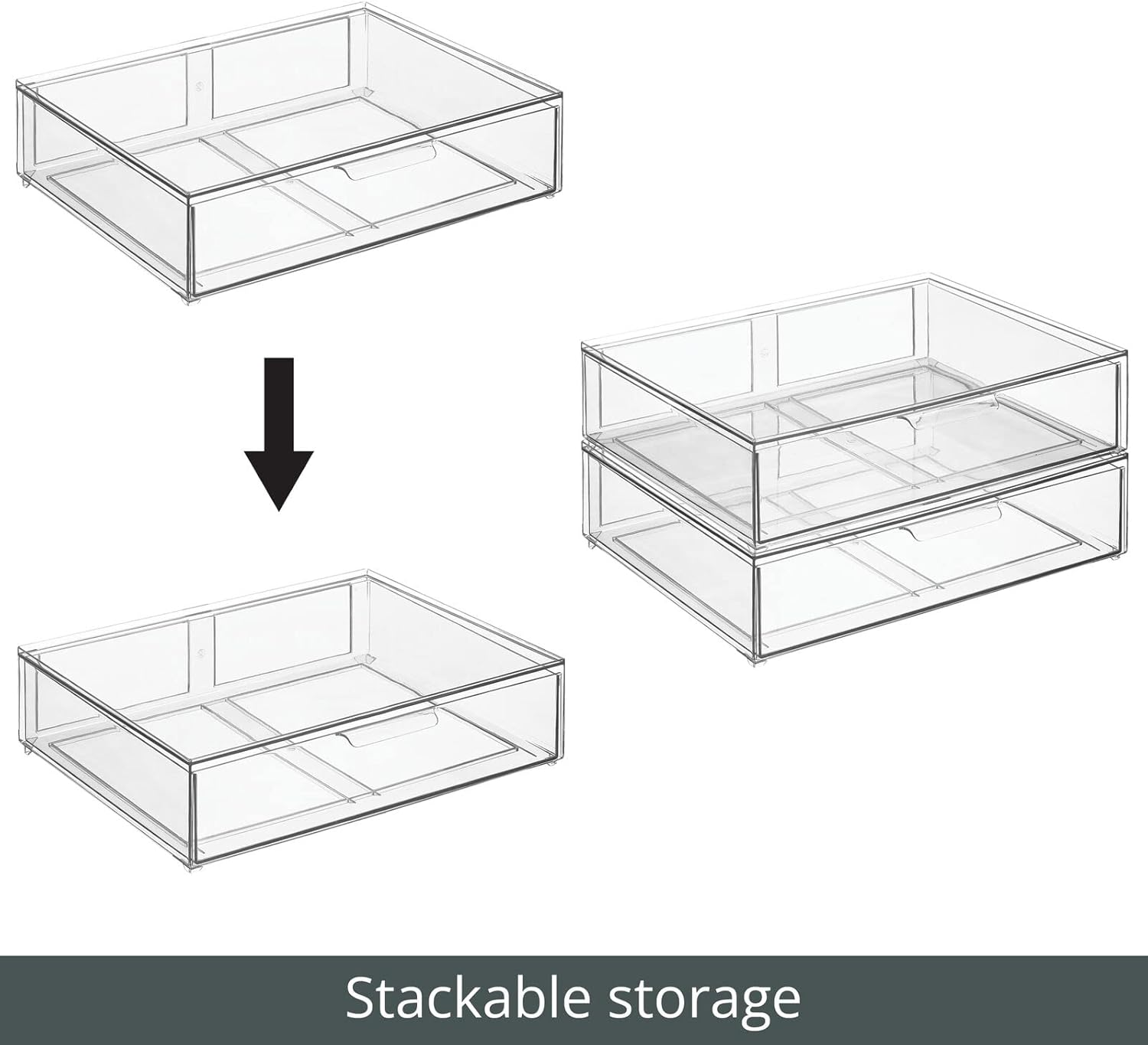 mDesign Wide Plastic Stackable Closet Storage Organizer Bins with Front Pull Out Drawer for Cabinet, Desk, Shelf, Cupboard, Vanity or Dresser Organization - Lumiere Collection - 4 Pack - Clear